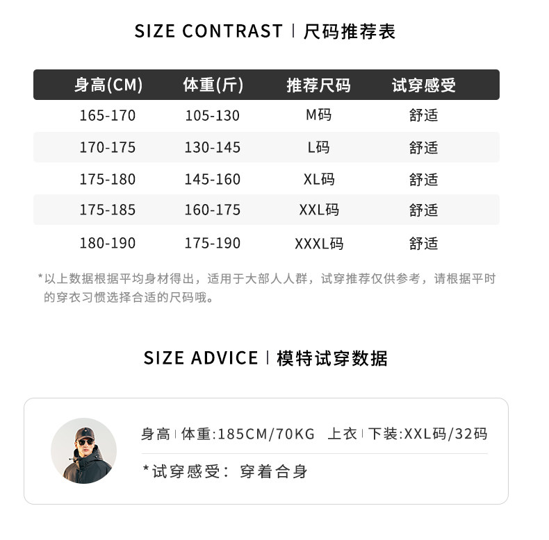 China (cm) 165 / 88-90 170 / 96-98 175 / 108-110 180 / 118-122 185 / 126-130