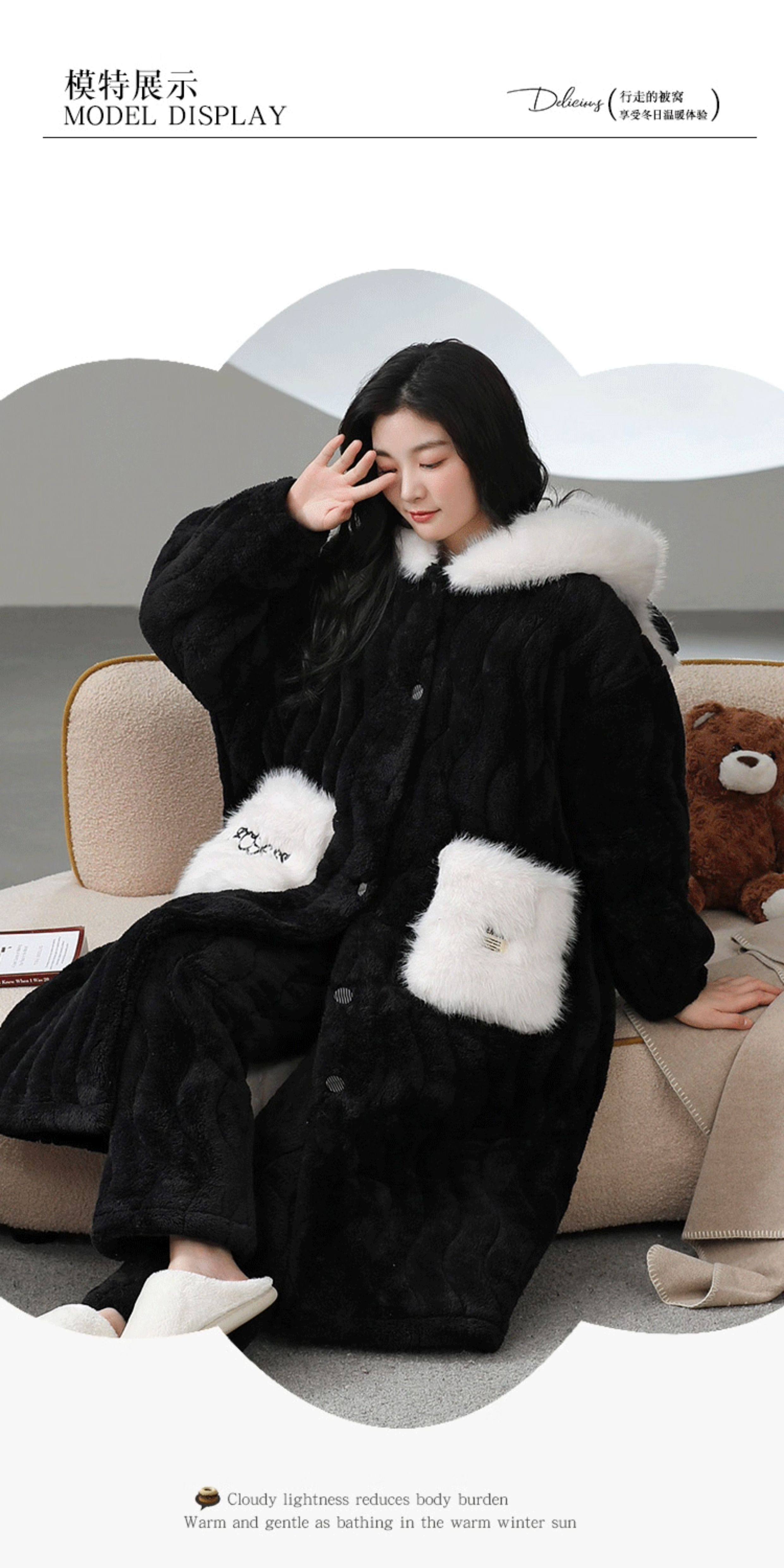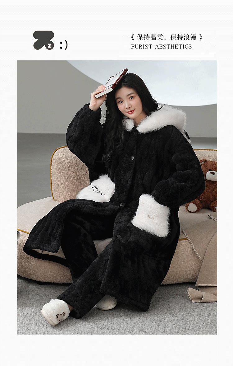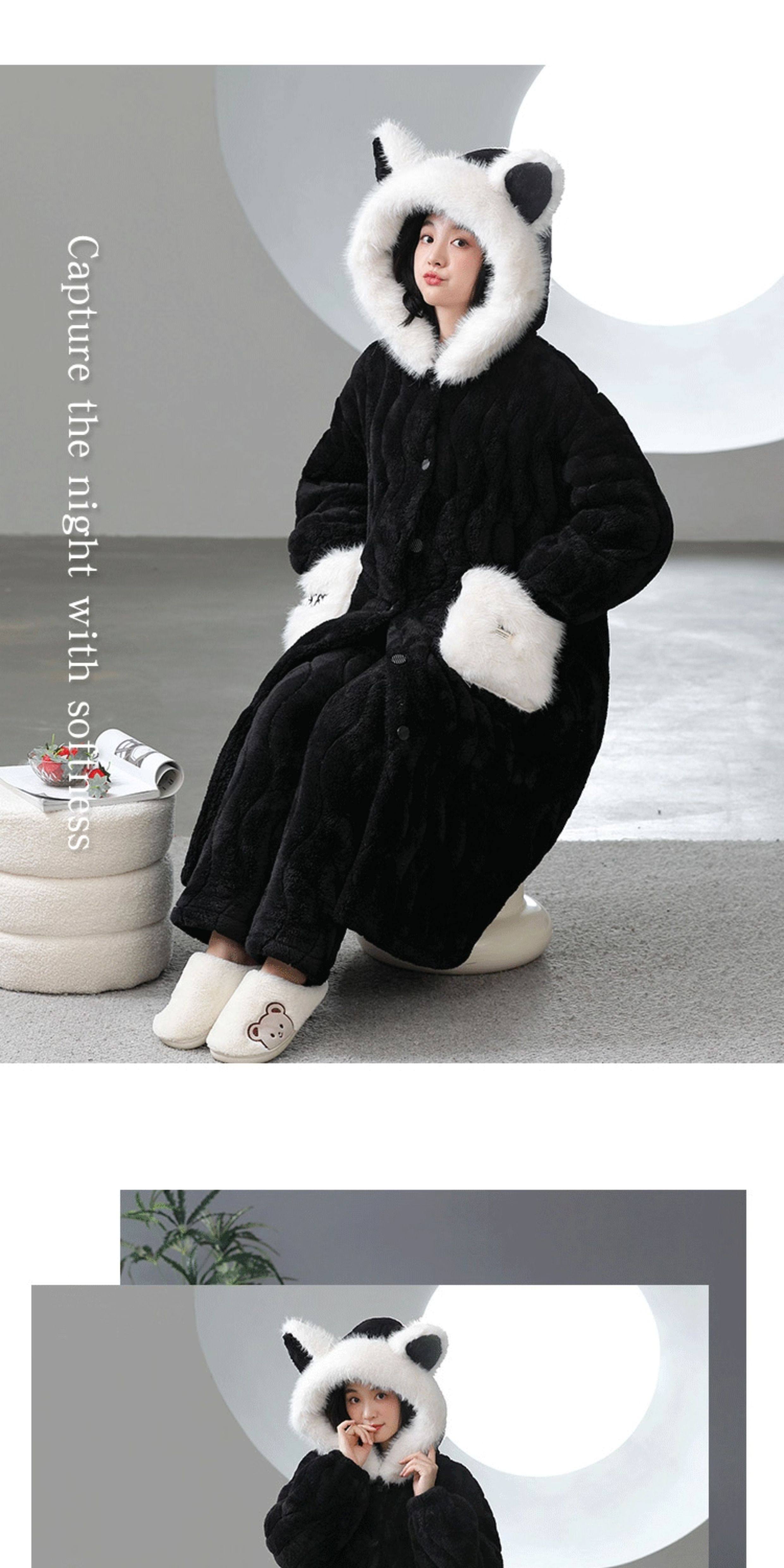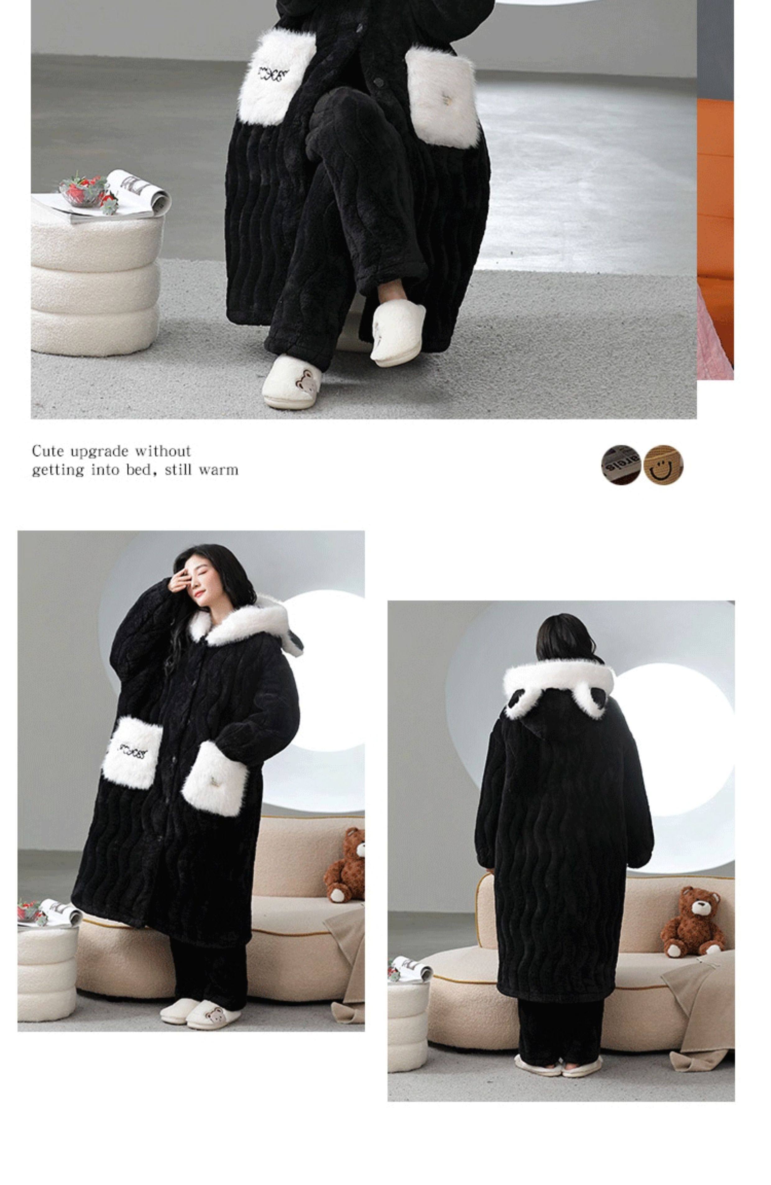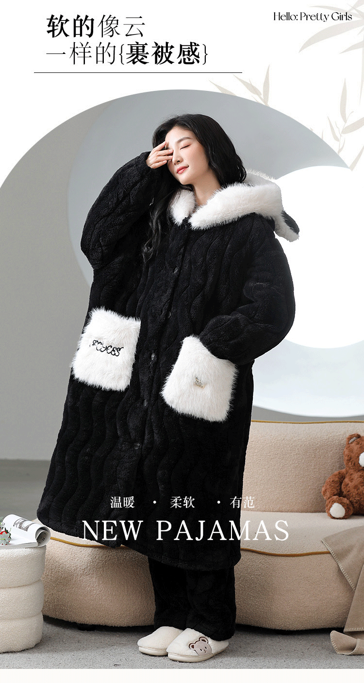 Catman Coral Fleece Nightgown for Women Autumn and Winter 2024 New Three-Layer Quilted Pajamas Thickened Warm Homewear Set