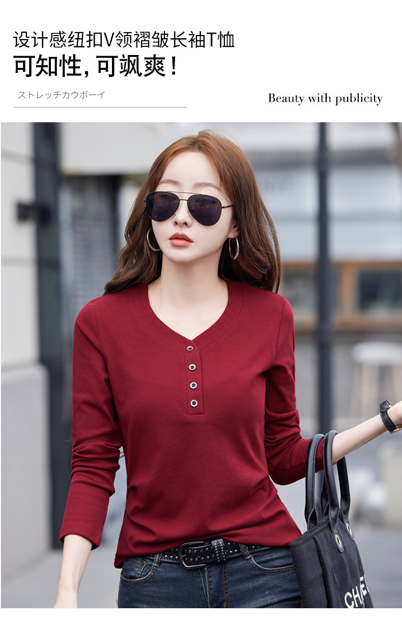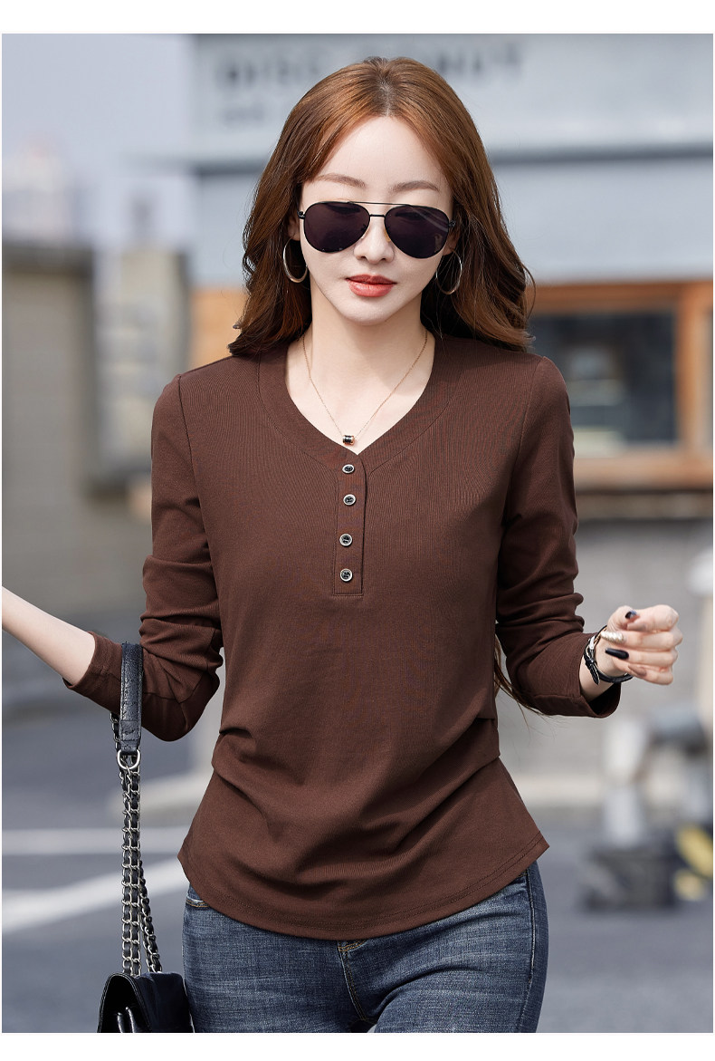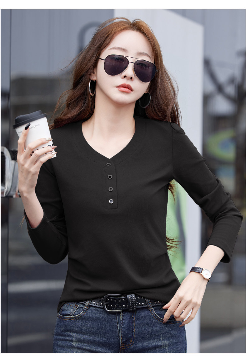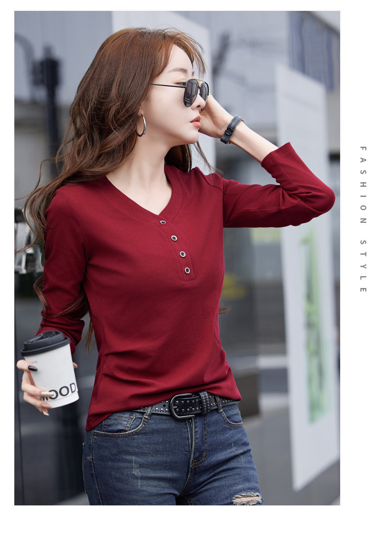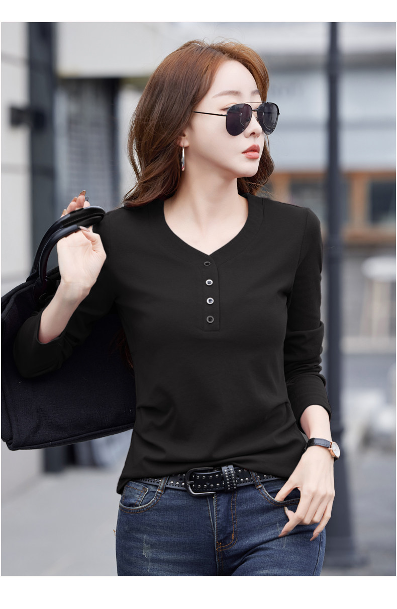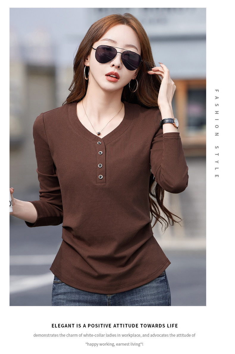 棉质V领纽扣长袖T恤女宽松2025早春季新款洋气休闲运动上衣打底衫