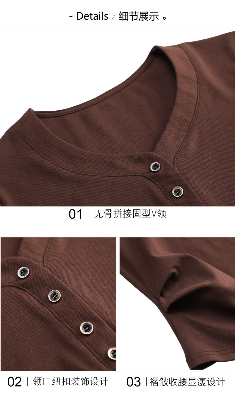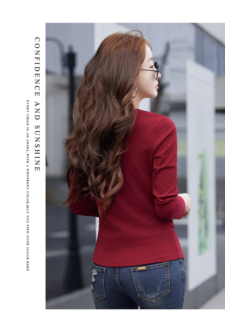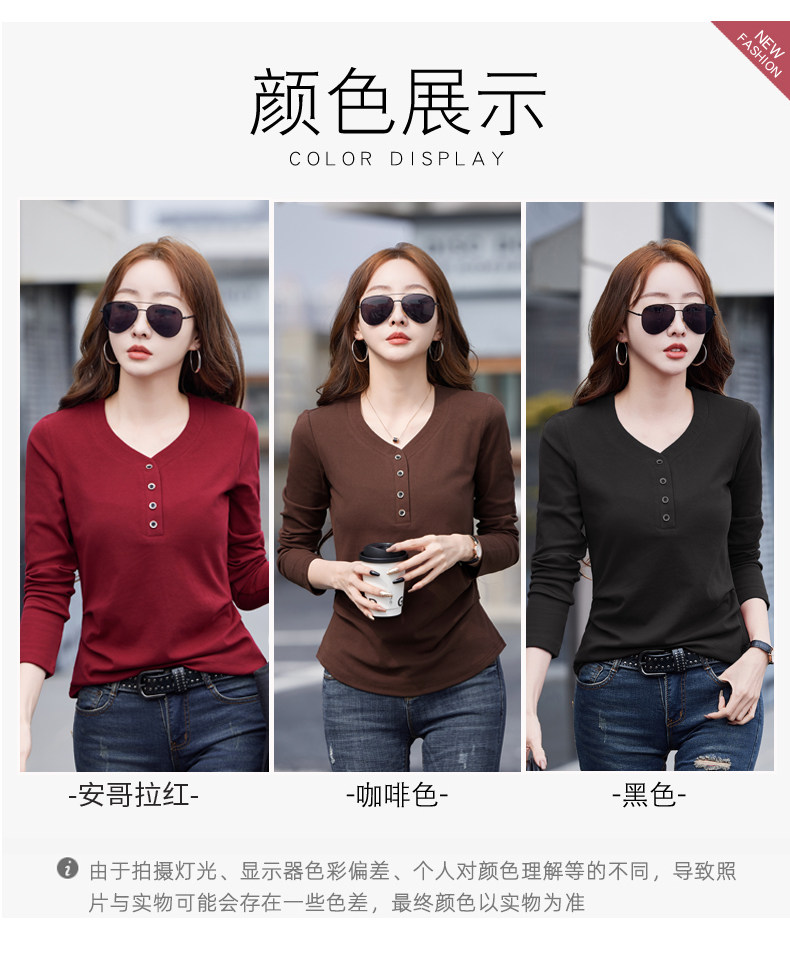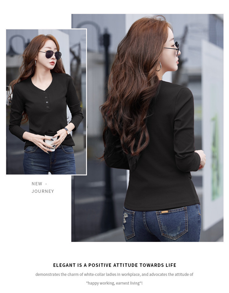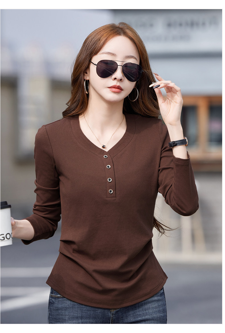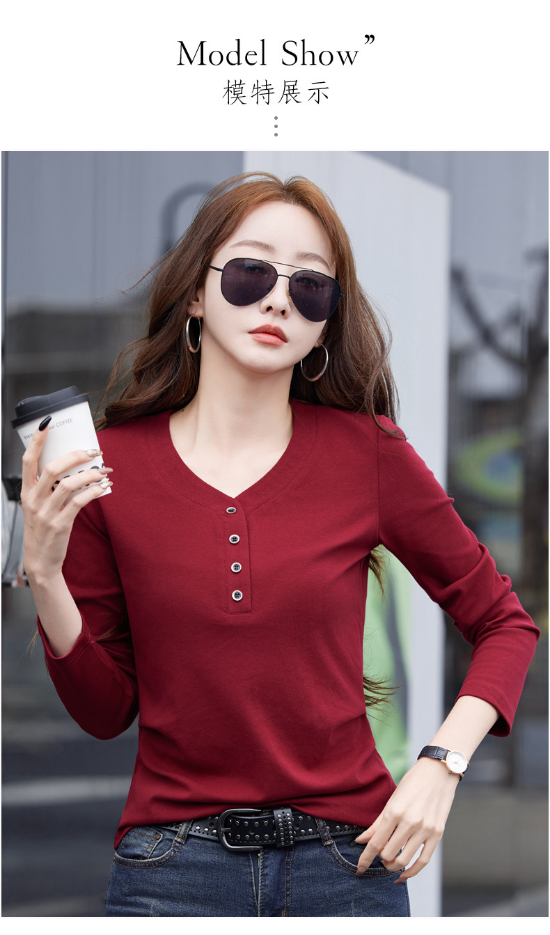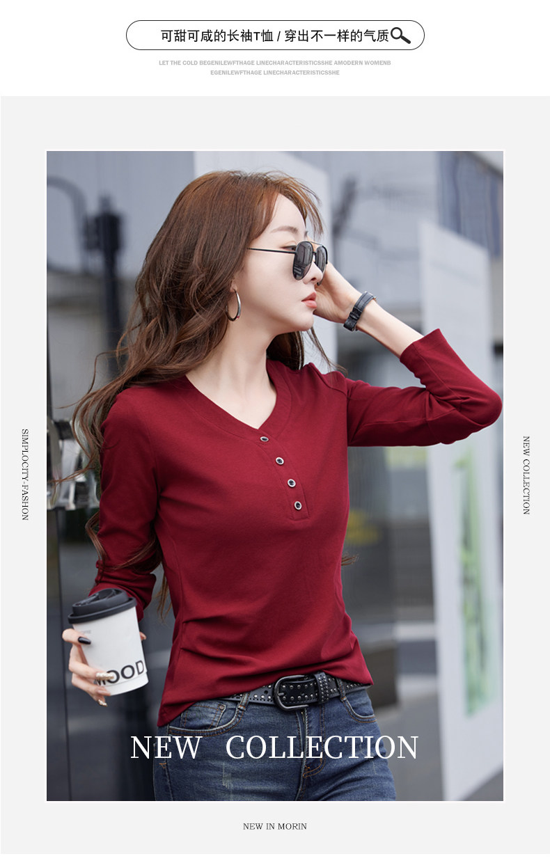 棉质V领纽扣长袖T恤女宽松2025早春季新款洋气休闲运动上衣打底衫
