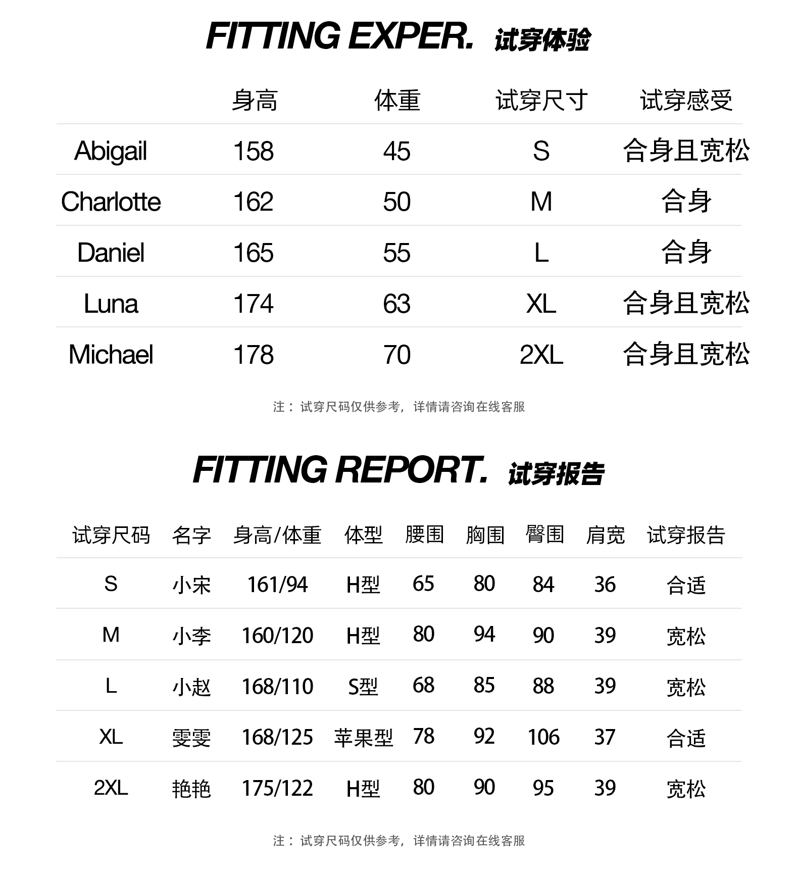 China (cm) 160-165/84-86 165-170 / 88-90 167-172 / 92-96 168-173 / 98-102 170-176 / 106-110