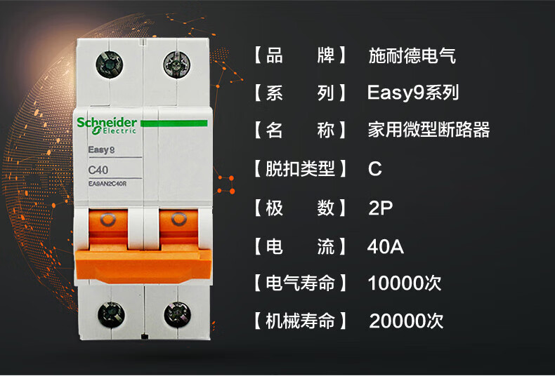 施耐德电气 空气开关 2P C40A 家用微型断路器双进双出总闸 空开 EA9AN2C40R