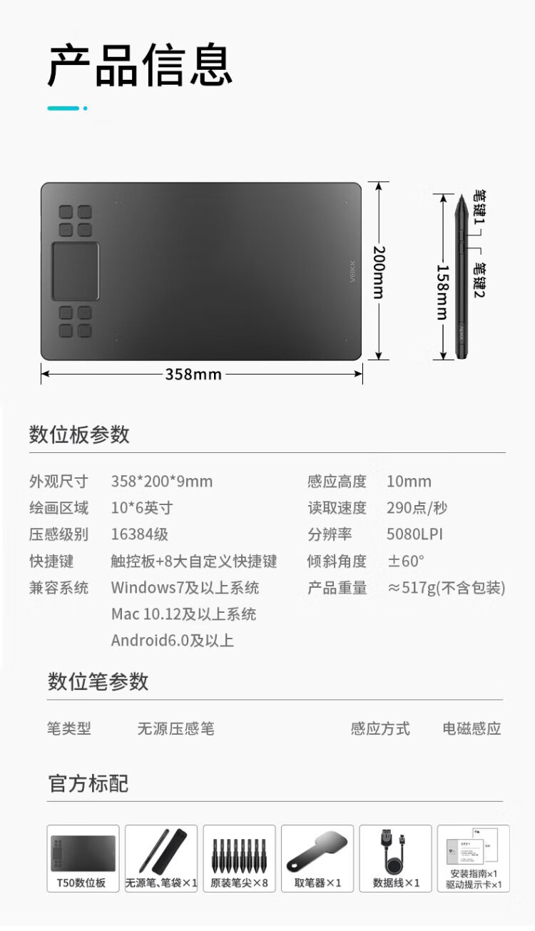 绘客(VEIKK)T50 数位板 手绘板智能绘图板(触控按键双操作 灵敏流畅 10英寸 可接手机)