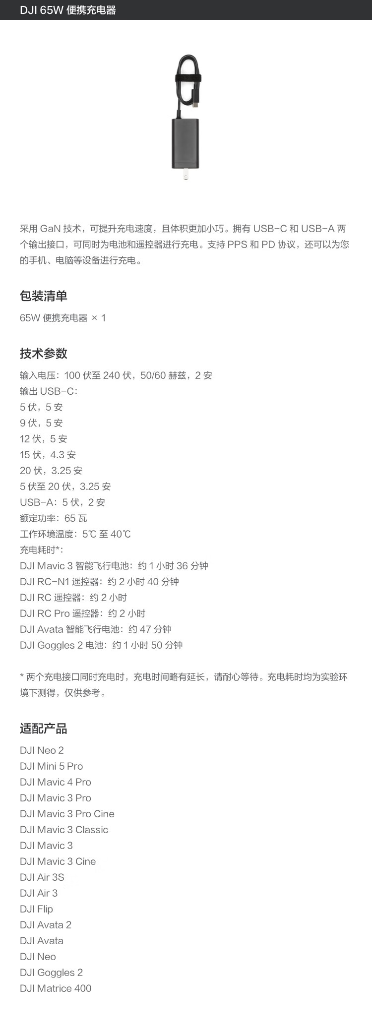 大疆 DJI 65W 便携充电器 Neo 2/Mini 5 Pro/Mavic4Pro/Air 系列/Mavic3系列/Flip/Goggles2/AVATA配件