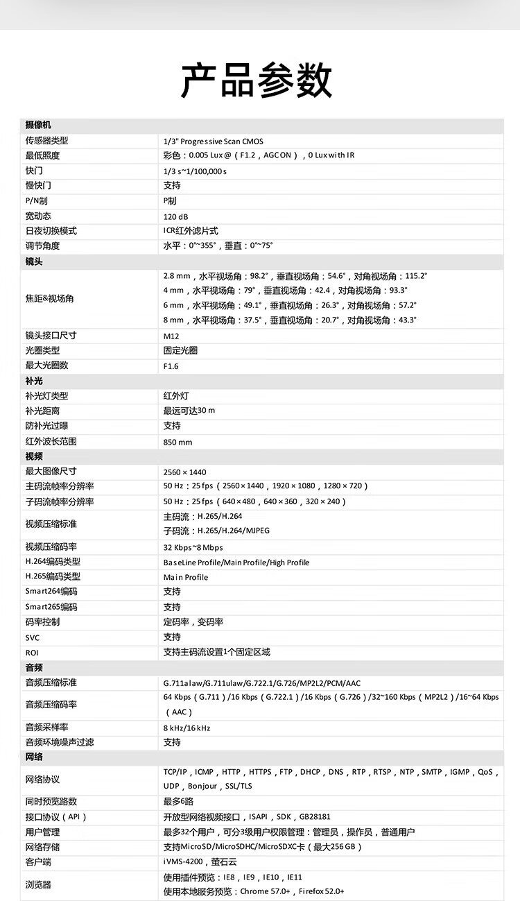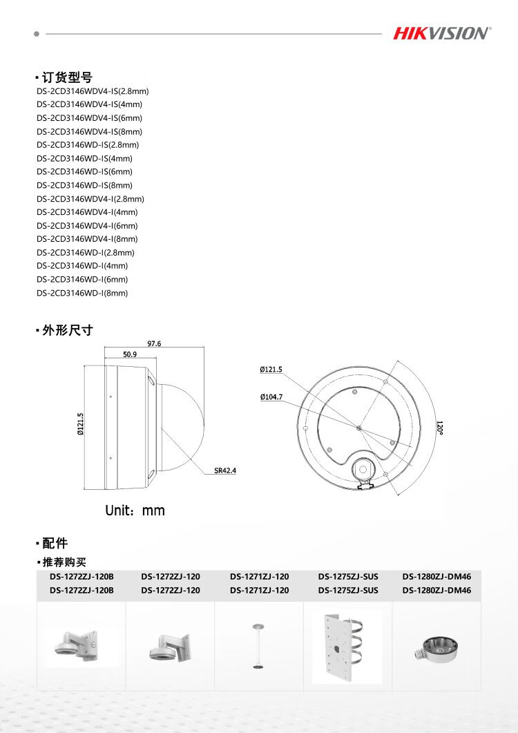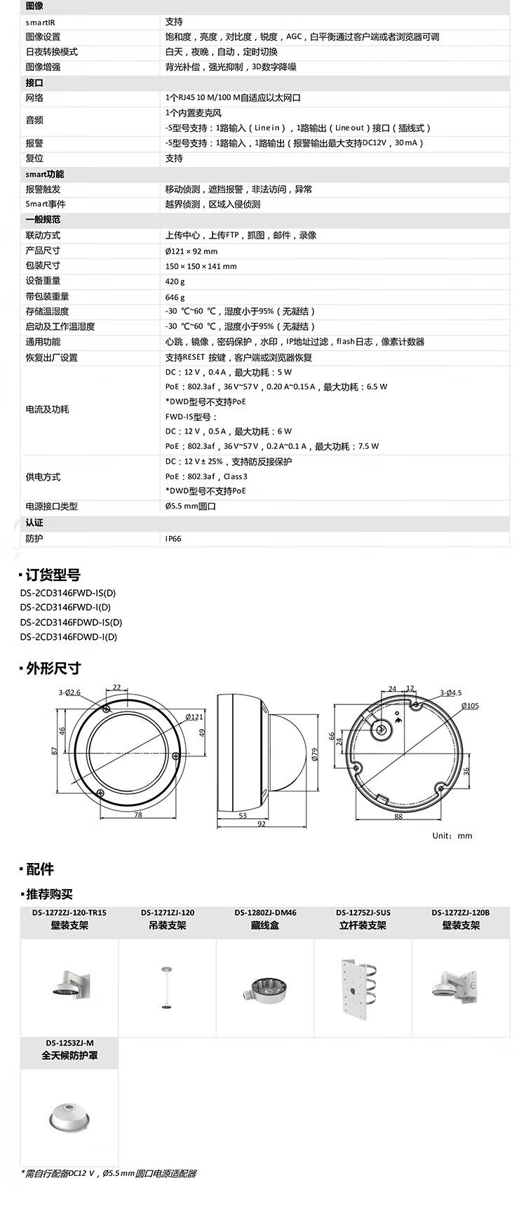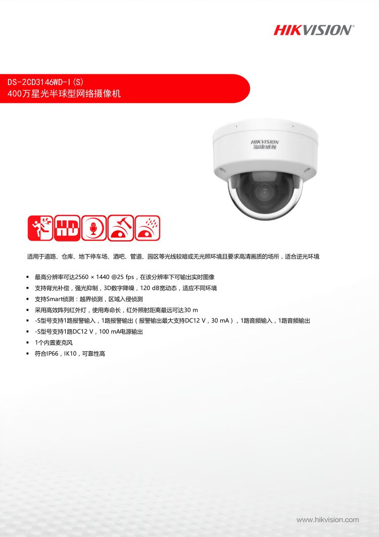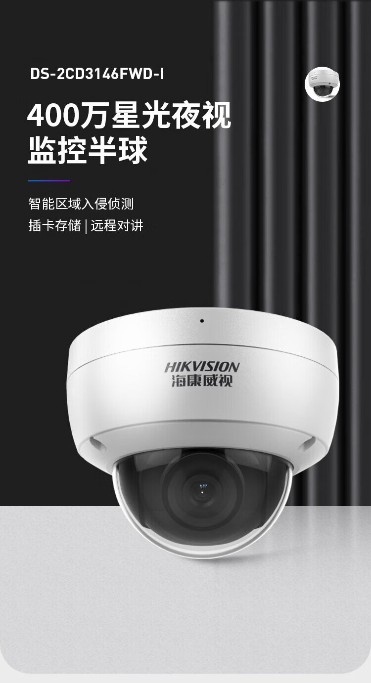 海康威视400万高清星光夜视拾音红外poe网络摄像机 2CD3146FWD-I/3146WD-I 2.8mm(固定半球新老型号随机)