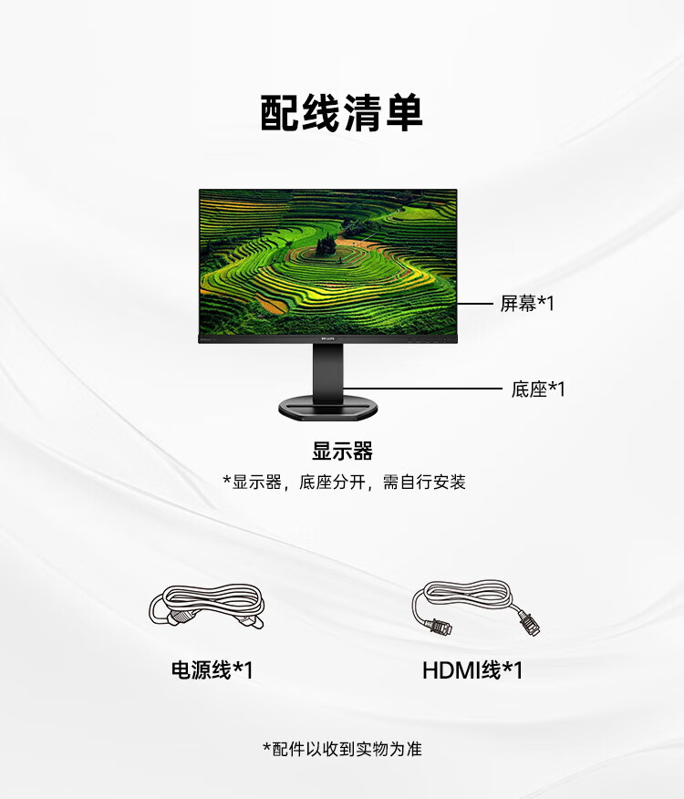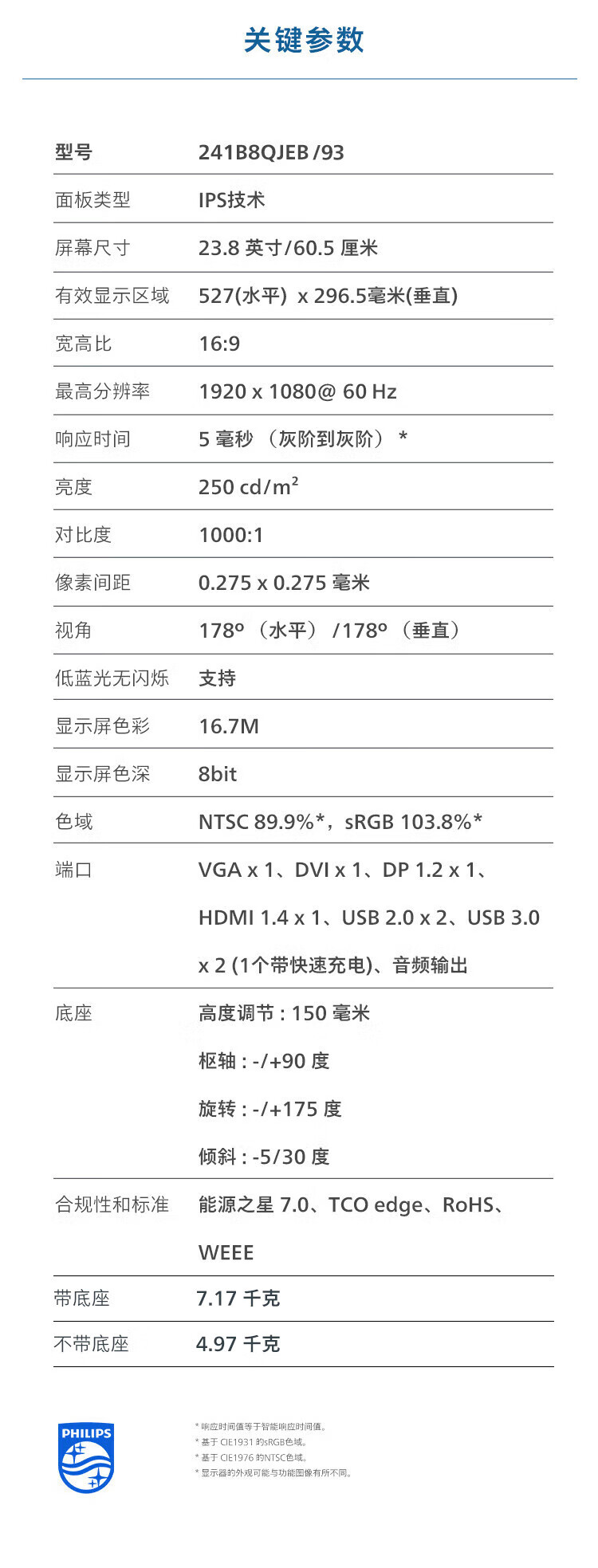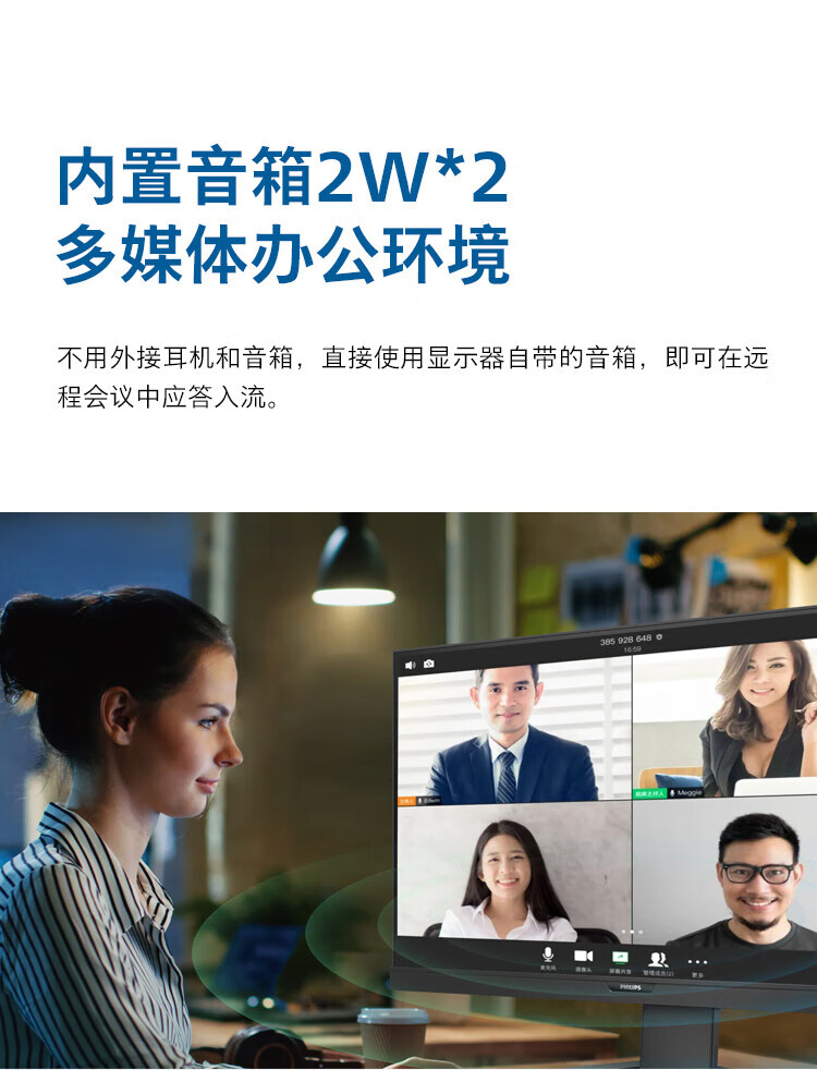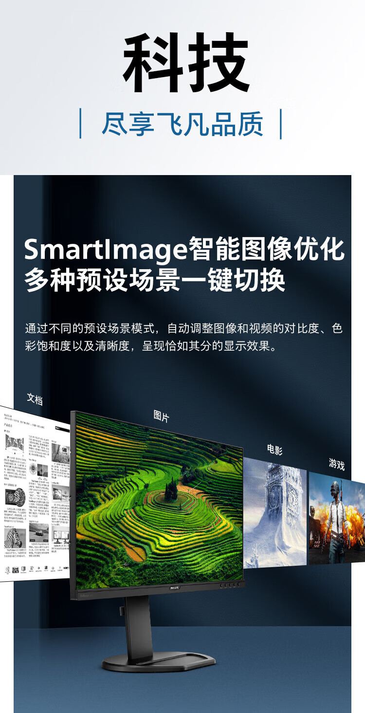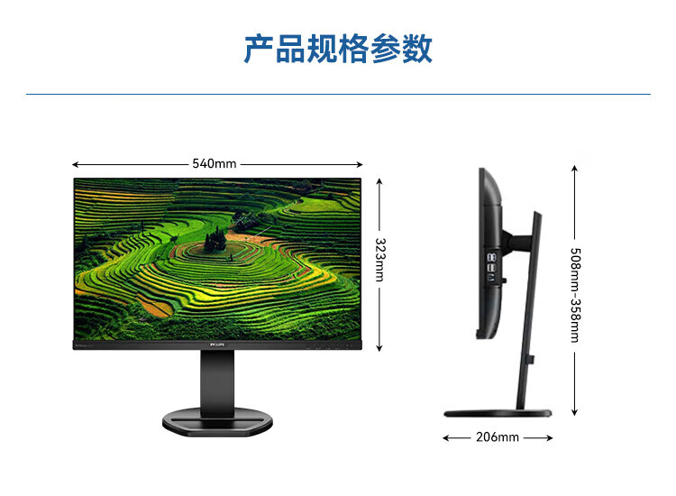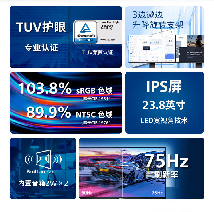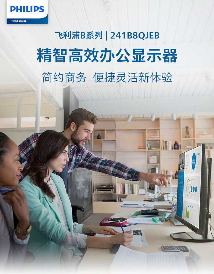 飞利浦(PHILIPS)23.8英寸 办公显示器 IPS高清 103.8%sRGB 内置音响 低蓝光 升降旋转 可壁挂 241B8QJEB/93