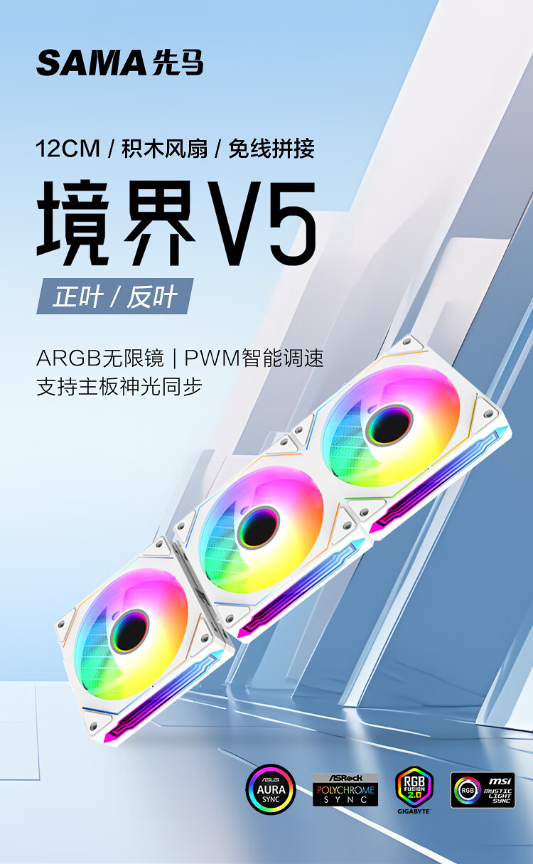 SAMA Realm V5 anti-blade single fan 3 white + 1 white power supply line building block fan/wireless splicing/ARGB infinite mirror/PWM speed regulation