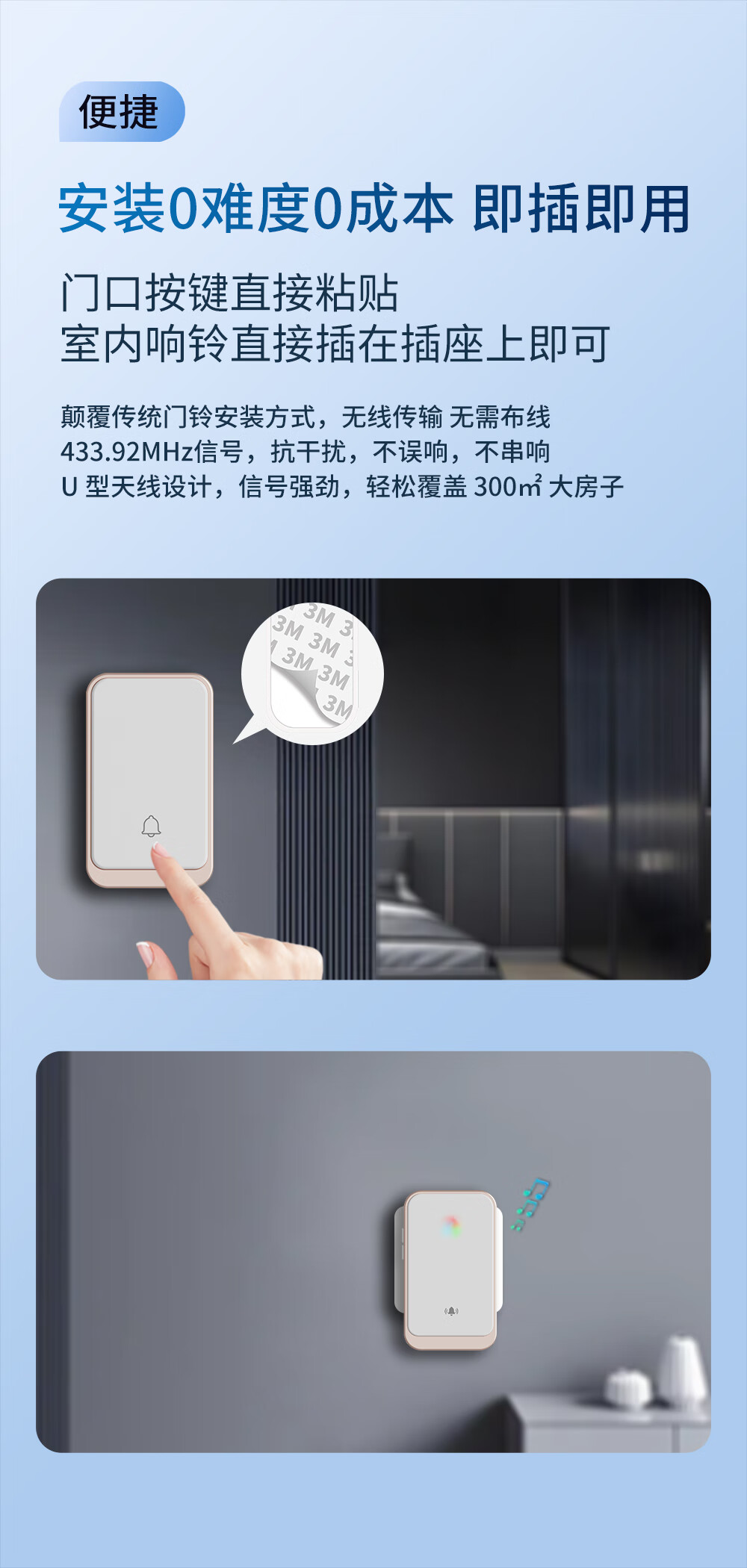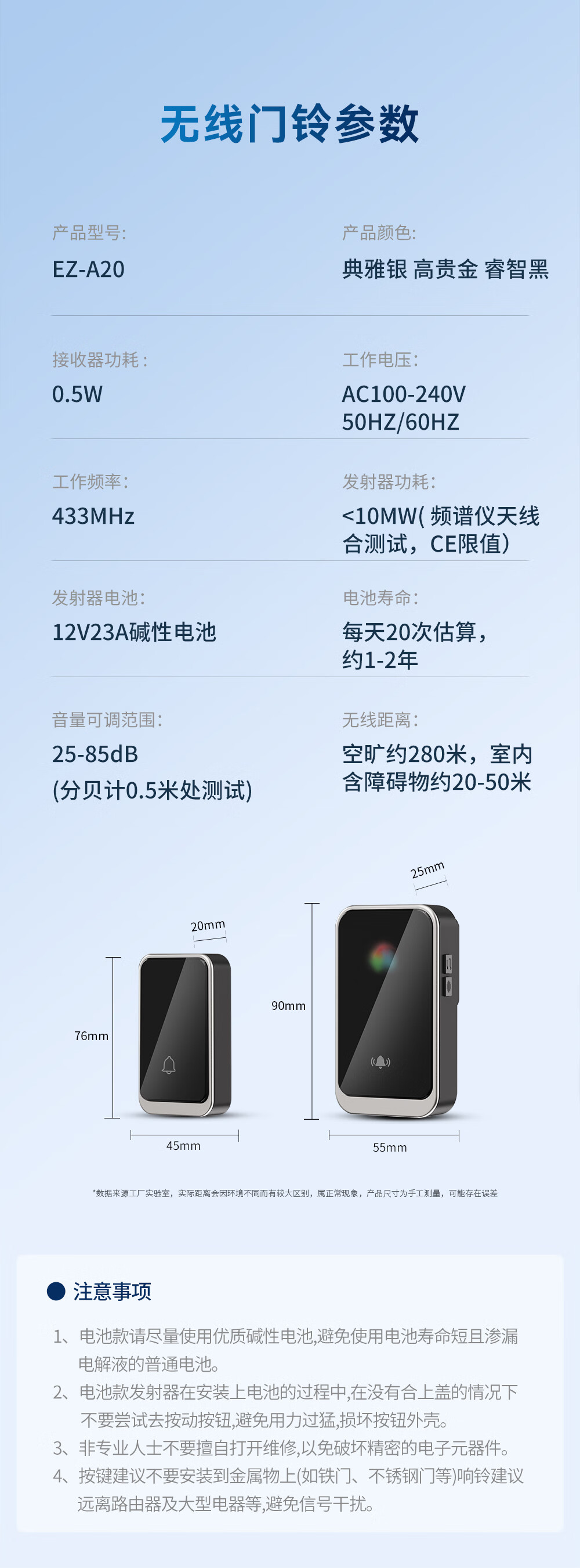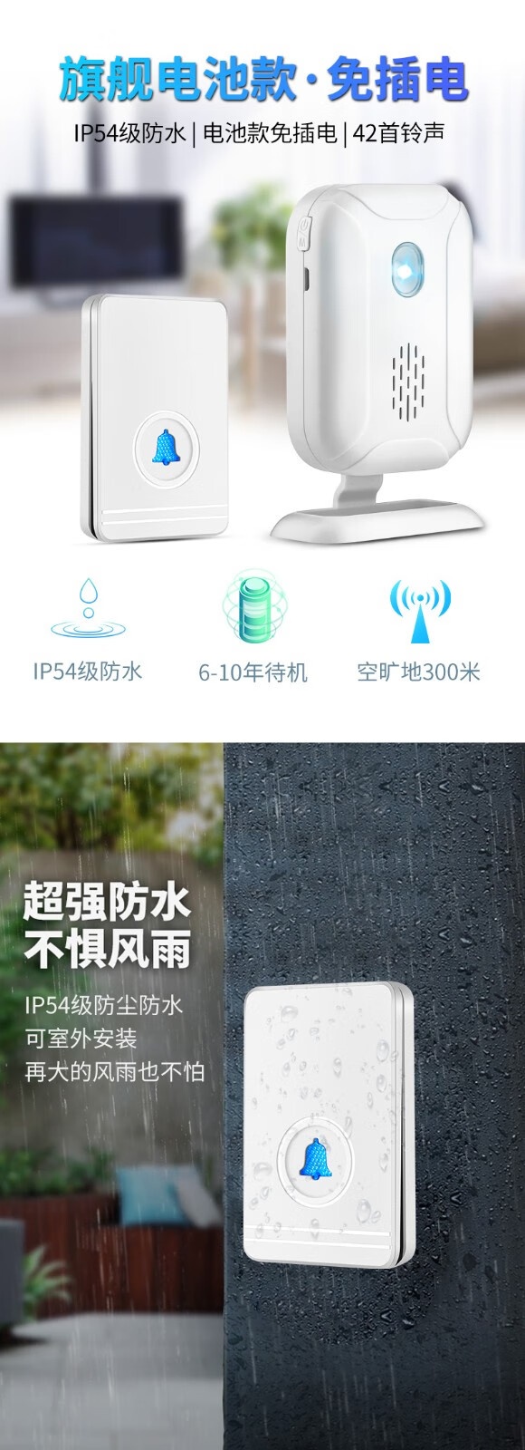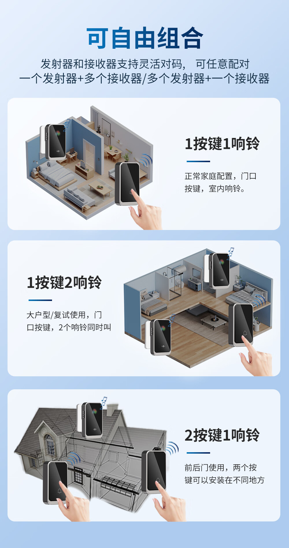 亦真A20门铃无线家用智能超远距离电子叮咚遥控门铃铛老人呼叫器防水 黑色【1个按键+1个响铃】