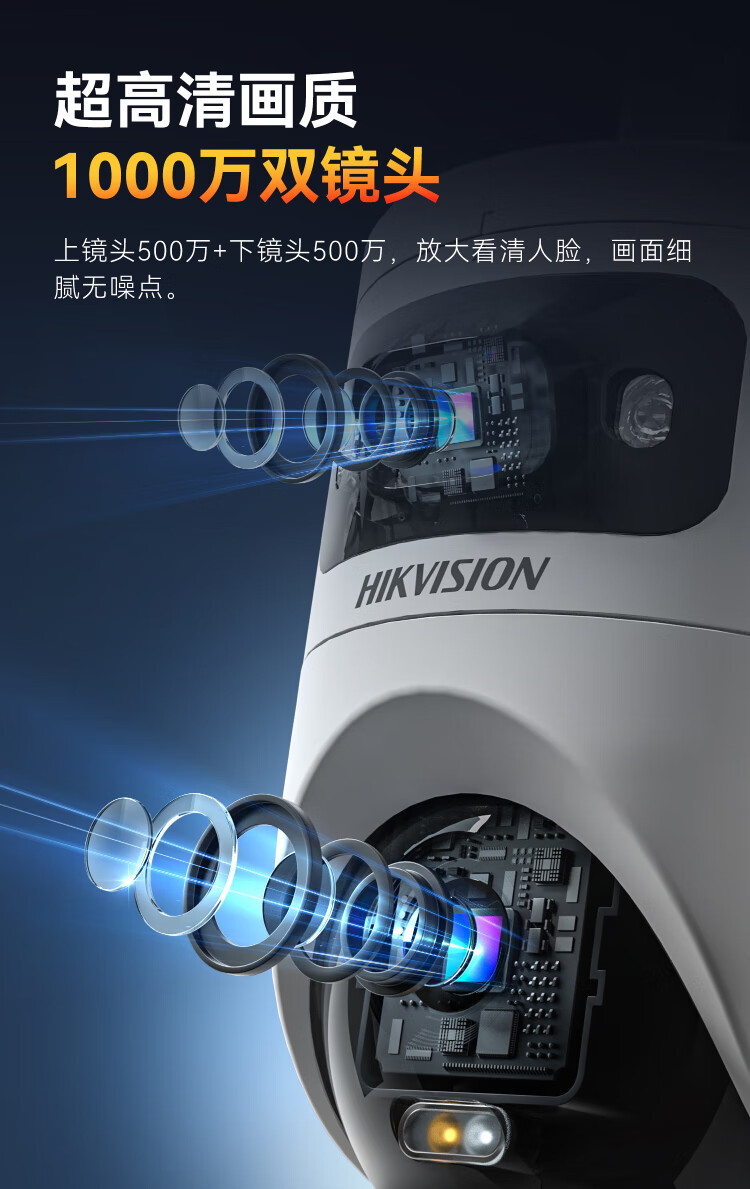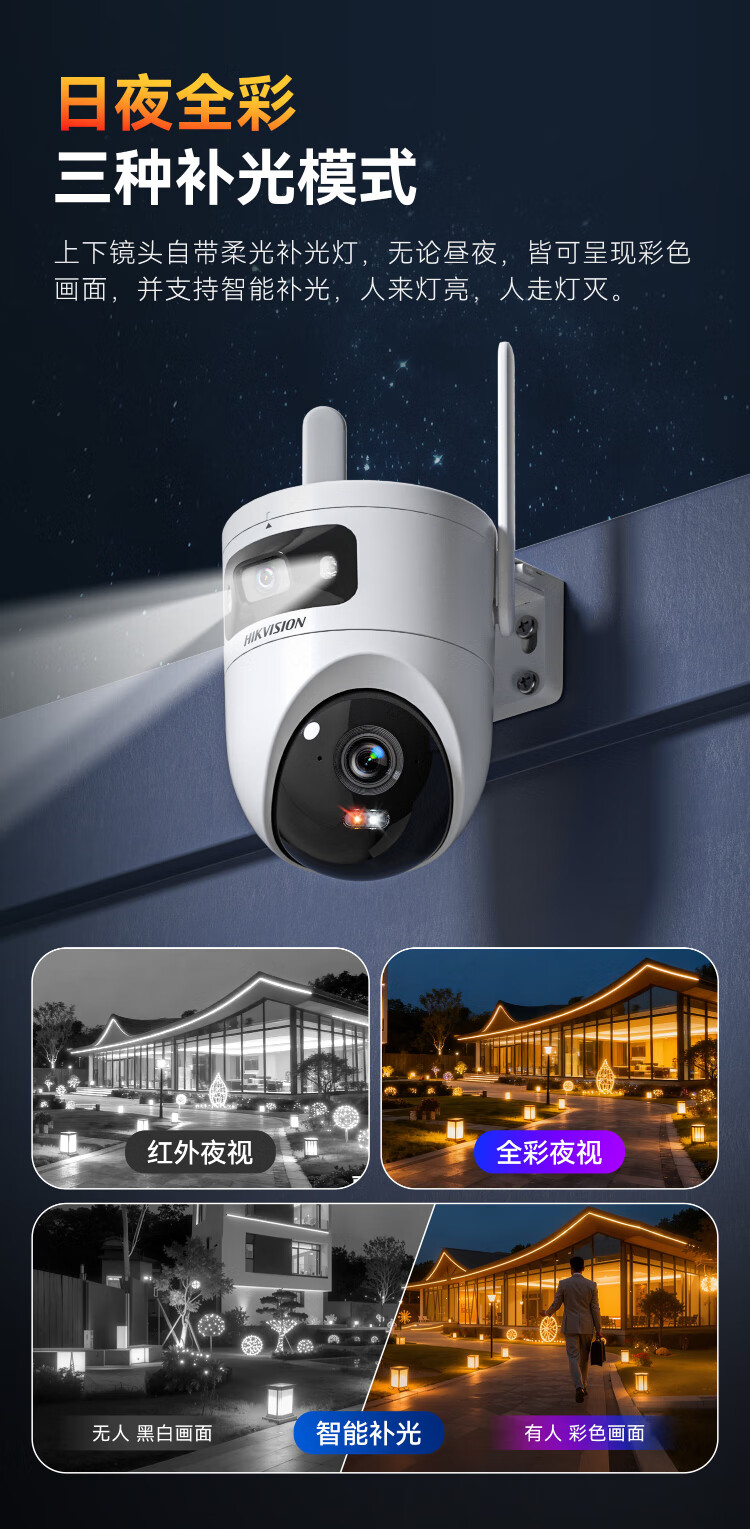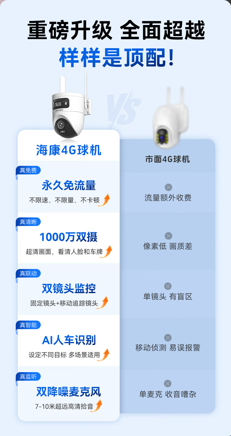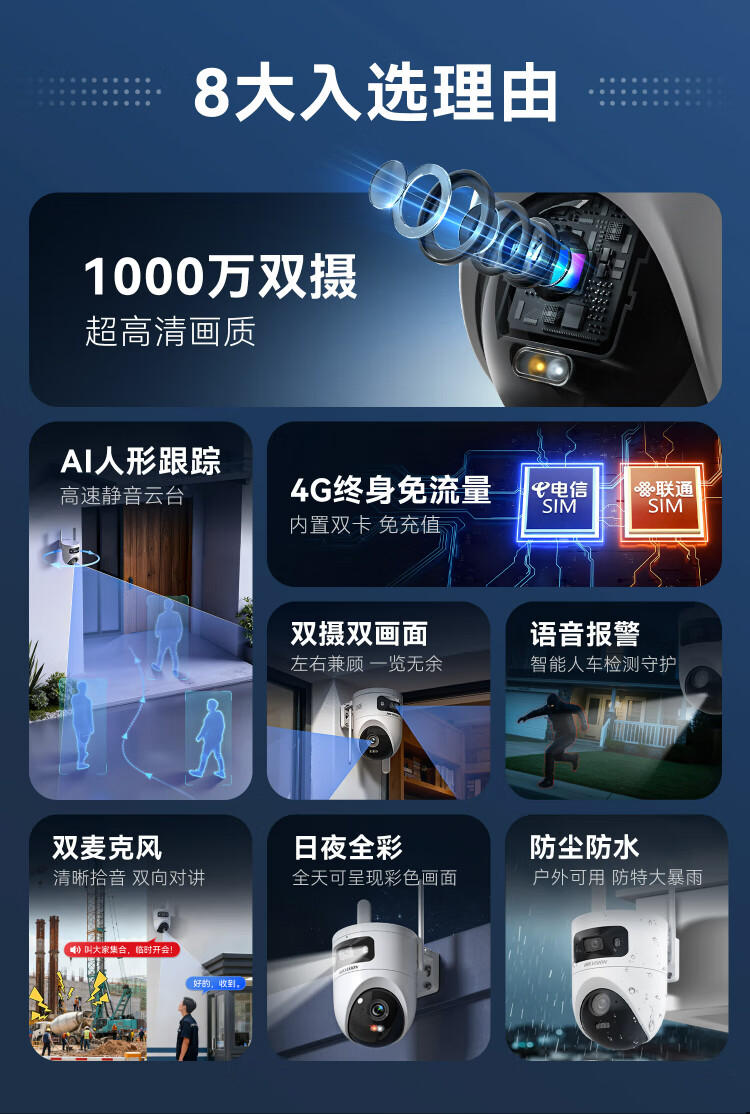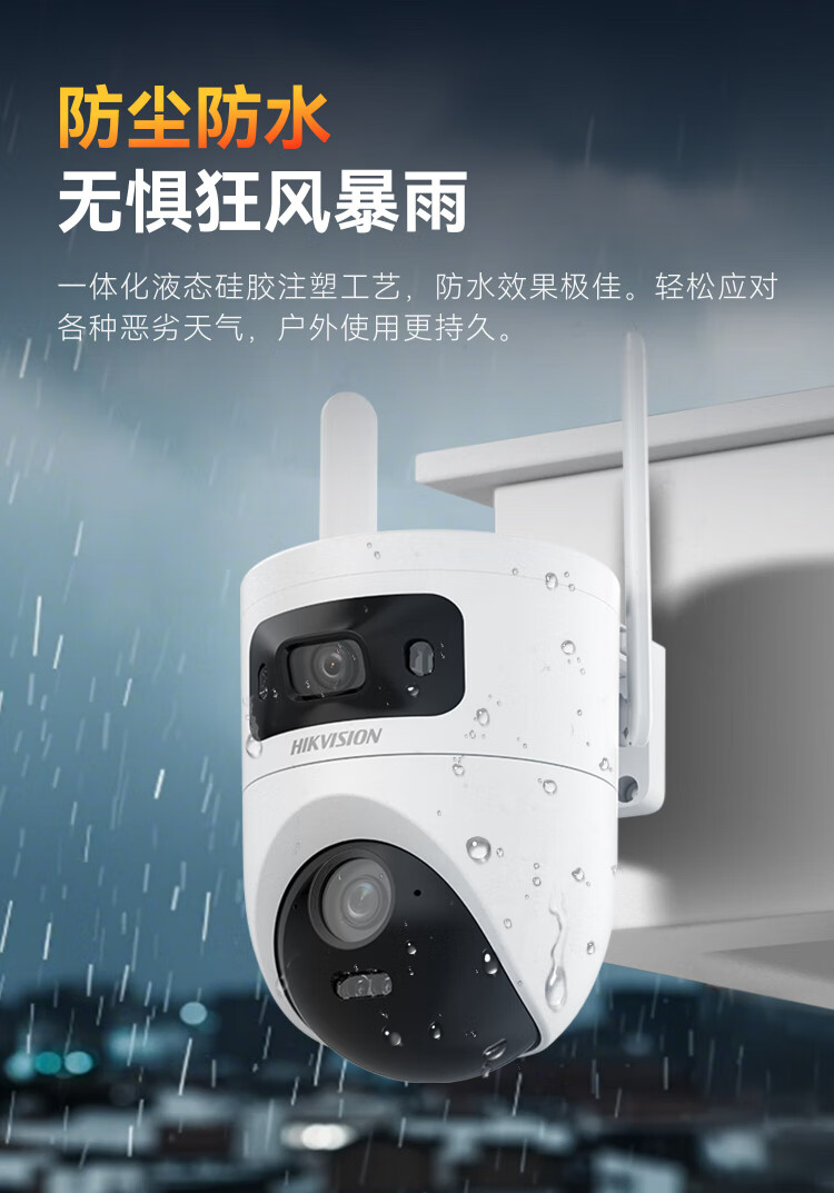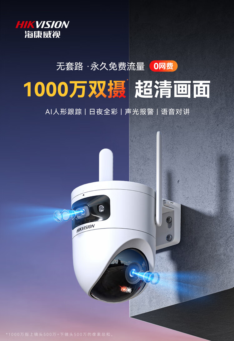 海康威视(HIKVISION)4G摄像头终身免流量1000万双镜头家用监控360度无死角带夜视 内置无限流量 室外户外防尘防水Q4P