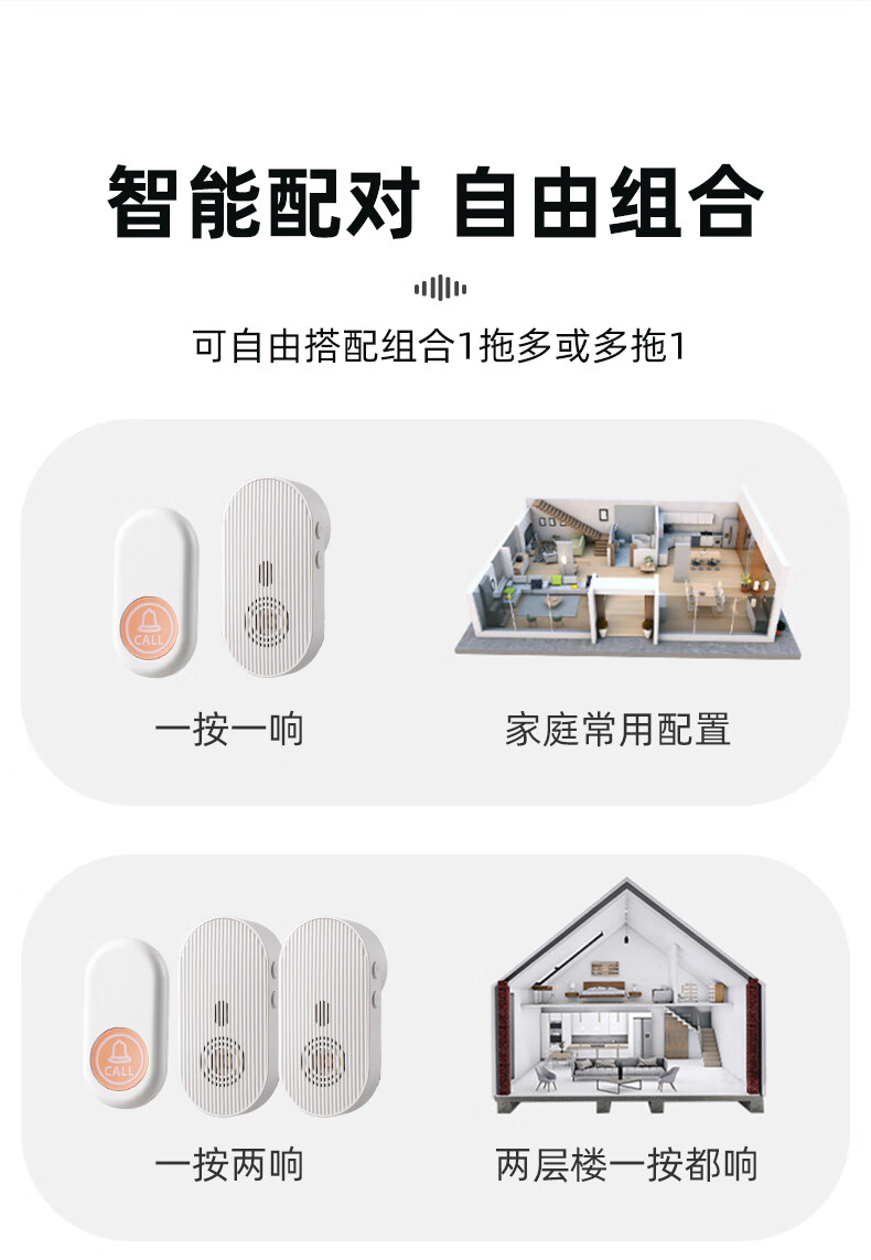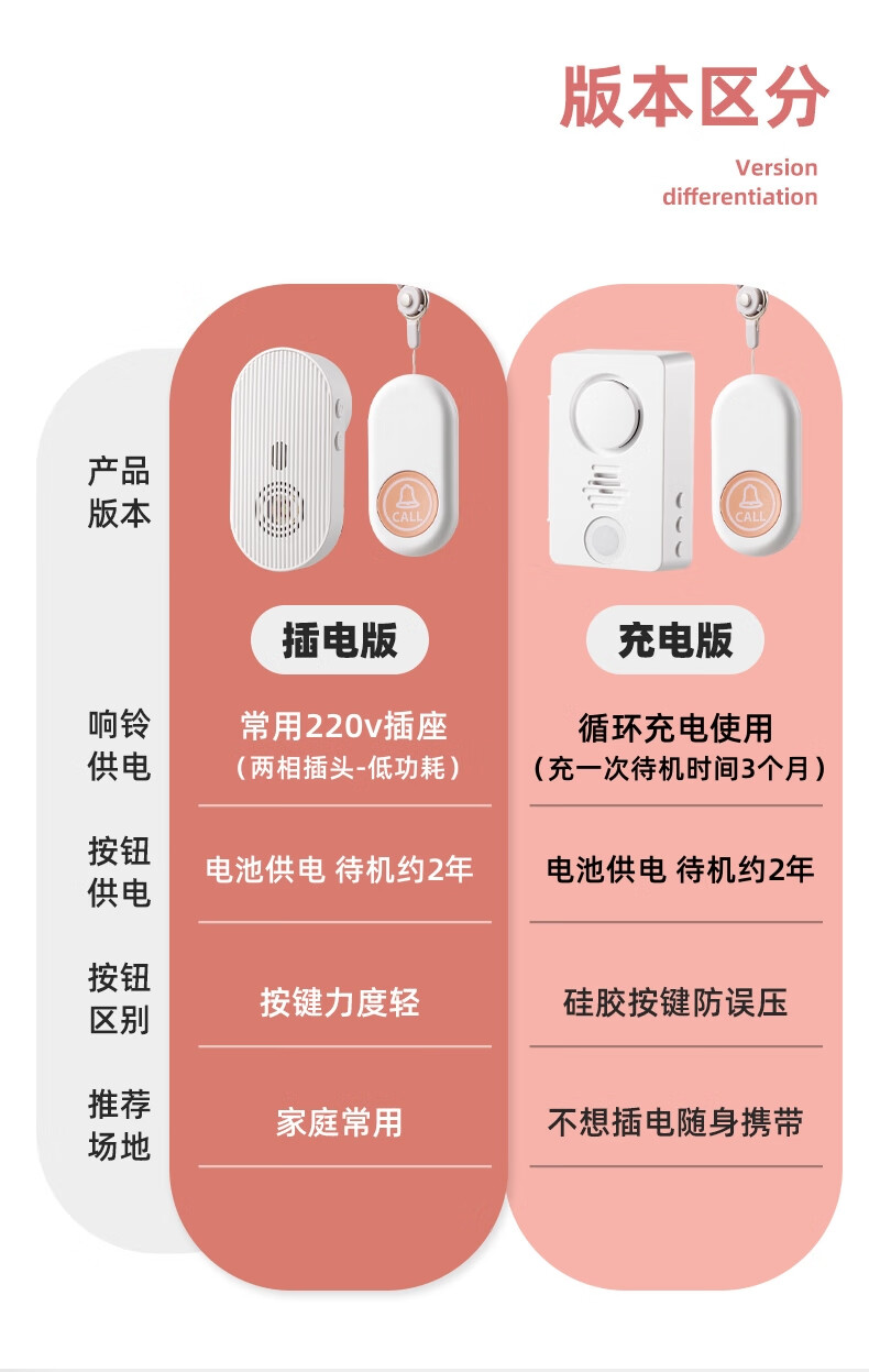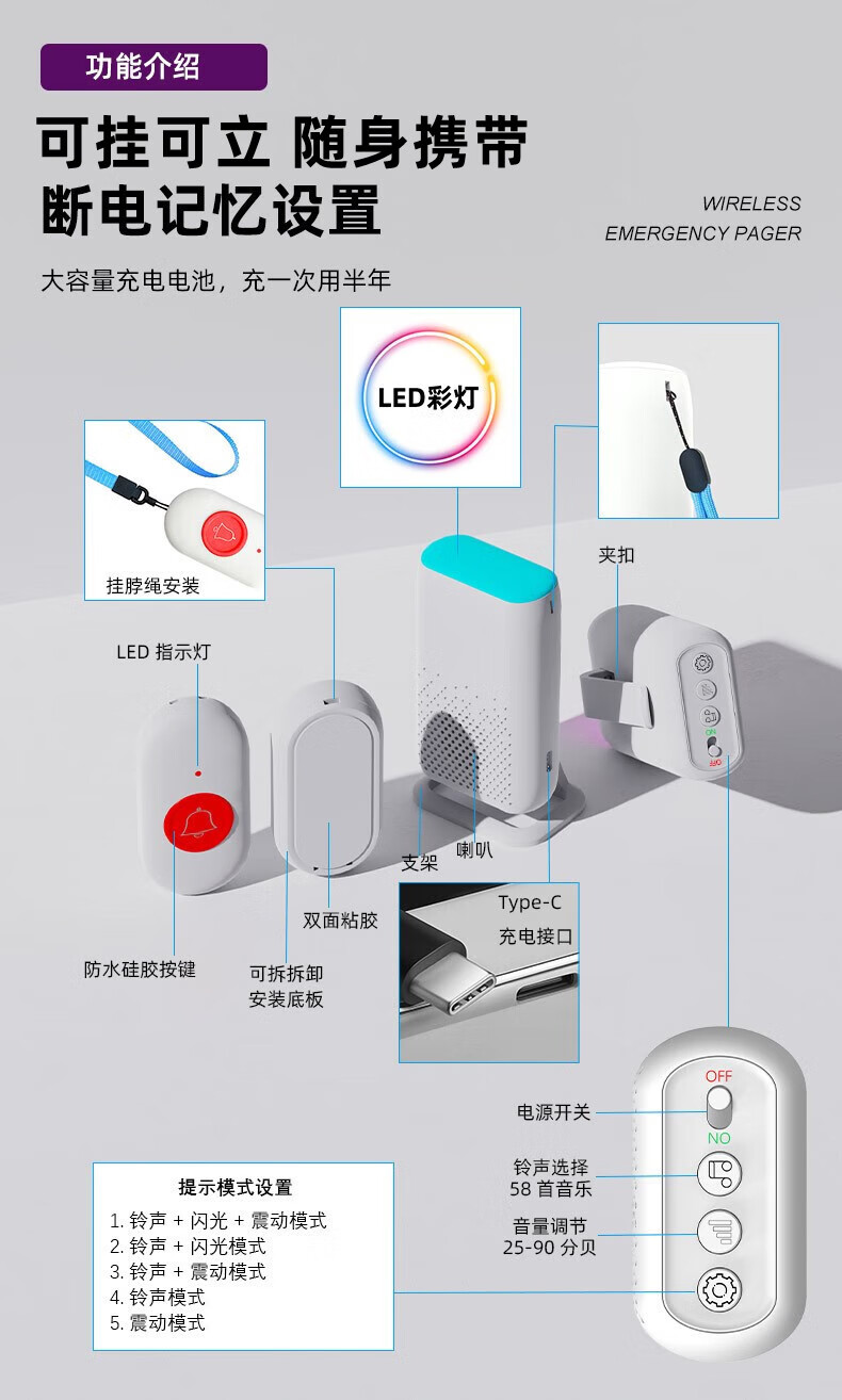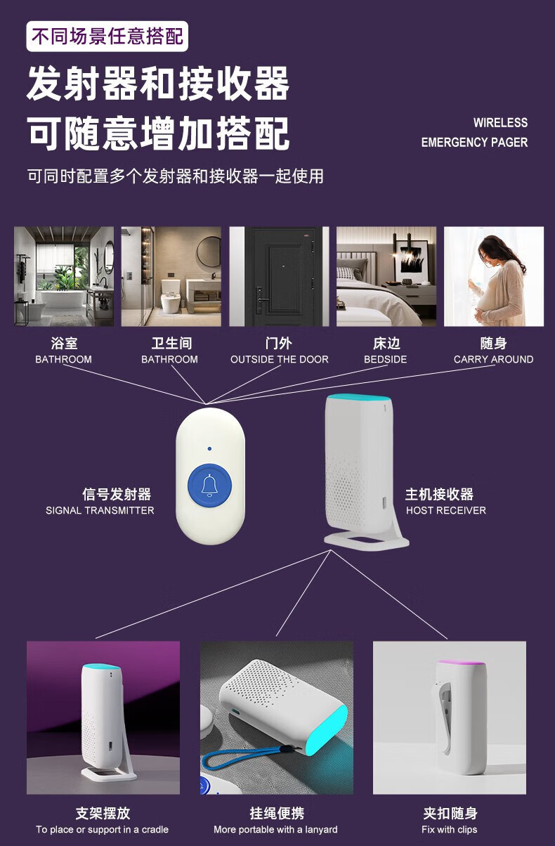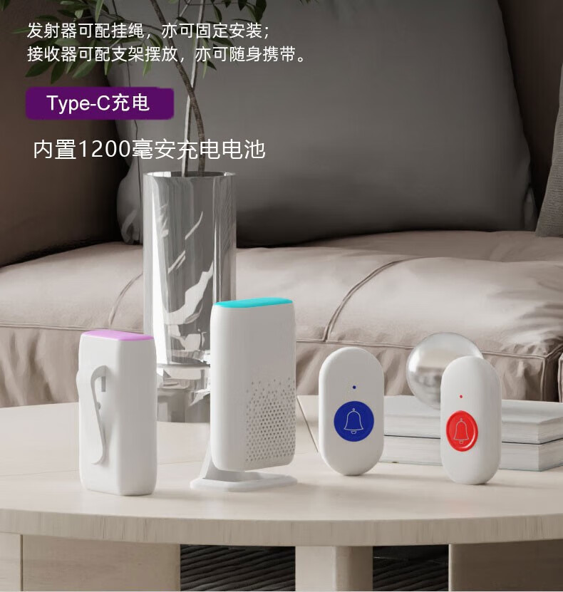 大九卫老人呼叫器充电款家用无线电铃病人床头呼叫遥控按铃一键紧急报警 808插电款:1按钮+1响铃+挂绳