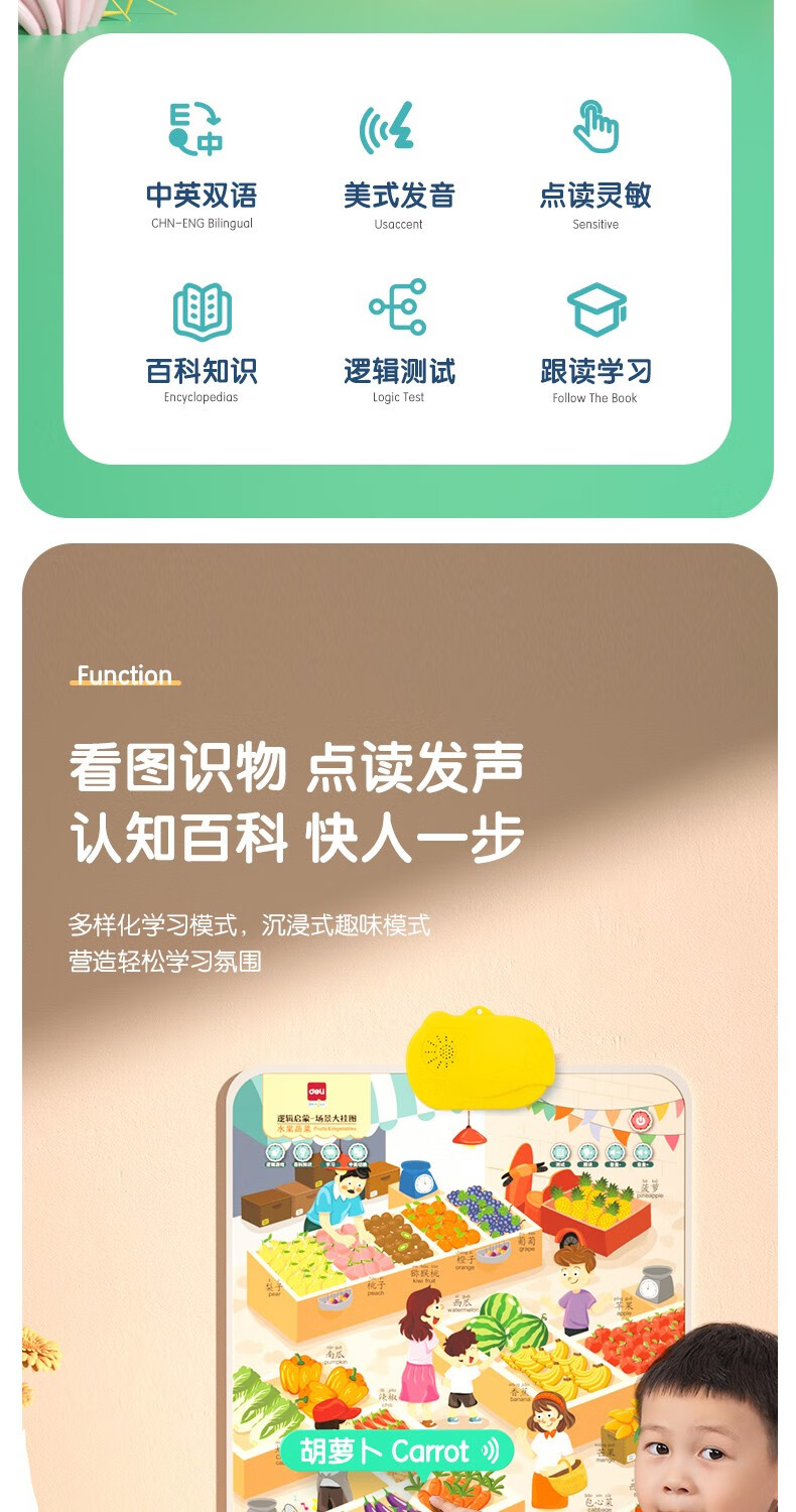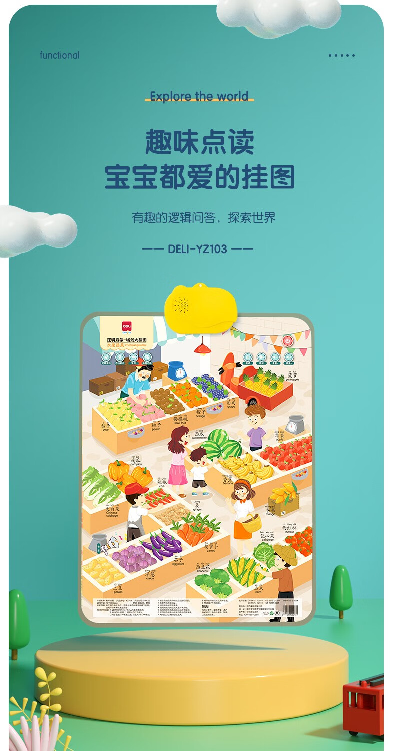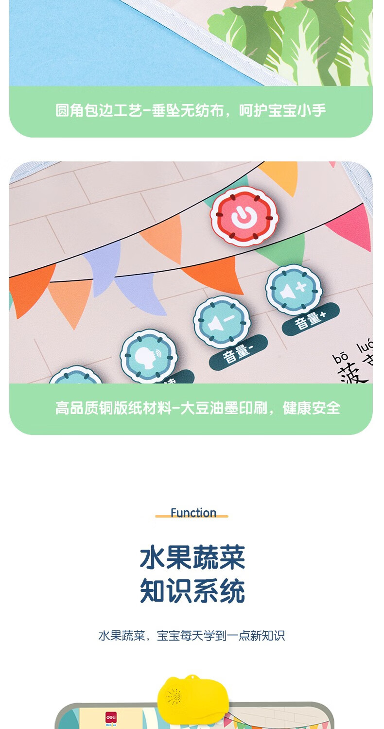 得力(deli)有声挂图儿童早教认知动物拼音数字幼儿启蒙宝宝益智学习玩具 【水果蔬菜】中英双语 附挂钩+电池