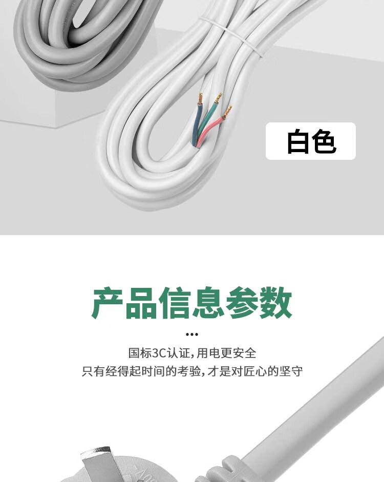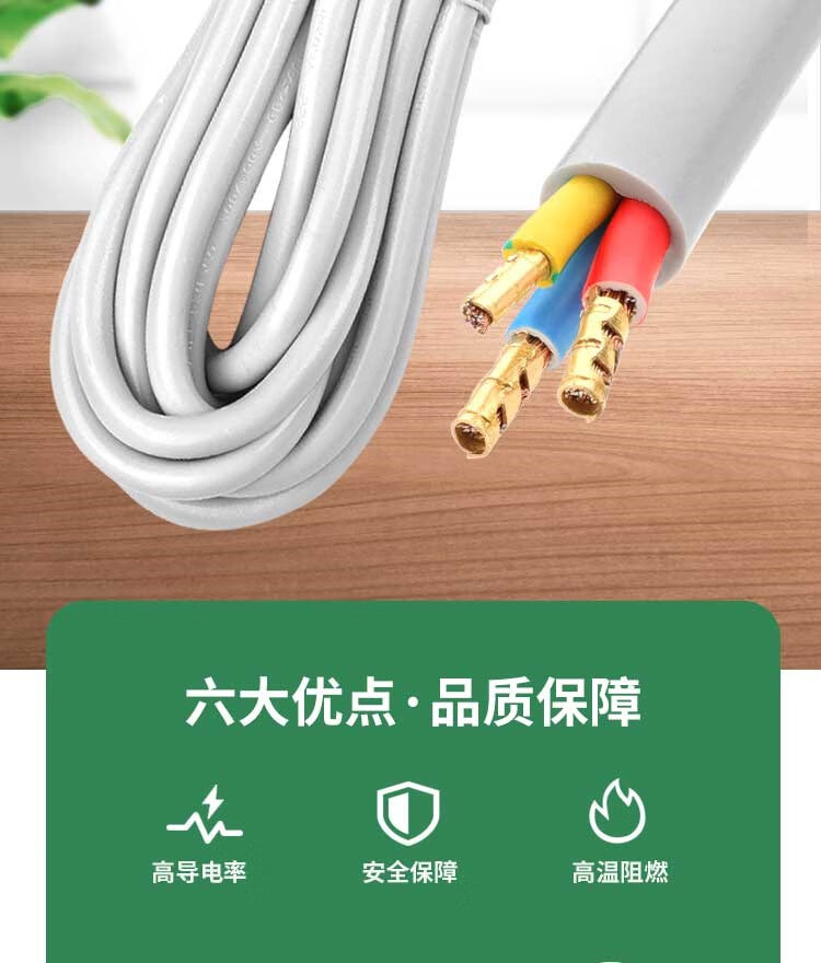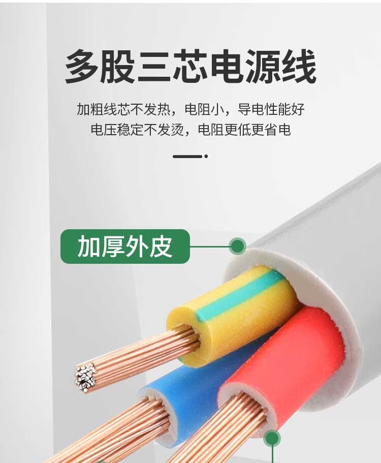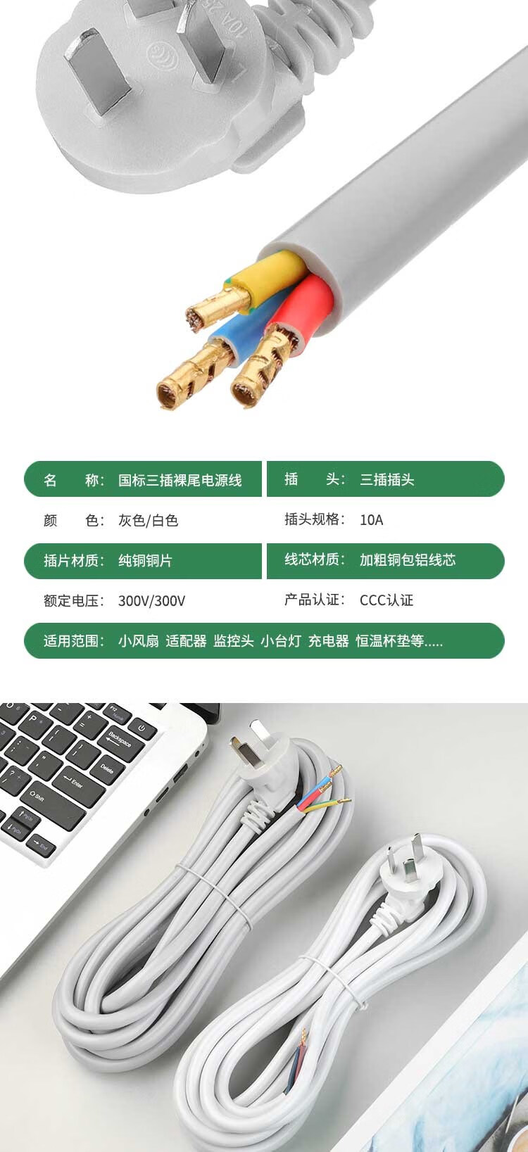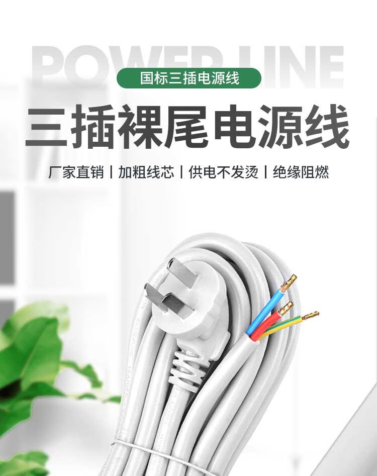 Fil carré pur 3 * prise/fiche/cordon d'alimentation 1/2,5 à trois broches à trois conducteurs en trois parties avec rangée 1,5 fils en aluminium cuivré à trois broches 10A3X2,5 carré 1,96 mètres