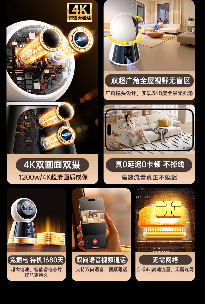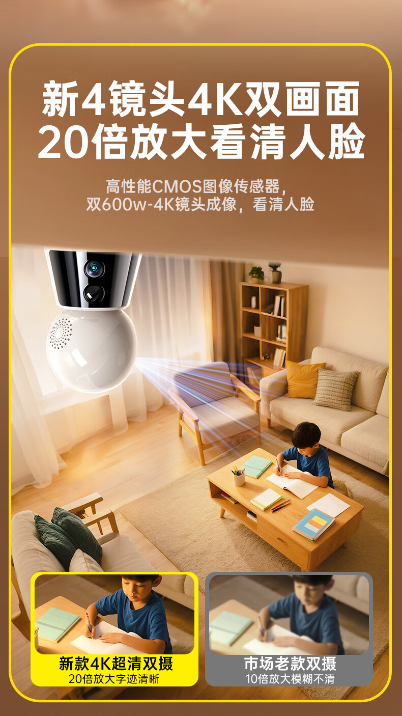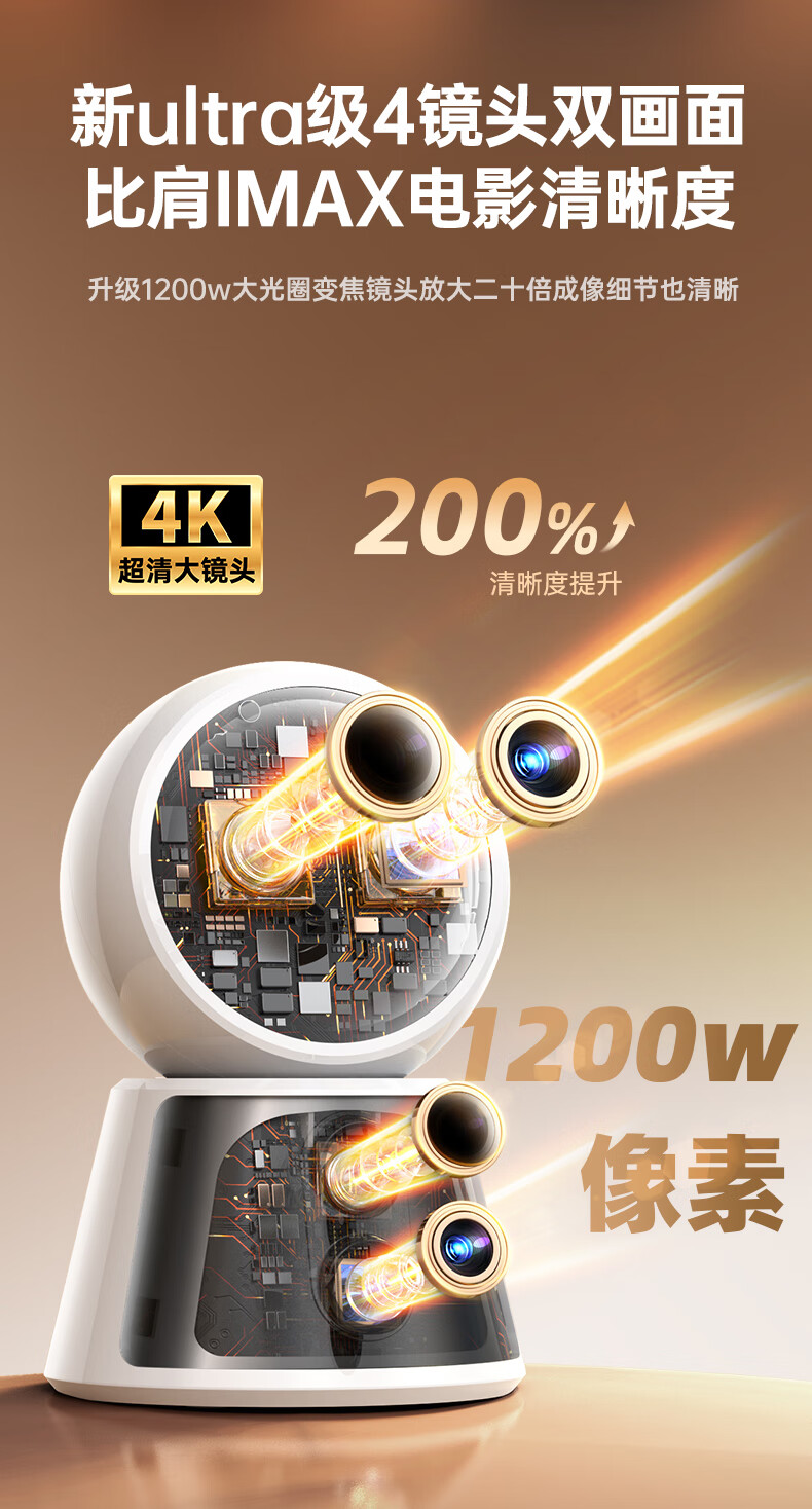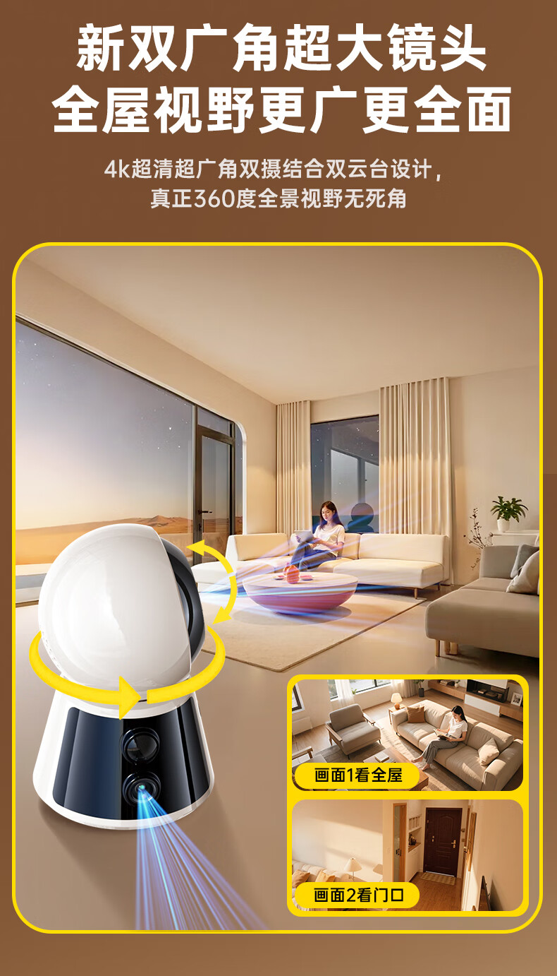 曼领【超清四摄】监控摄像头家用360度无死角带夜视无需连wifi终身免流量免插电手机远程室内看护对话 WiFi【超清四摄】4K双画面+AI无延迟 【30天循环录像】双向通话+人形追踪+日夜全彩 适用小米苹果华为荣耀vivoOPPO