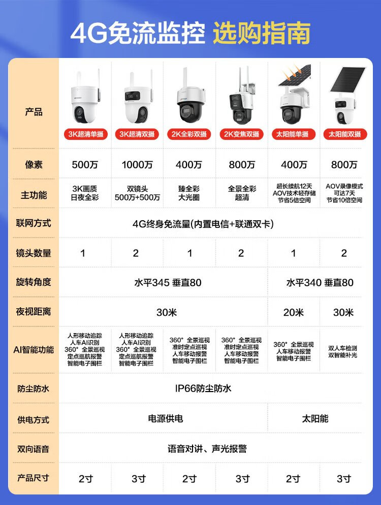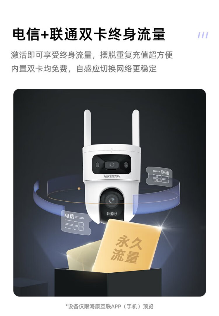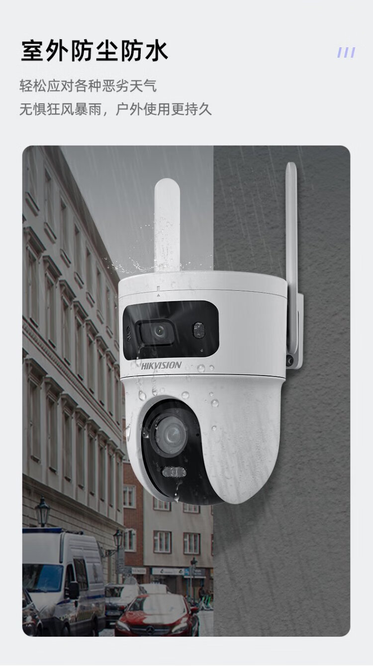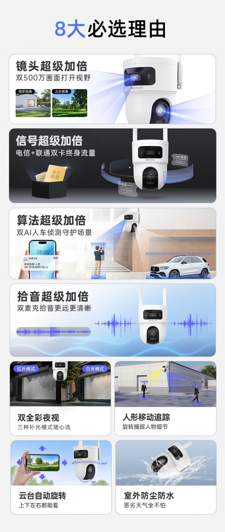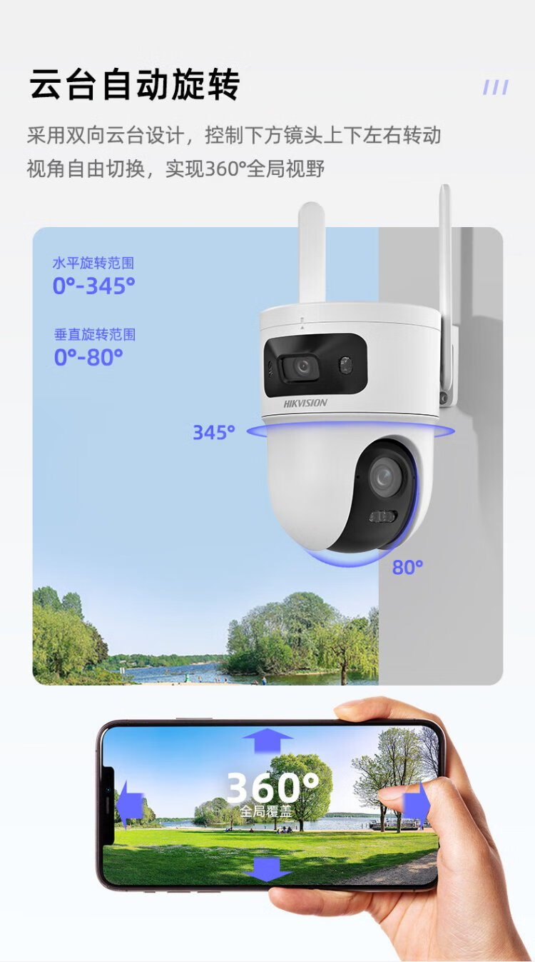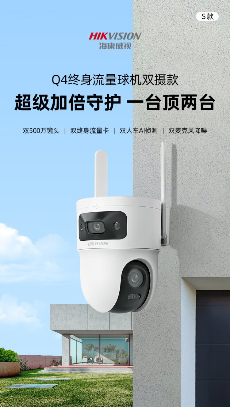 Hikvision 4G caméra extérieure de circulation gratuite à vie double caméra 10 millions de lumière de remplissage intelligente ultra-claire couleur vision nocturne panoramique à 360 degrés suivi surveillance extérieure rurale 256 Go + cordon d'alimentation étanche gratuit double caméra 5 millions de pixels/trafic gratuit à vie