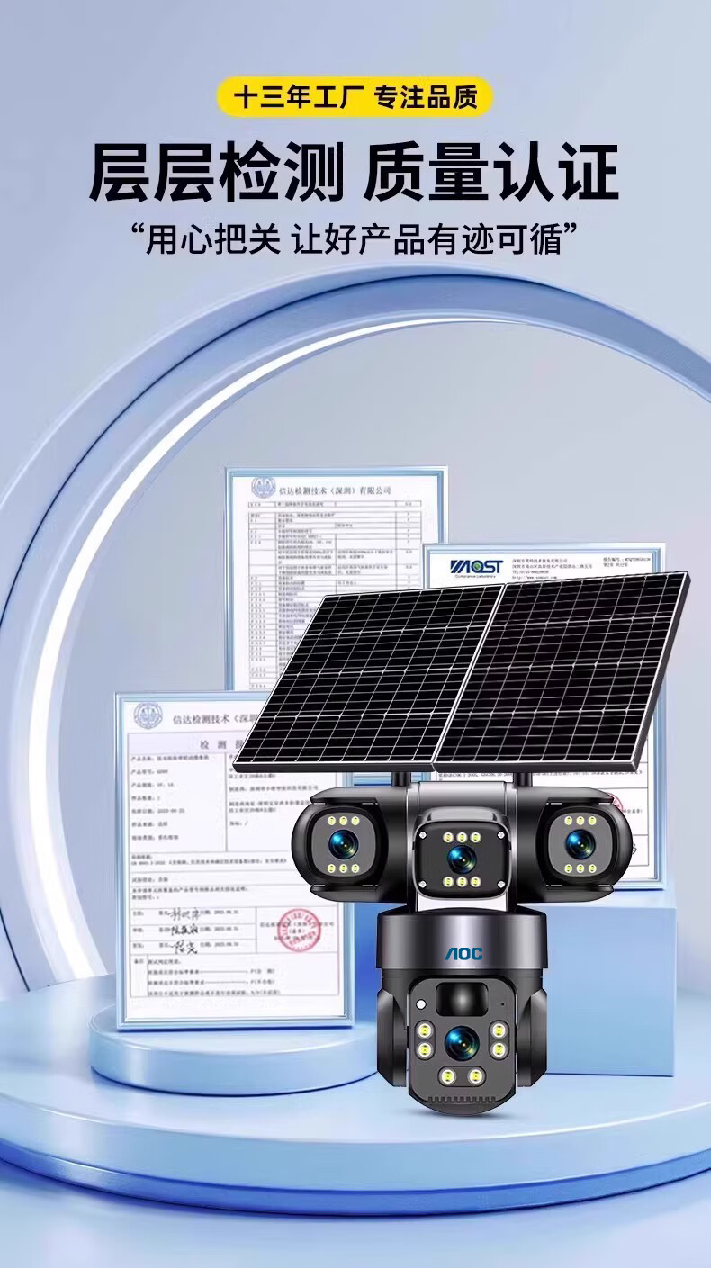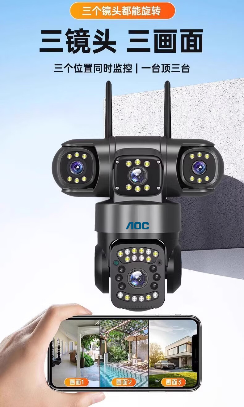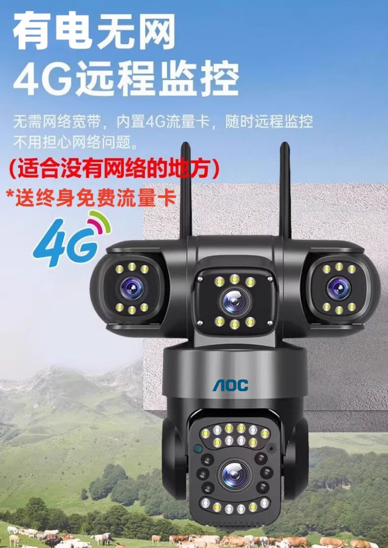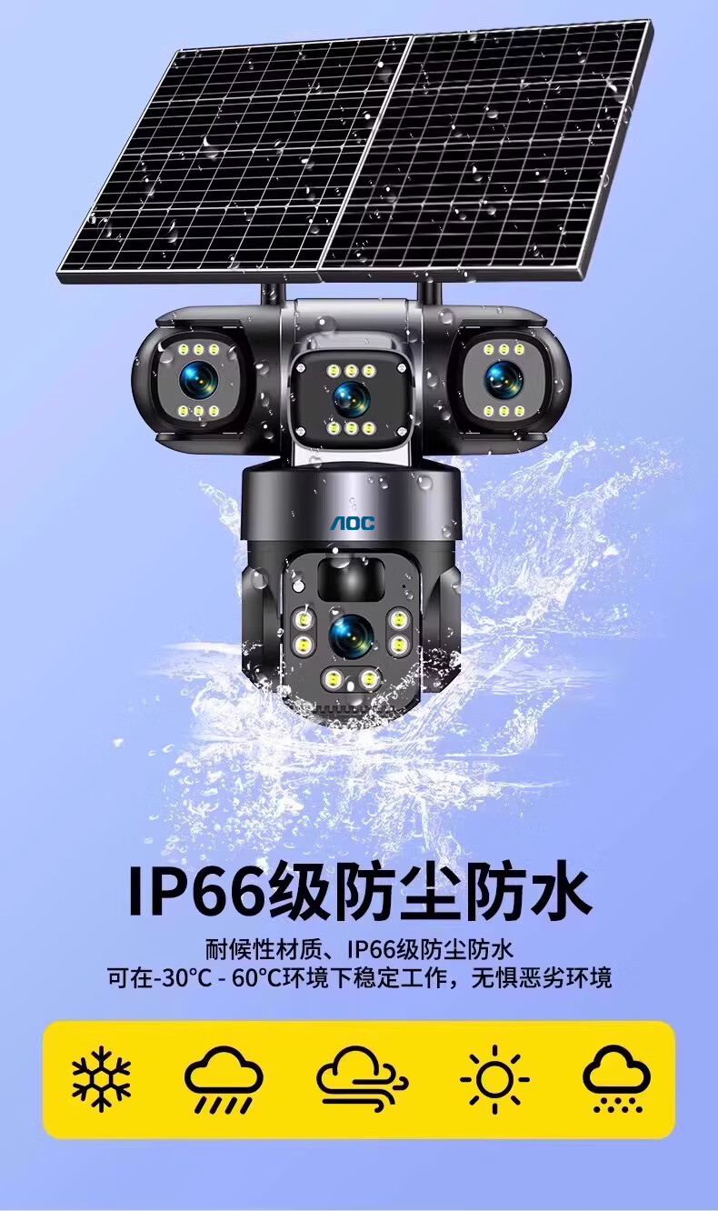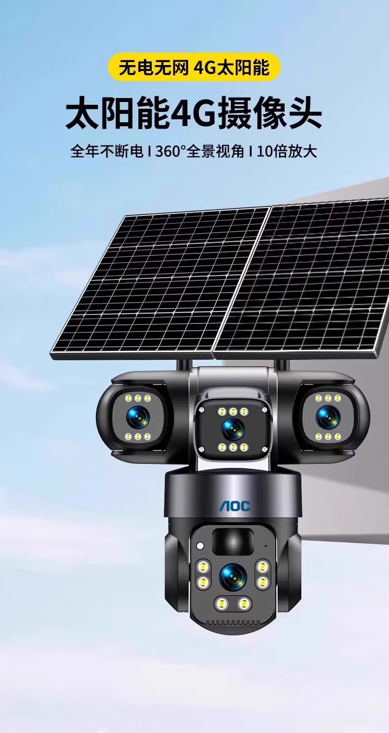 AOC摄像头监控4g太阳能摄像头室外无网免费流量免插电手机远程监控器家用户外360度无死角全景夜视 双板快充64G+爆品太阳能监控+三镜头三旋转无死角