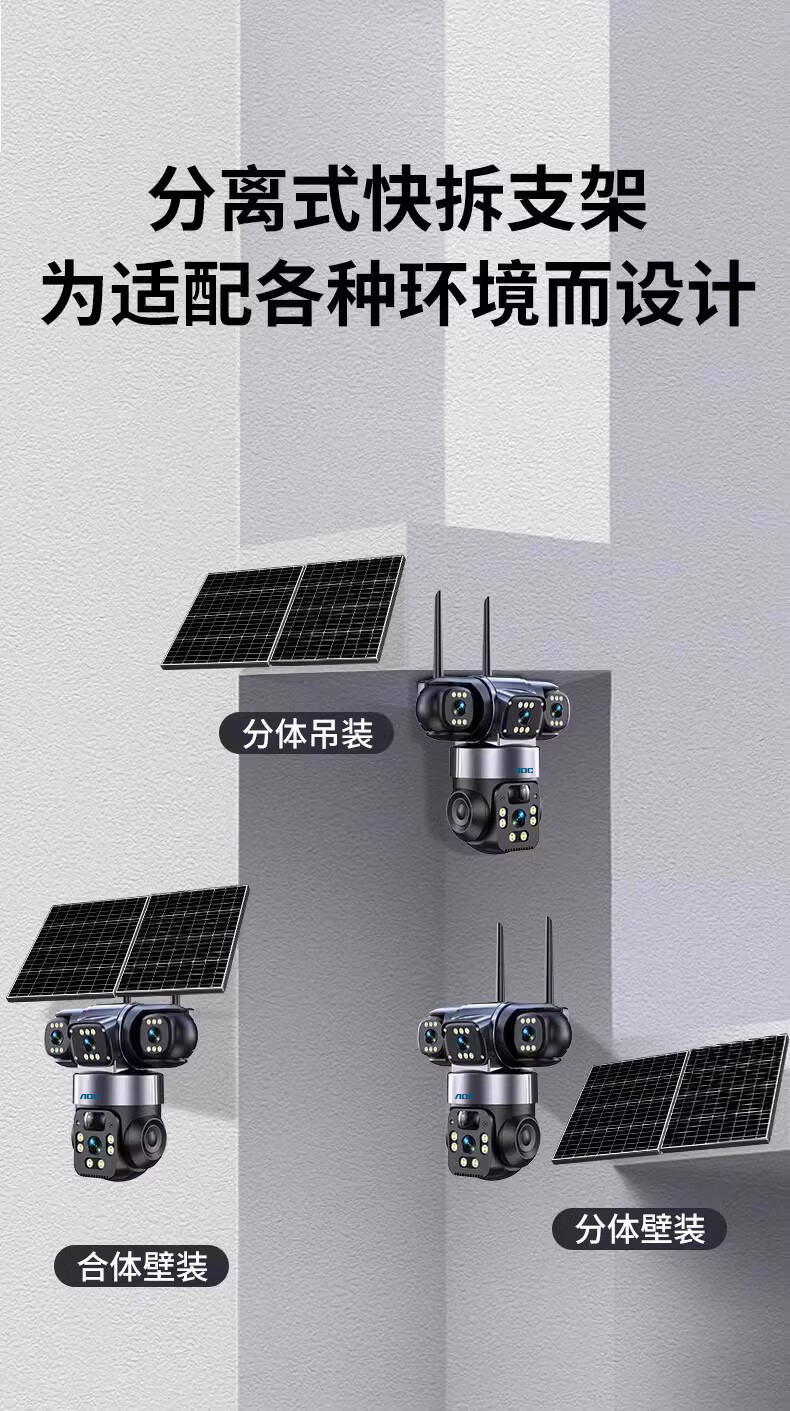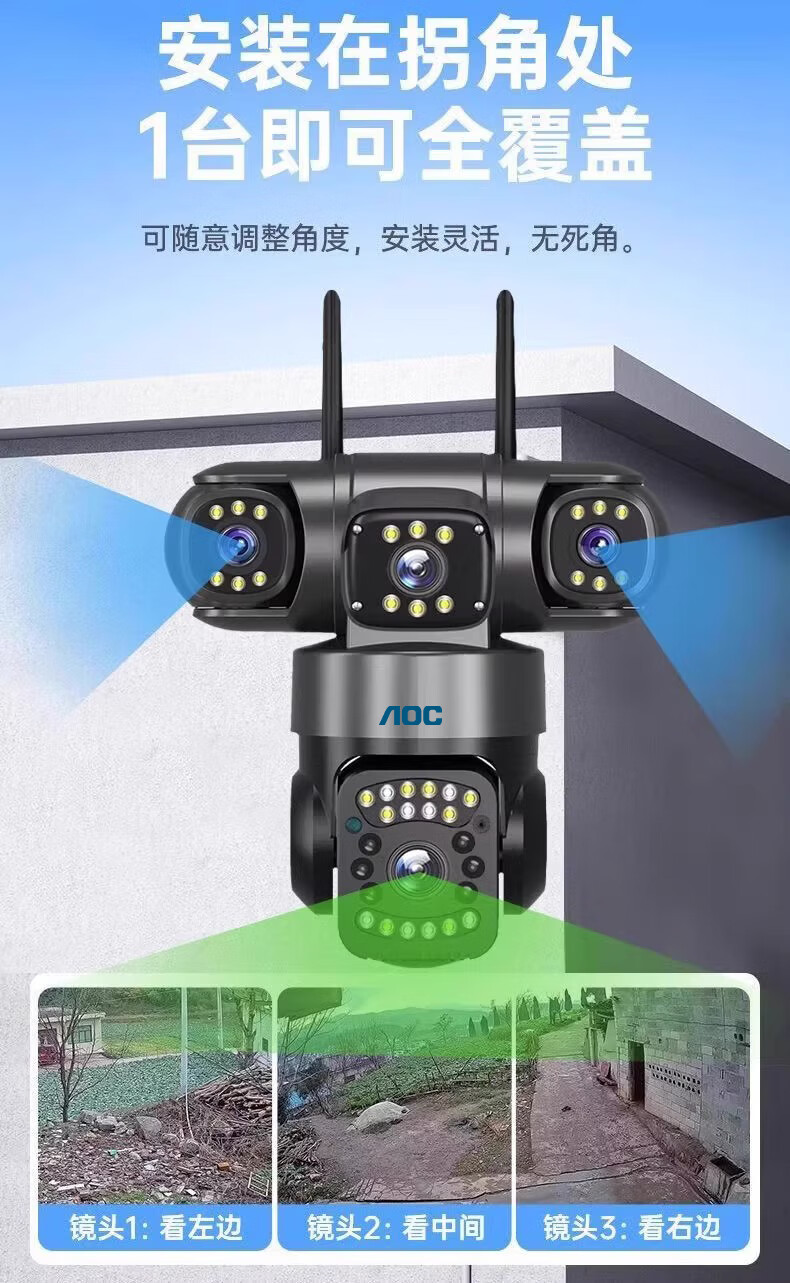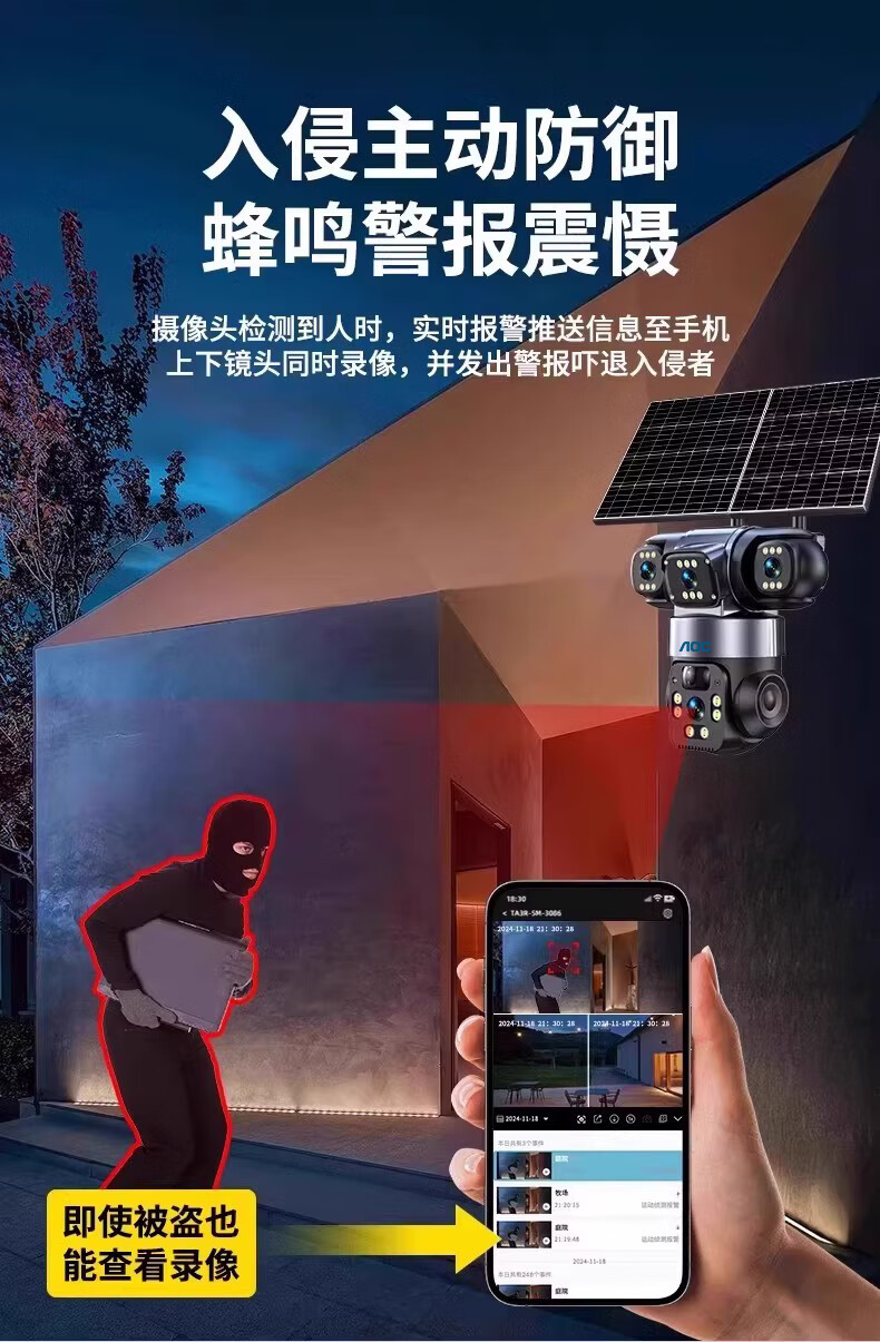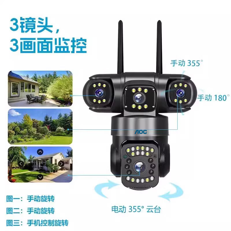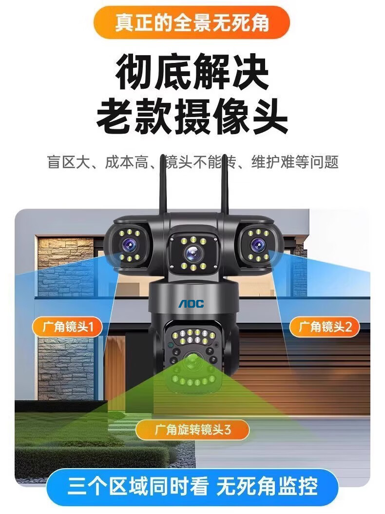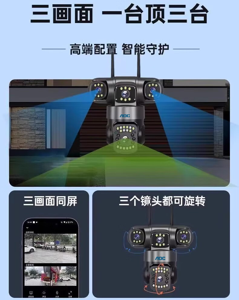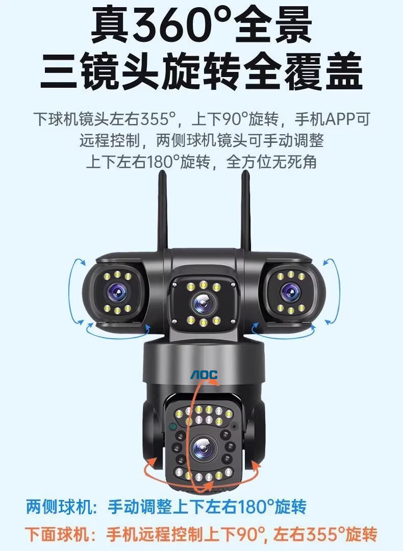 AOC摄像头监控4g太阳能摄像头室外无网免费流量免插电手机远程监控器家用户外360度无死角全景夜视 双板快充64G+爆品太阳能监控+三镜头三旋转无死角