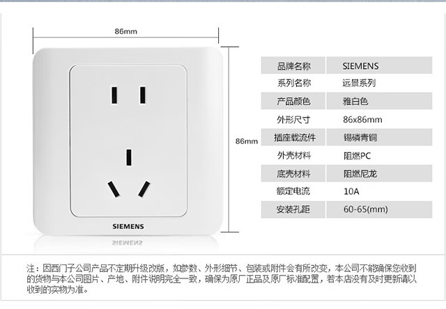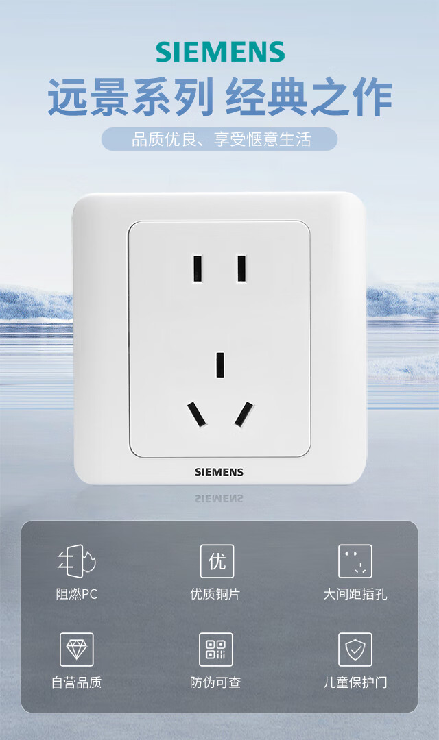 西门子(SIEMENS)开关插座 10A五孔带开关插座 暗装面板 远景雅白色5UB82243NC01