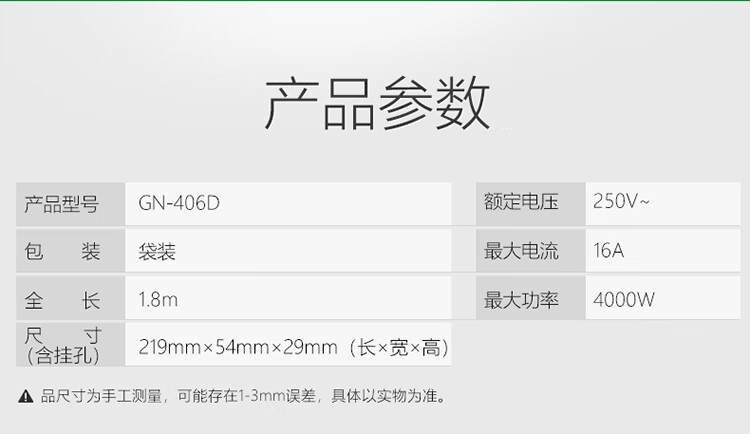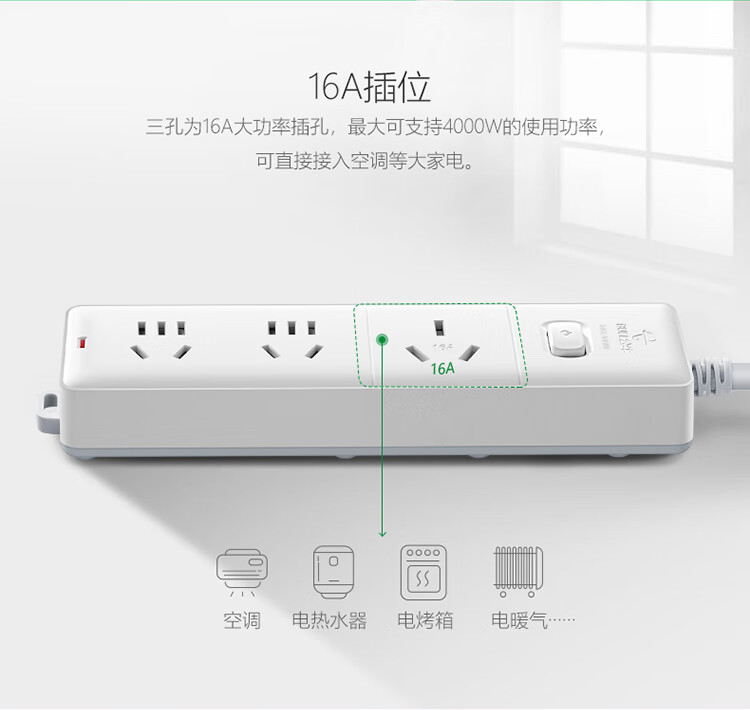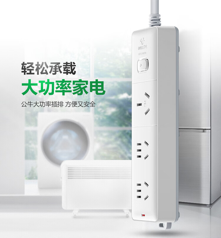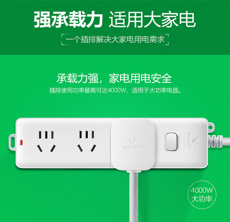 公牛(BULL)大功率16A空调伴侣插座/插线板/插排/排插/接线板/拖线板 3位总控全长1.8米送10A头 GN-406D