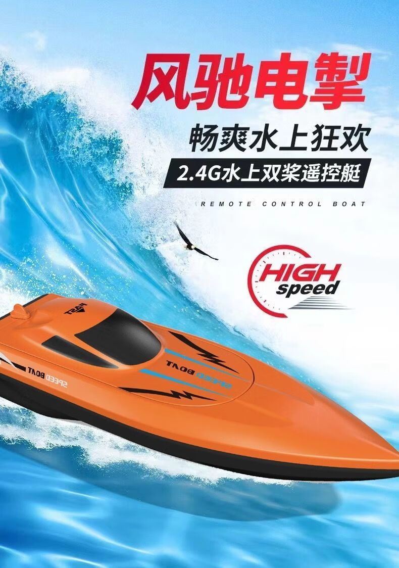 秘浓儿童遥控船玩具可下水高速快艇仿真电动轮船男孩水上小船模型拉网 【活力橙礼盒】快艇船电池版