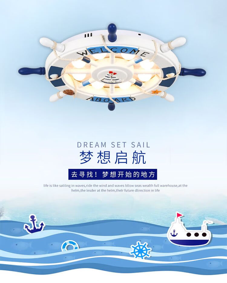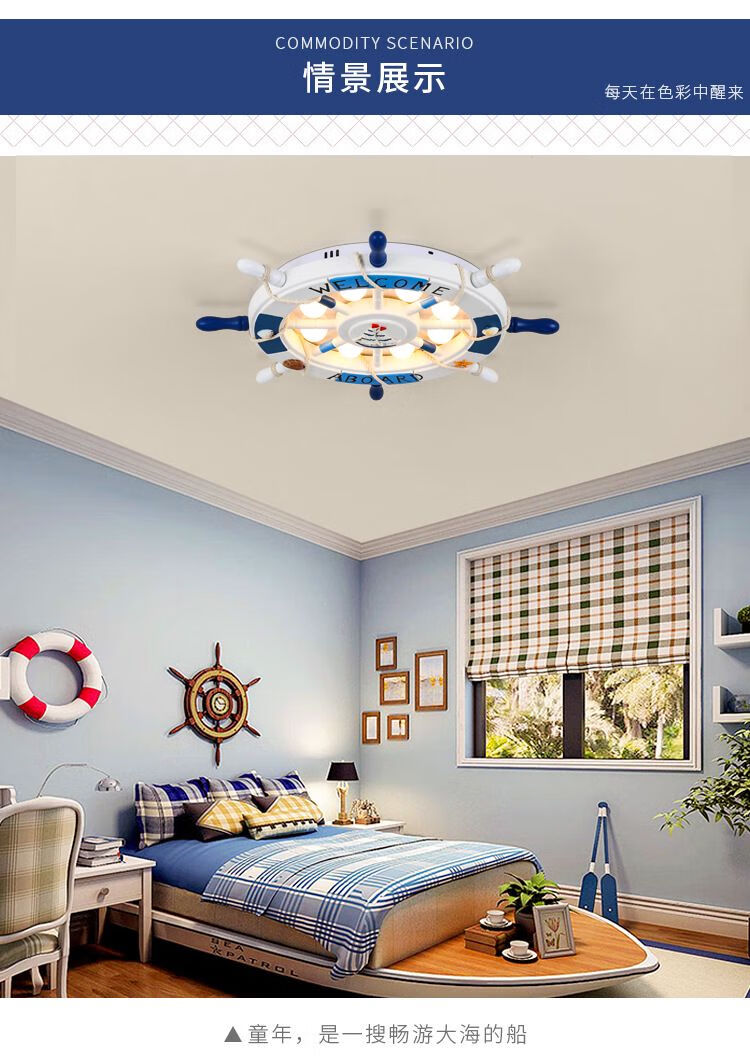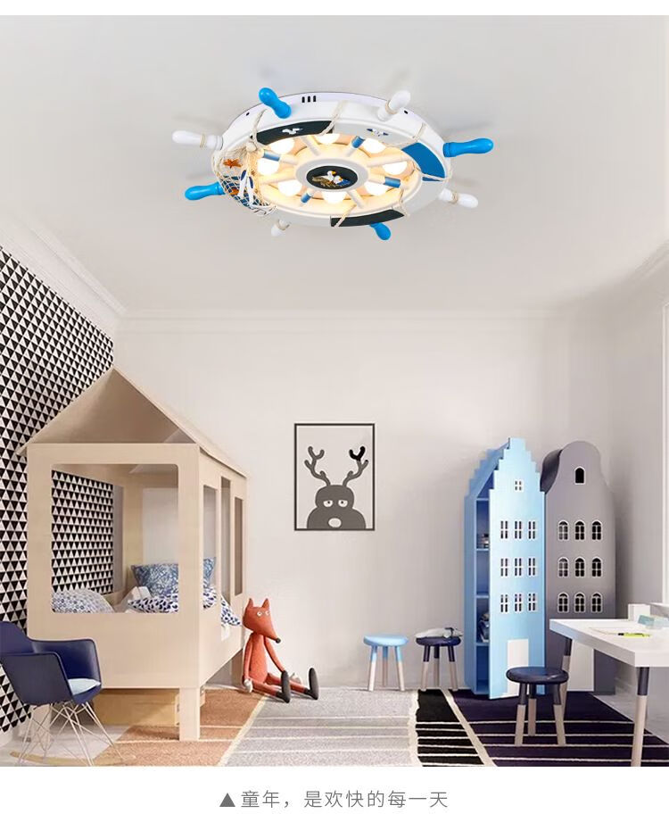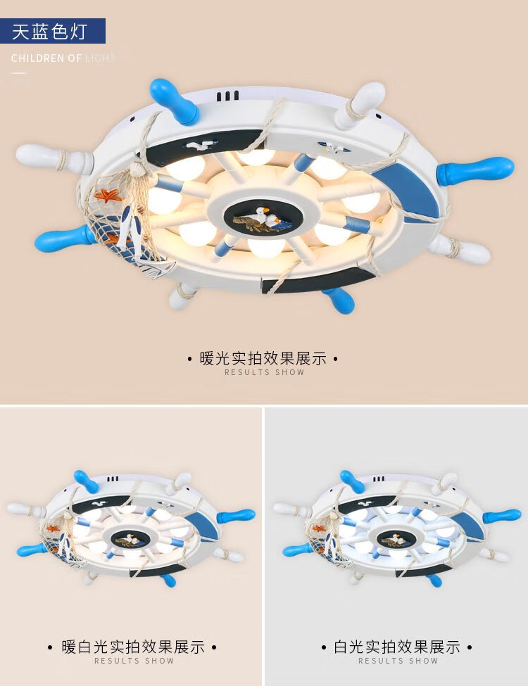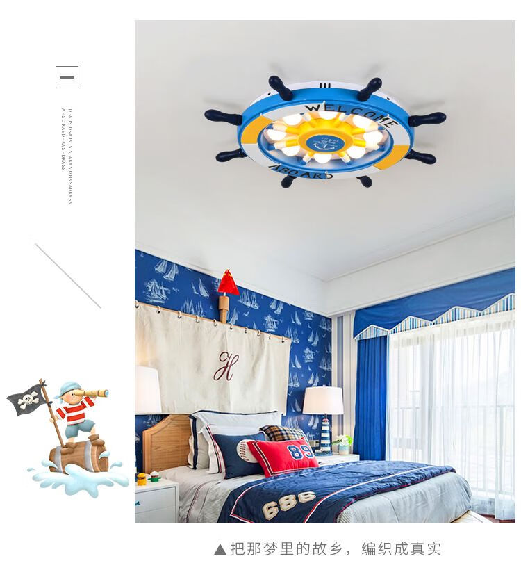 Shantou Lincun Plafonnier pour chambre d'enfant dans la chambre d'un bateau de pirate, lampe de gouvernail de style méditerranéen, lampe de chambre à coucher de dessin animé de célébrité sur Internet, bleu et blanc, ensemble complet de gradation en continu + télécommande
