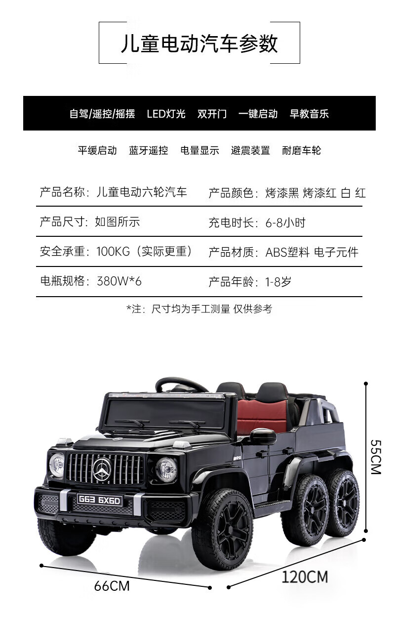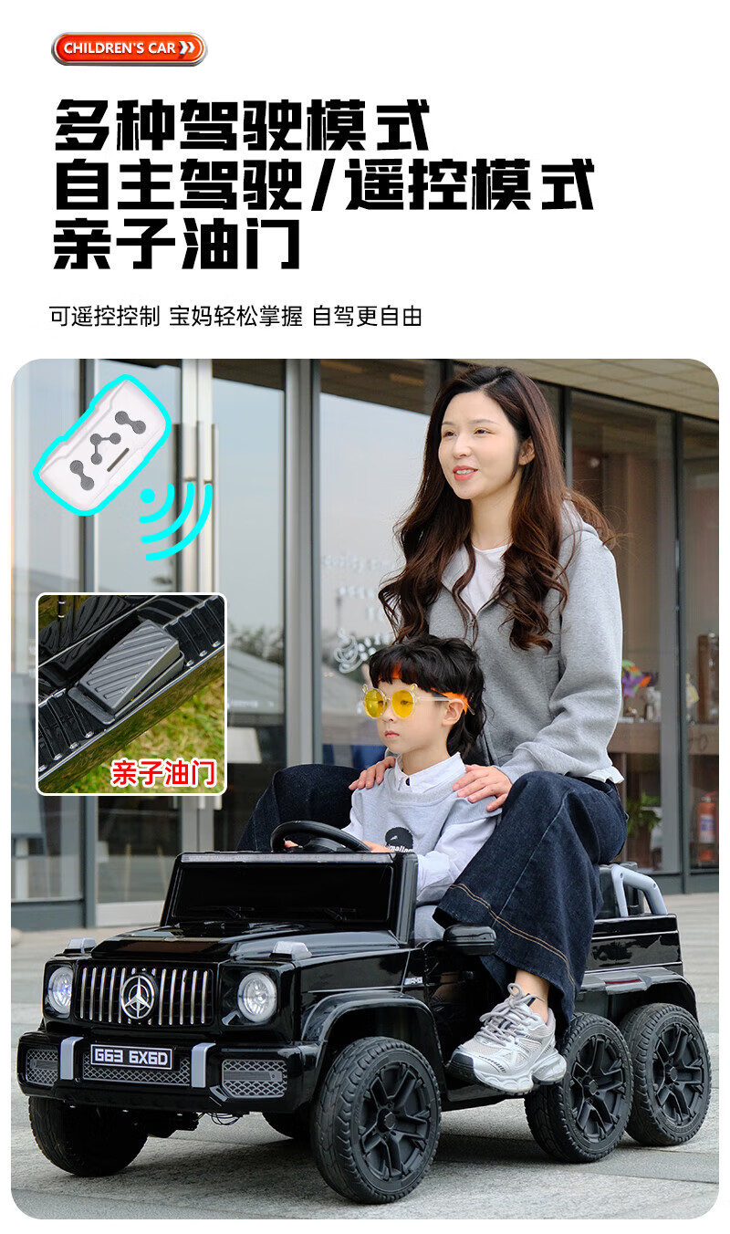 La voiture électrique pour enfants Little Jelly imite la voiture Mercedes-Benz Big G et peut être utilisée comme voiture parent-enfant. Une grande voiture jouet télécommandée peut être conduite. Noir + six roues motrices + siège en cuir + roues dures + batterie Chaowei 12V10A + gros paquet cadeau