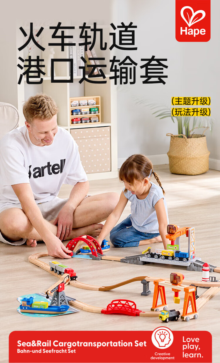 Hape木质火车轨道 火车拼装积木亲子互动DIY搭建  益智玩具儿童礼物 火车轨道港口运输套+赠电动火车头 3-8Y