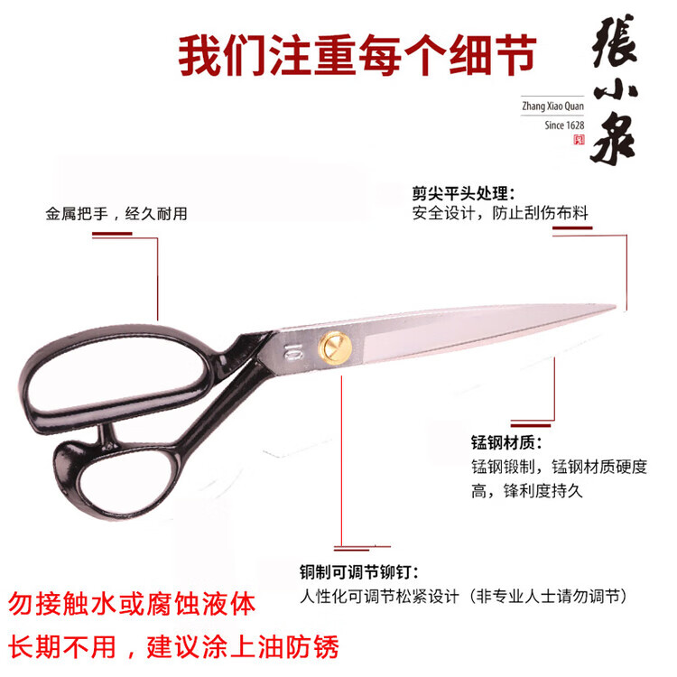 Zhang Xiaoquan scissors, household clothing scissors, tailor's scissors, sewing special cutting tools, large scissors for cutting clothes, Quan 10-inch white-blade yarn-feeding scissors, wooden ruler for marking