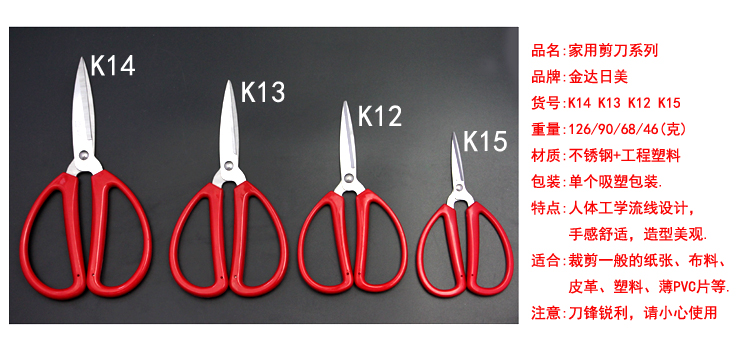 金达日美剪刀 家用剪刀 不锈钢剪刀 家庭民用剪刀 加厚红色塑柄 四个大小 K12中小号