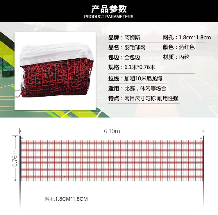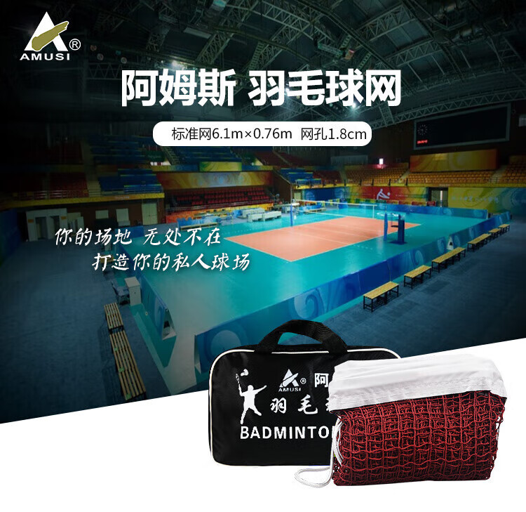 阿姆斯AMUSI羽毛球网 便携式标准网6.1m×0.76m 1.8cm网孔 四包边专业款
