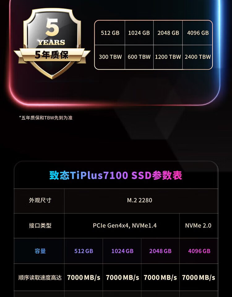 致态(ZhiTai)长江存储 512GB SSD固态硬盘 NVMe M.2接口 TiPlus7100系列