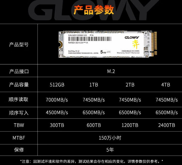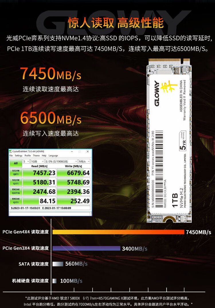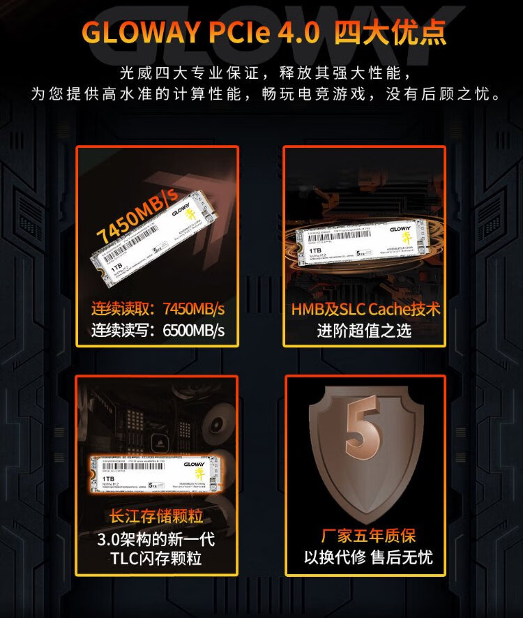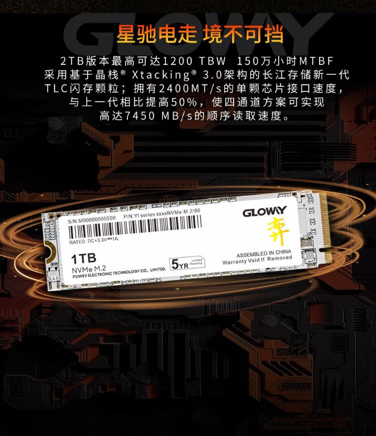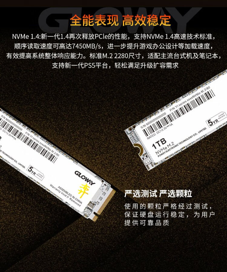 光威(Gloway)1TB SSD固态硬盘 M.2接口(NVMe协议) PCIe 4.0x4 7450MB/s 长江存储TLC颗粒 弈系列