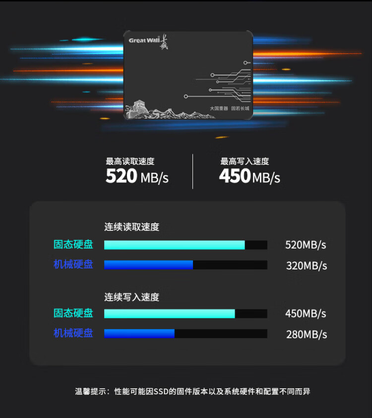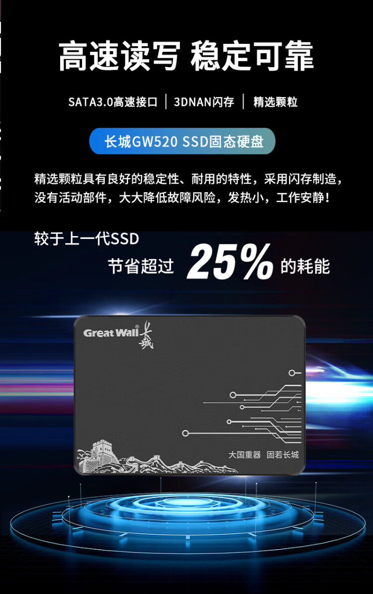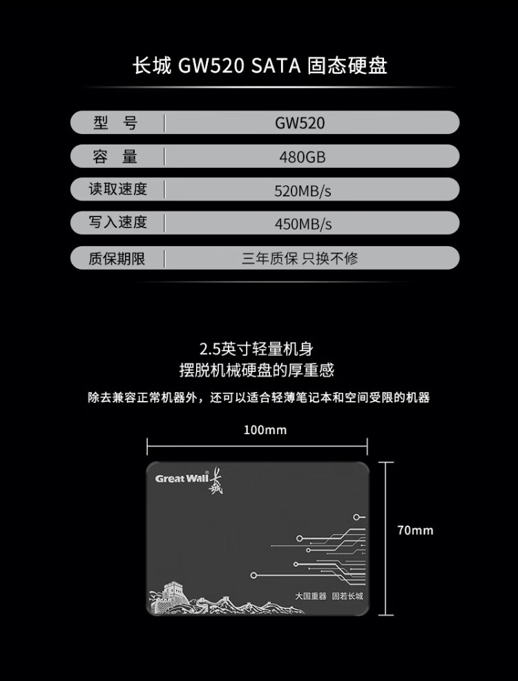 长城(Great Wall) 480GB SSD固态硬盘 SATA3.0接口 读速520MB/S台式机/笔记本通用 GW520系列