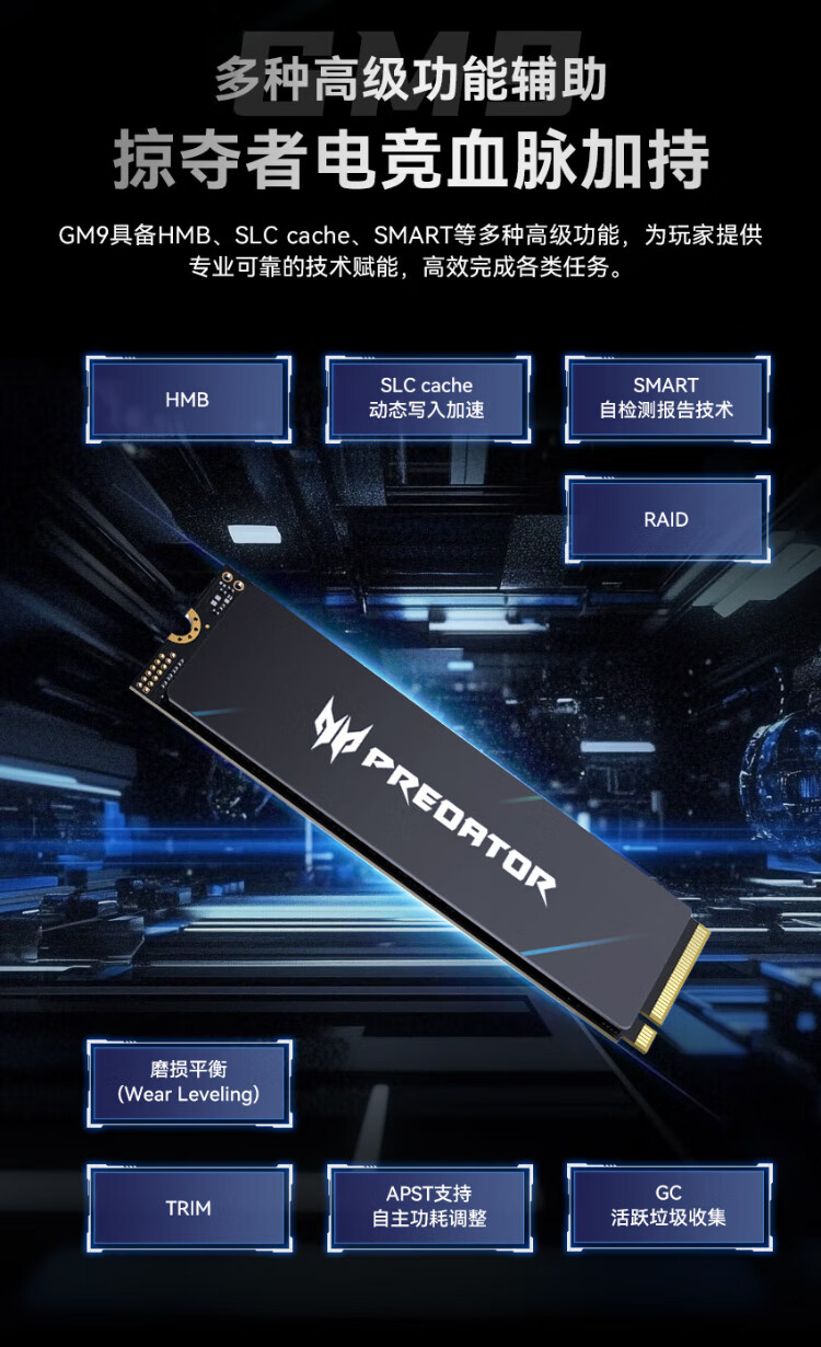 宏碁掠夺者(PREDATOR)1TB SSD固态硬盘 M.2接口(NVMe协议) GM9系列 NVMe PCIe 5.0读速14000MB/s AI电脑存储配件