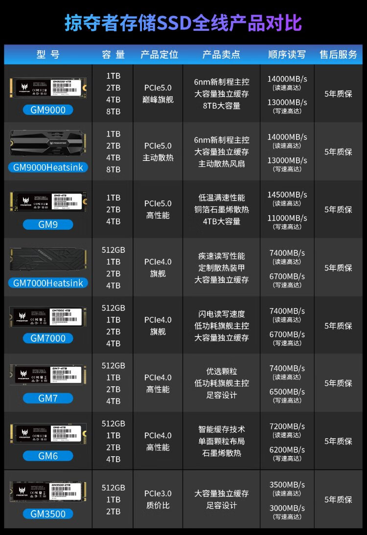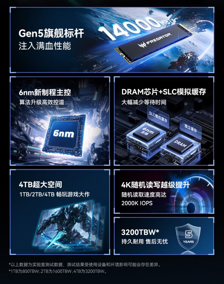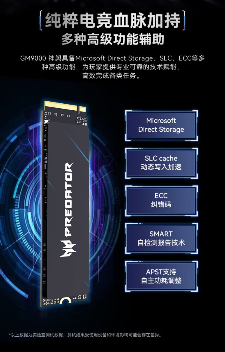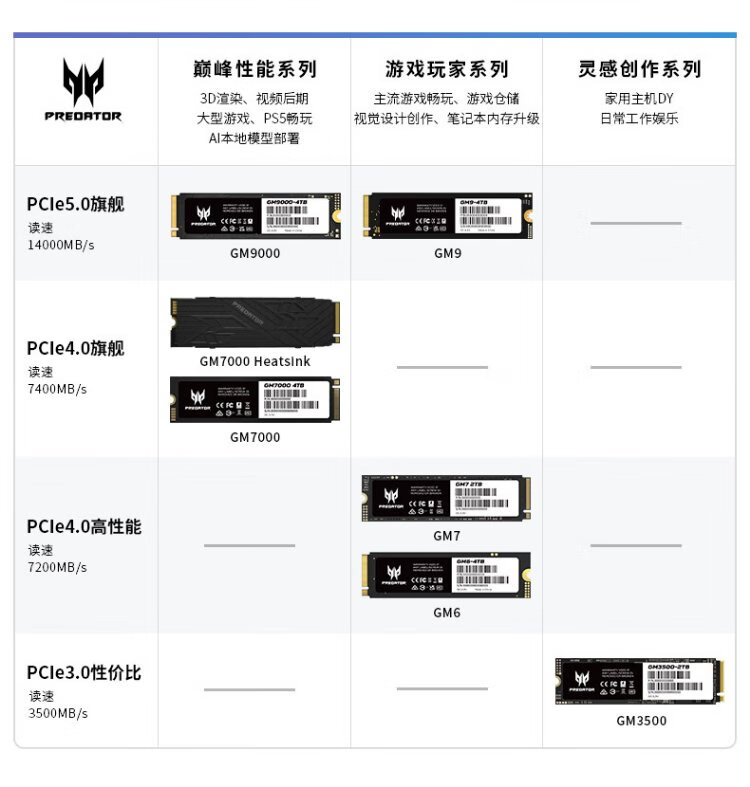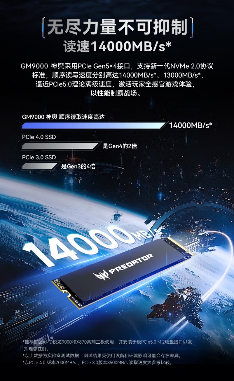 Disque SSD Acer PREDATOR 8 To Interface M.2 (protocole NVMe) Série GM9000 NVMe PCIe 5.0 Vitesse de lecture 14 000 Mo/s Accessoires de stockage informatique AI