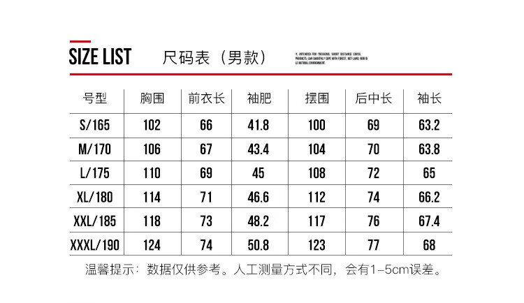 China (cm) 165 / 88-90 170 / 96-98 175 / 108-110 180 / 118-122 185 / 126-130