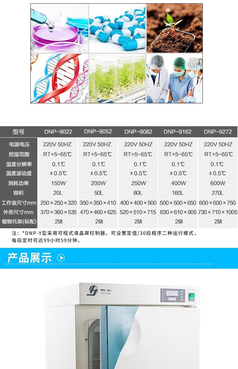 JINGHONG DNP série laboratoire électrique à température constante incubateur programmable LCD écran tactile température ambiante + 5 ~ 65 degrés DNP9272Y