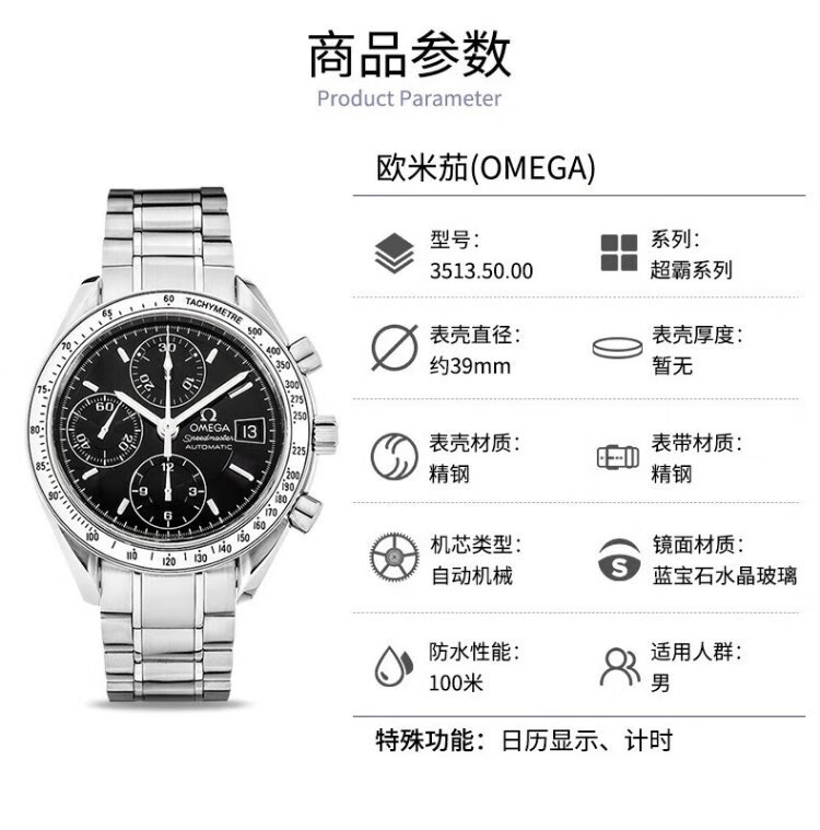 【二手99新】欧米茄男表(OMEGA)超霸系列 自动机械男表夜光日期显示计时多功能手表男精钢男士腕表 【39mm】蓝盘双历 3523.80.00
