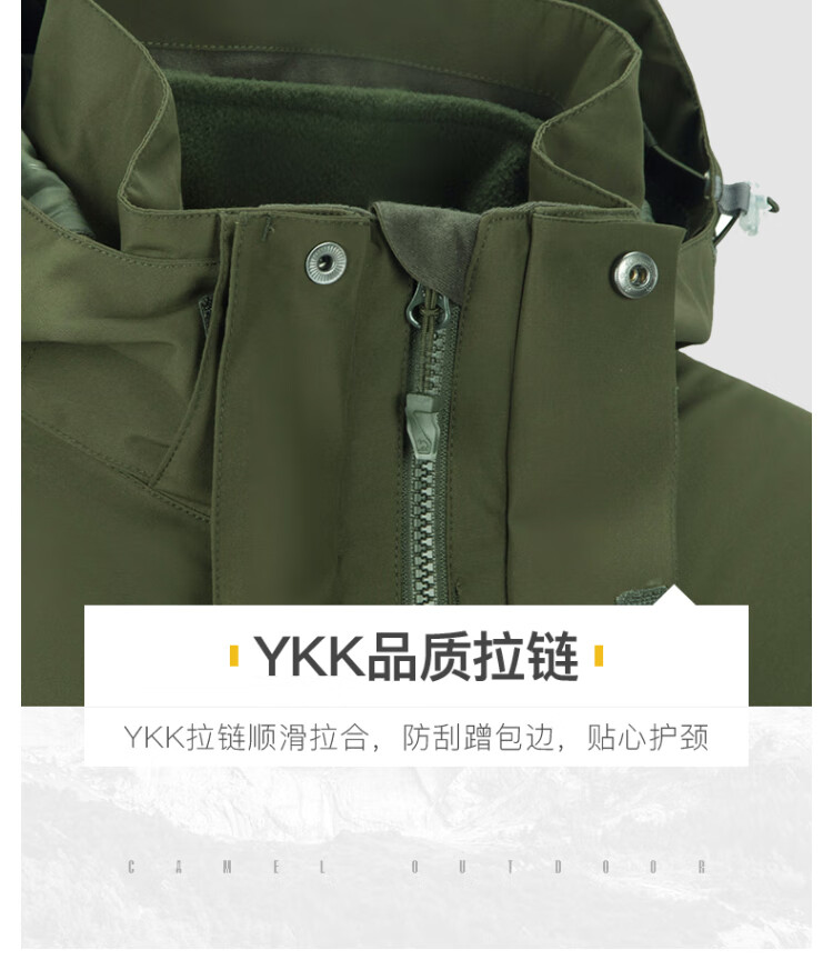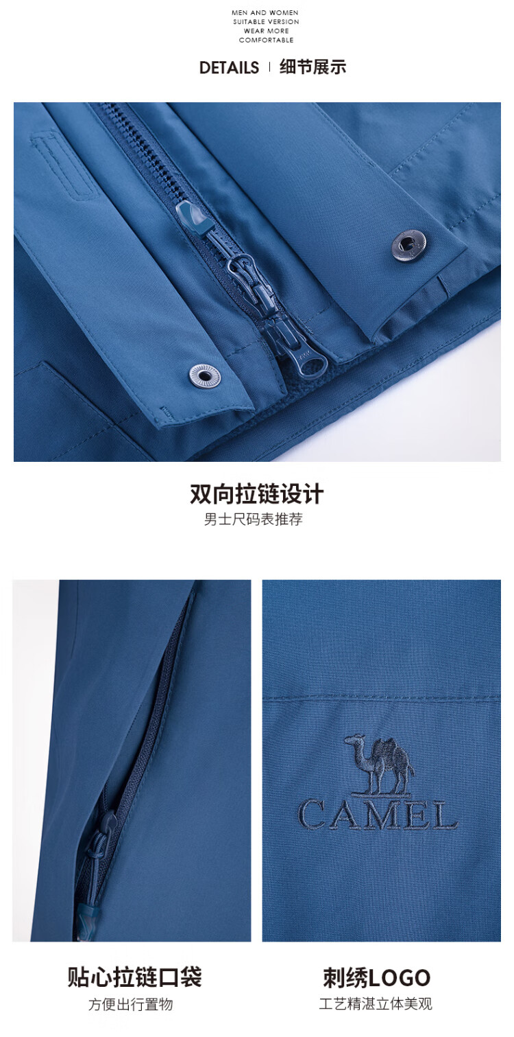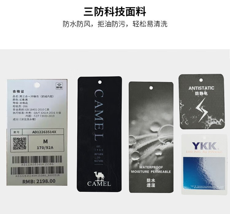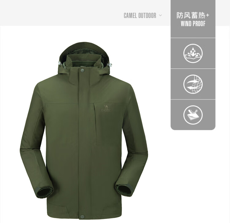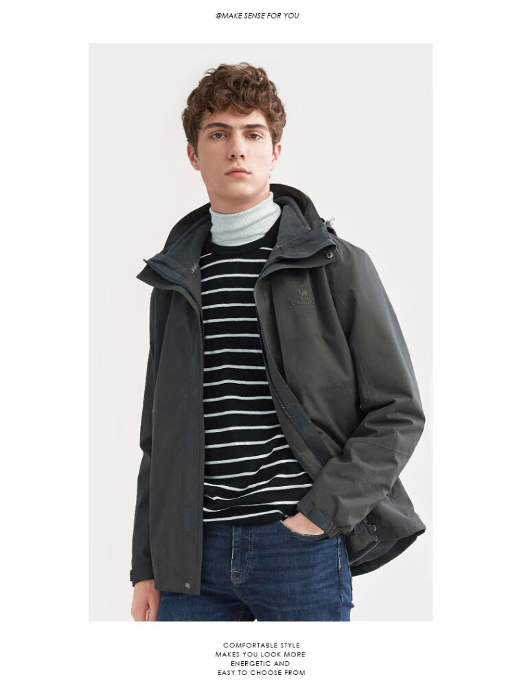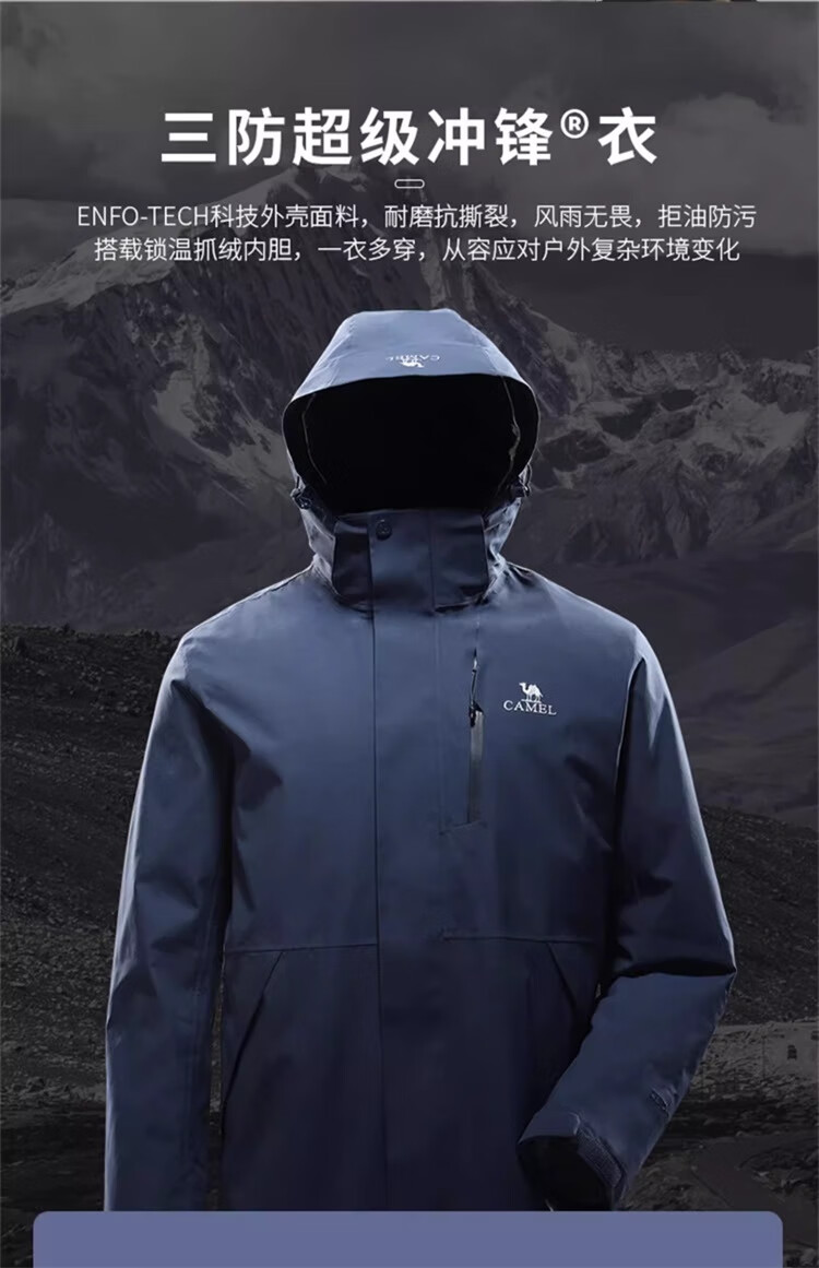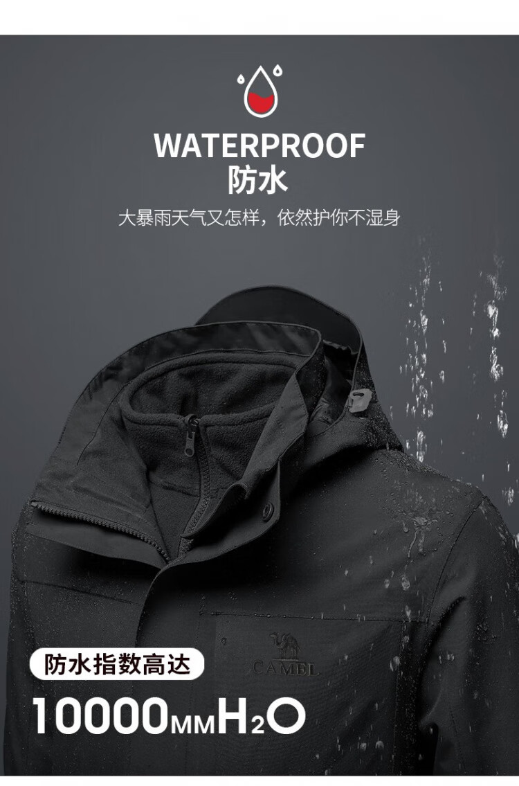 Camel (CAMEL) three-proof windbreaker jacket for men and women three-in-one removable windproof waterproof stain-proof jacket windbreaker AD12263514X, Phantom Black, same style for men and women XL