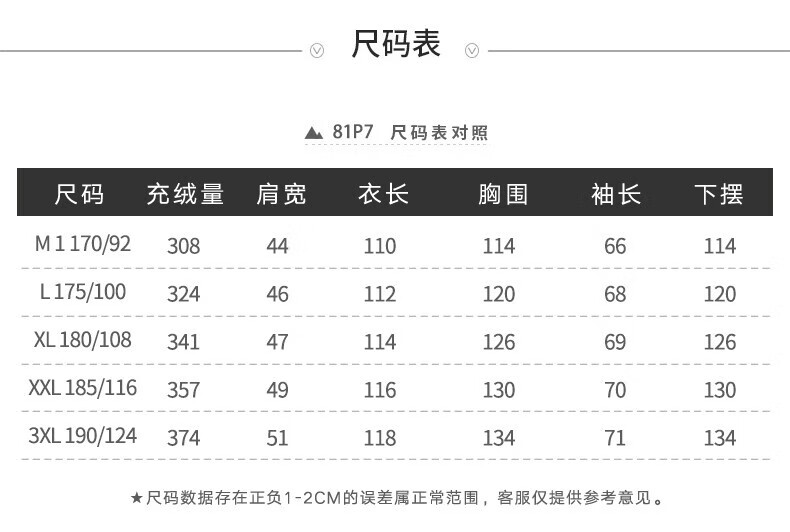 China (cm) 165 / 88-90 170 / 96-98 175 / 108-110 180 / 118-122 185 / 126-130
