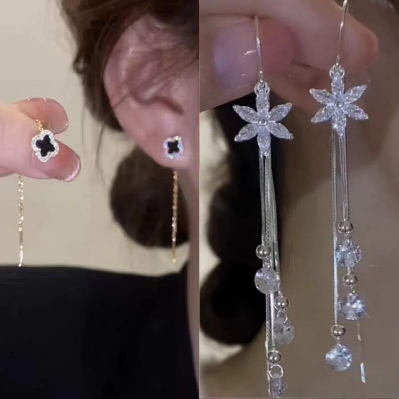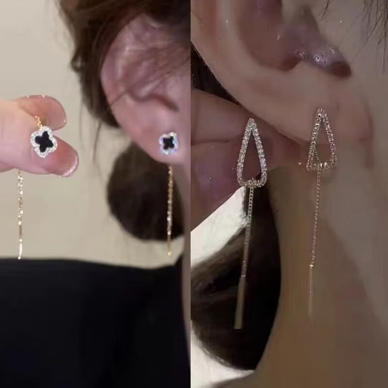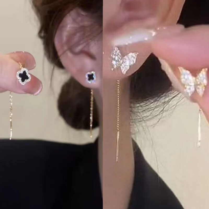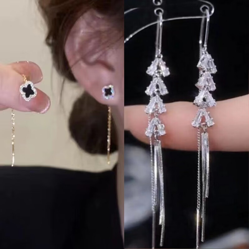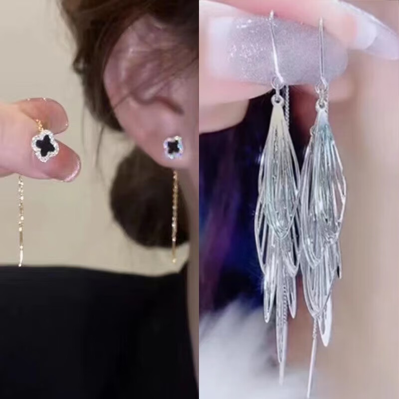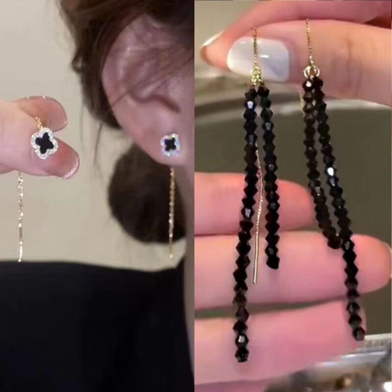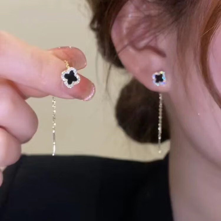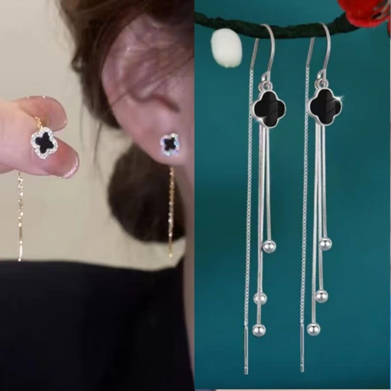 含春花四叶草流苏耳线女感气质耳饰2025年新款网红长款耳坠耳线 A921/A691黑四叶草+银色羽毛