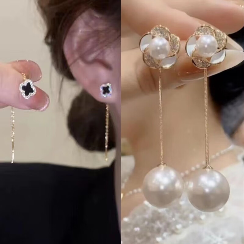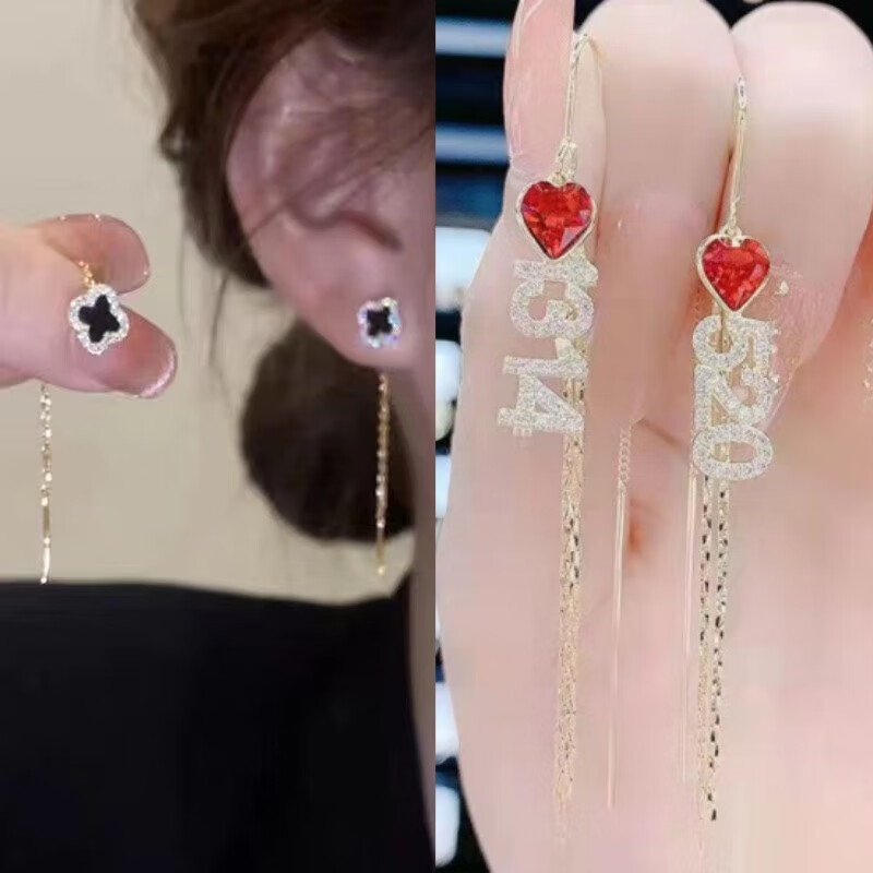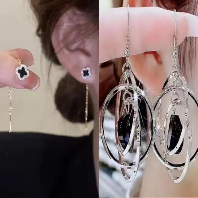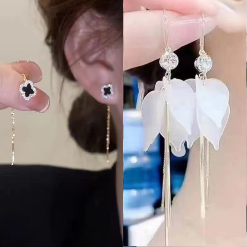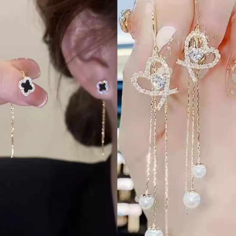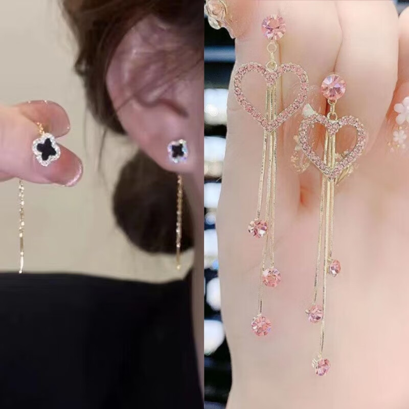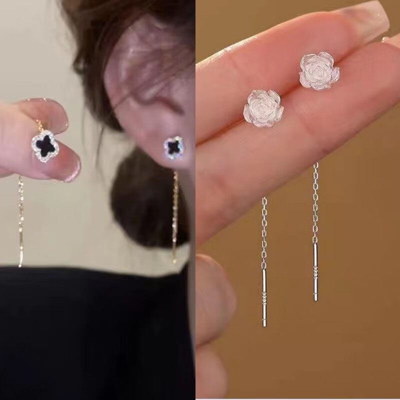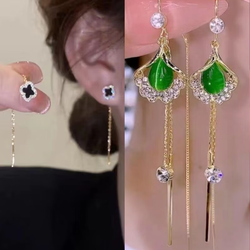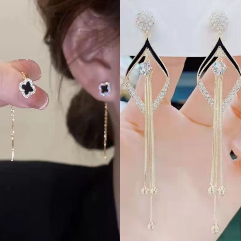 含春花四叶草流苏耳线女感气质耳饰2025年新款网红长款耳坠耳线 A921/A691黑四叶草+银色羽毛
