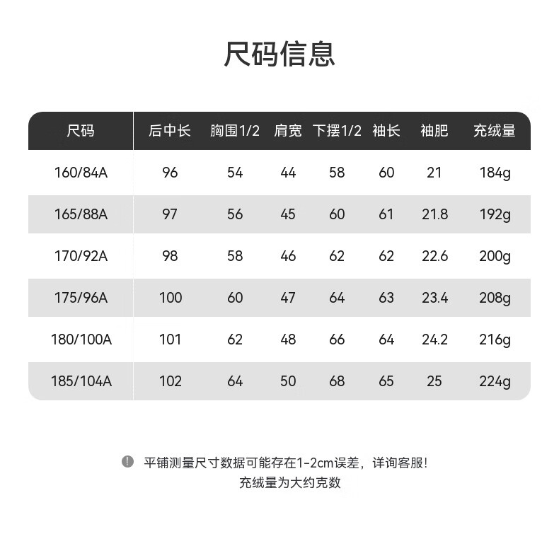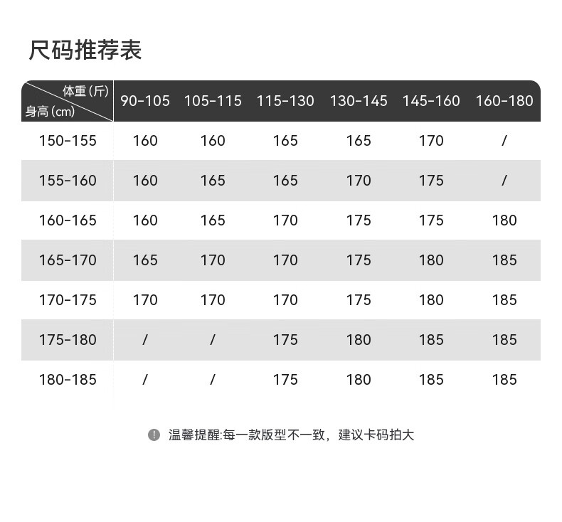 China (cm) 160-165/84-86 165-170 / 88-90 167-172 / 92-96 168-173 / 98-102 170-176 / 106-110