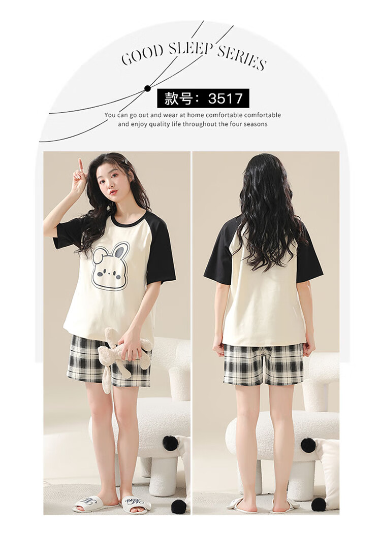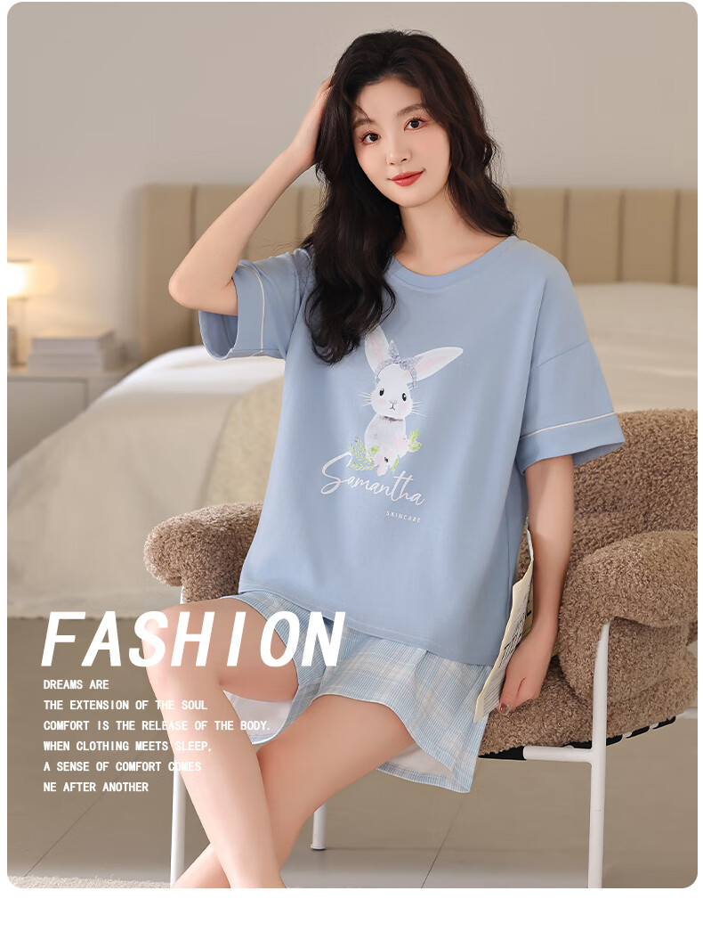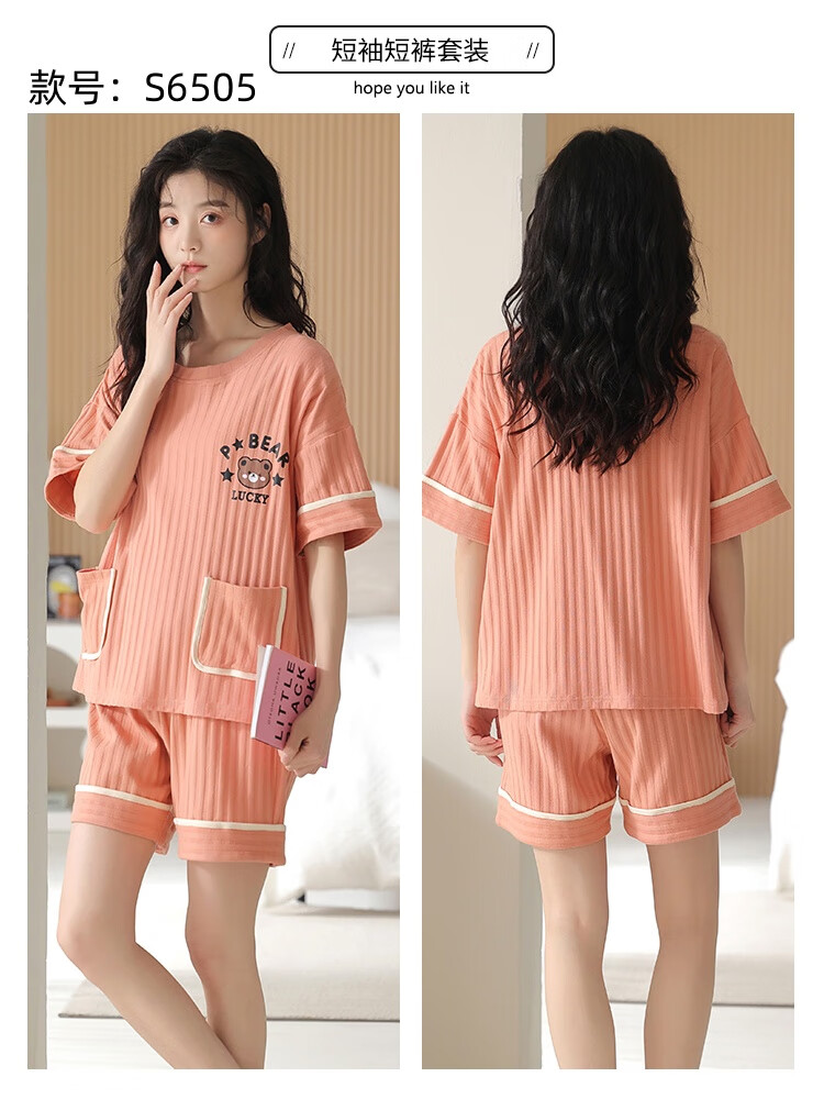 秦暖2025年夏季新款睡衣女高质量棉短袖短裤薄款特大码200斤家居服套 A3519 短裤套装 M 【80-95斤】