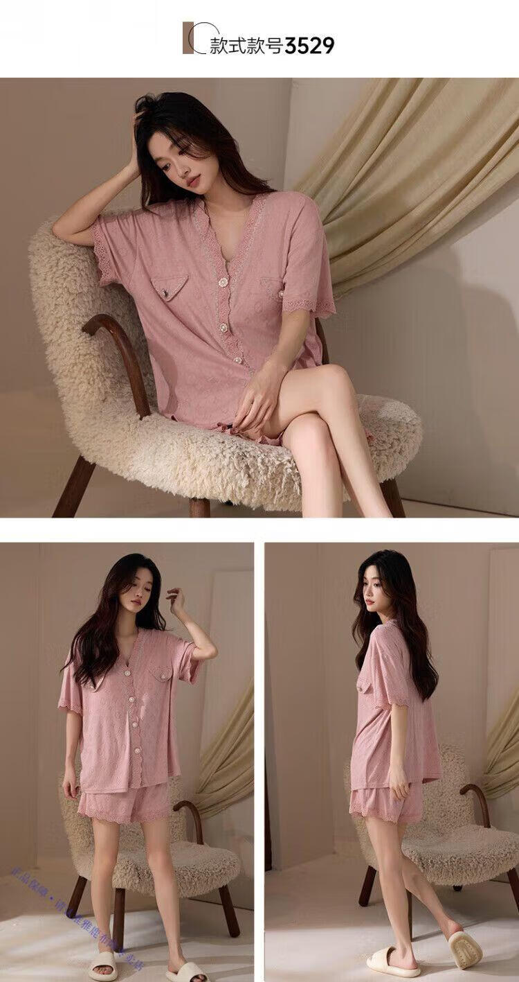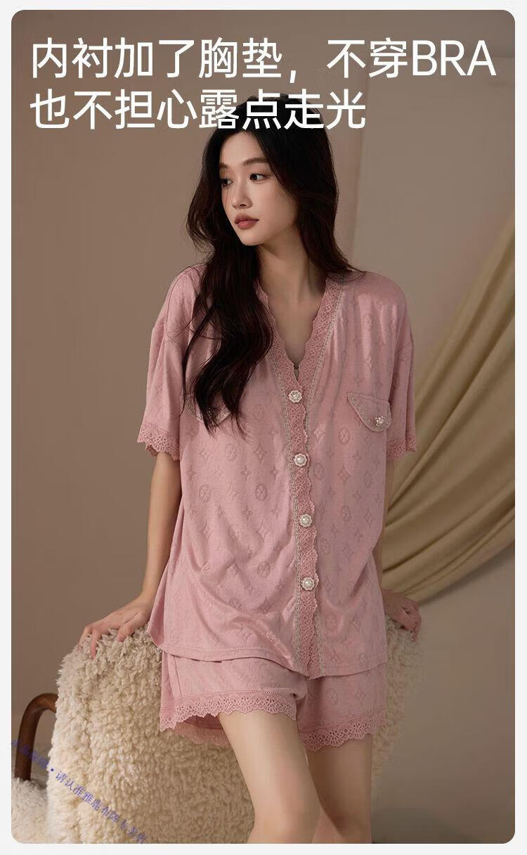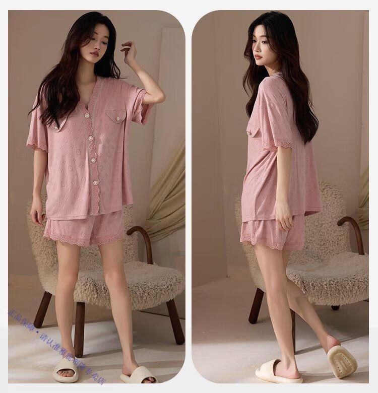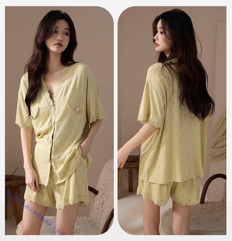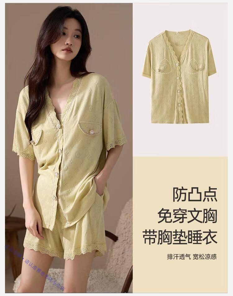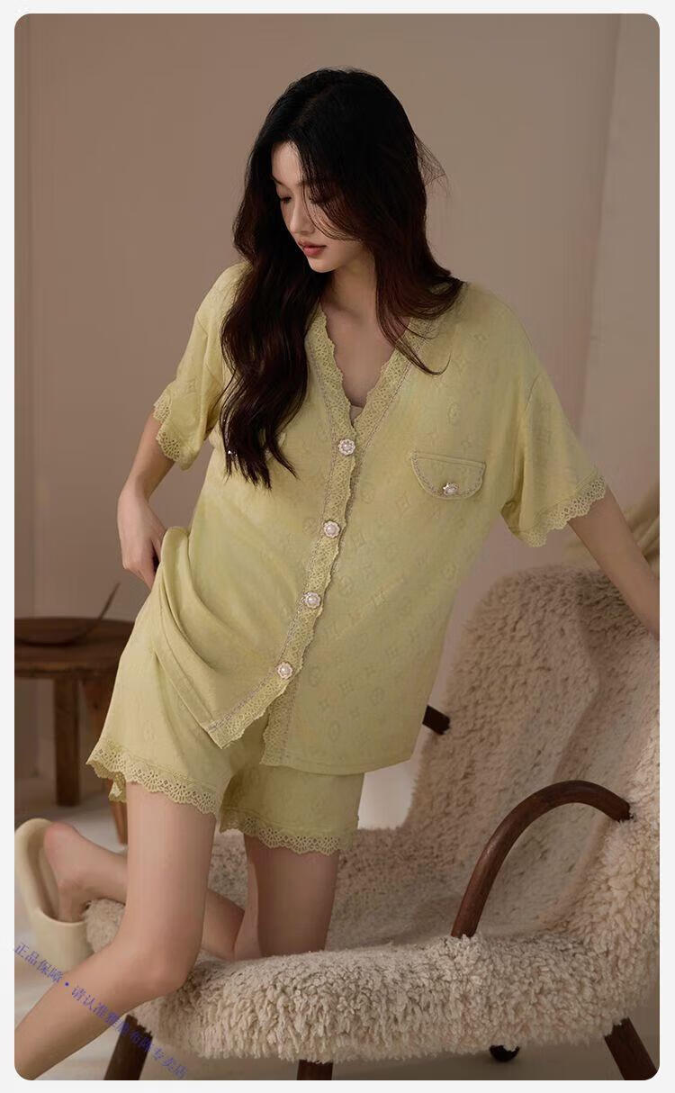 Yalu pajamas for women summer with breast pads Modal short-sleeved shorts lace cardigan loose large size home wear set WX-3527 green with breast pads M 80-100Jin Jin is equal to 0.5 kg
