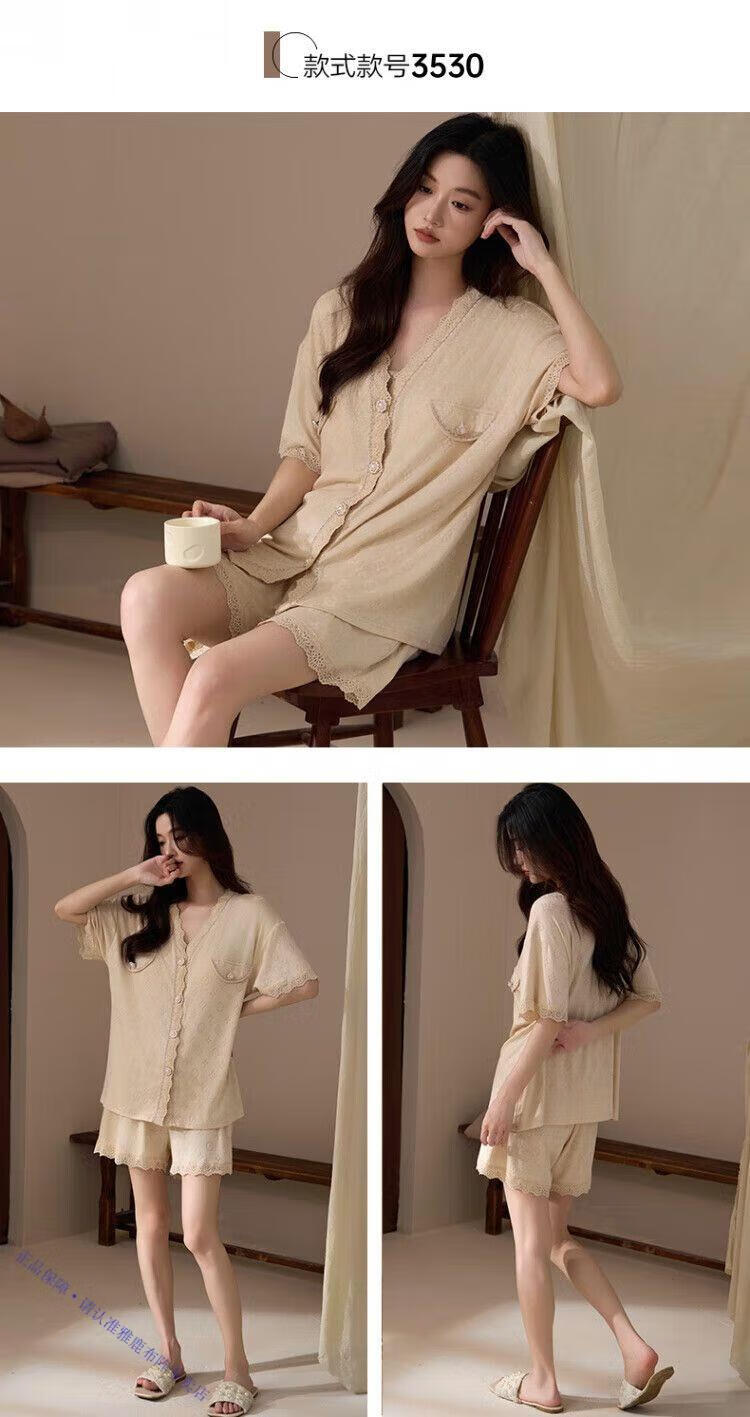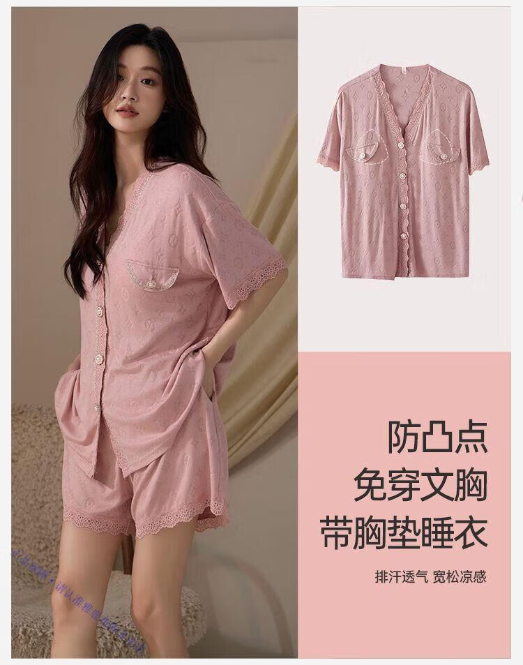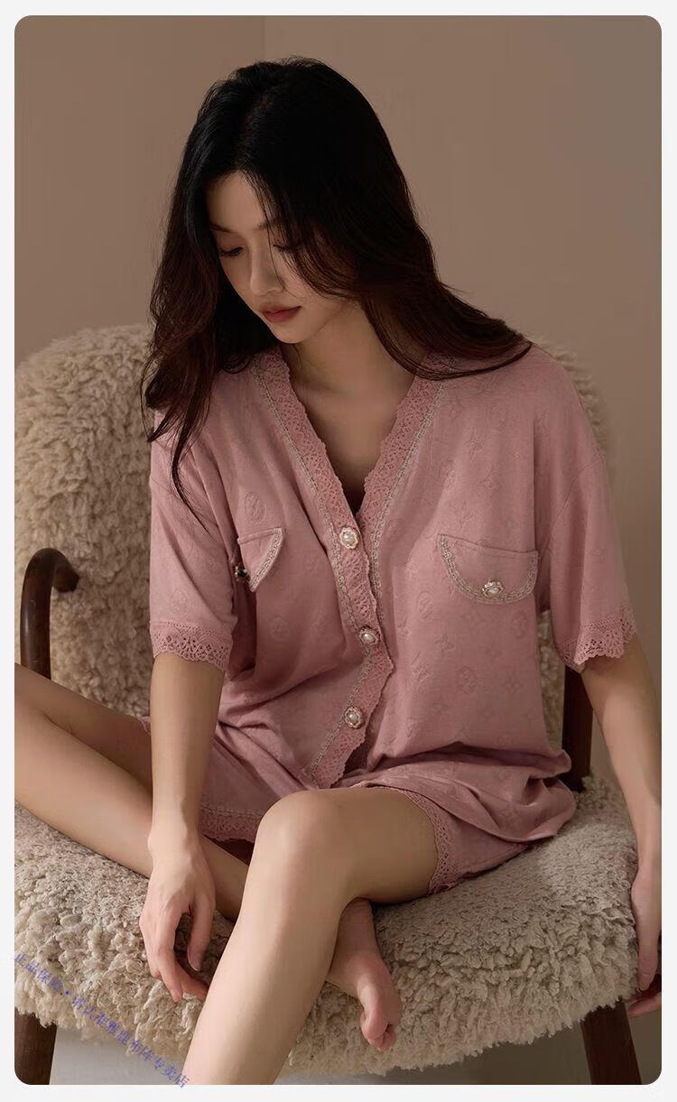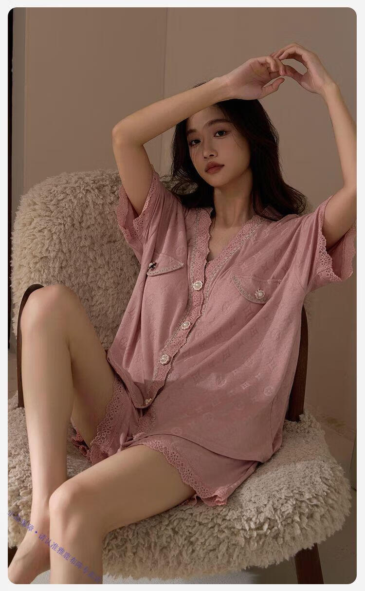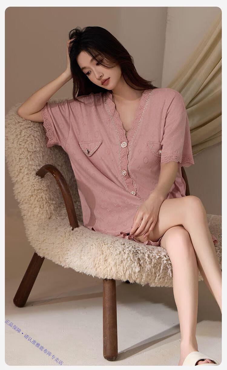 Yalu pajamas for women summer with breast pads Modal short-sleeved shorts lace cardigan loose large size home wear set WX-3527 green with breast pads M 80-100Jin Jin is equal to 0.5 kg