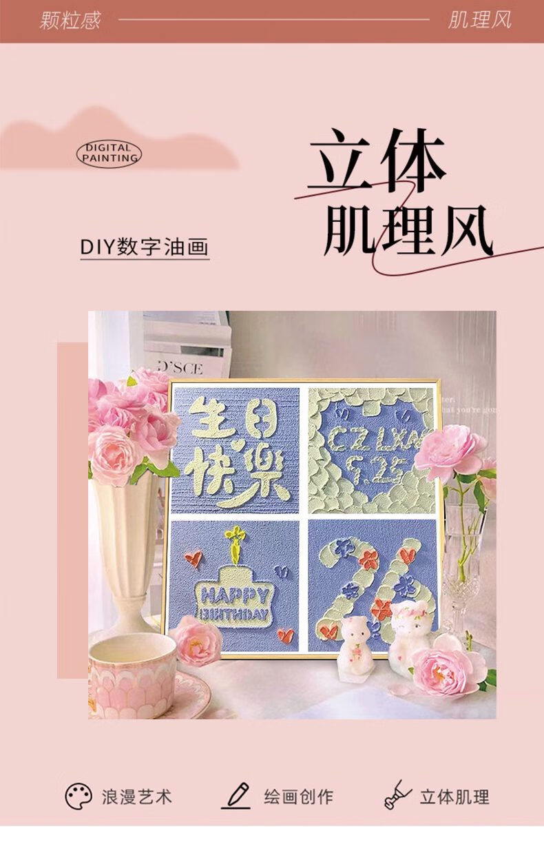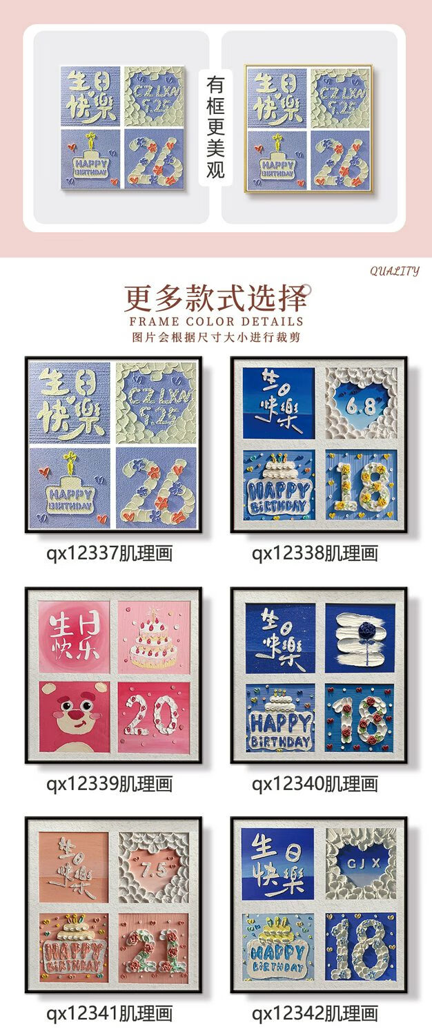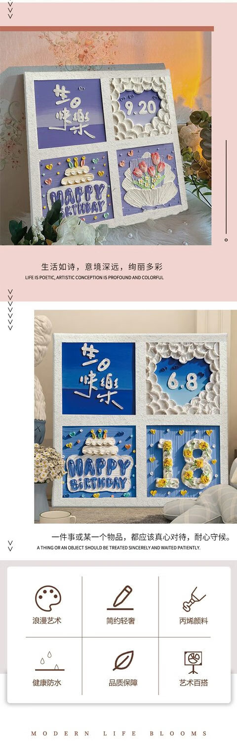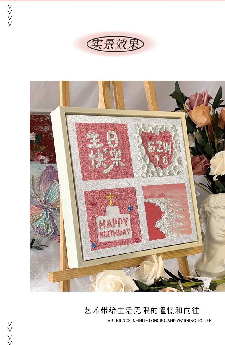 CLCEY生日快乐四宫格肌理画石英砂丙烯diy定制数字油画手工礼物装饰画 qx12350肌理画 20*20cm加厚实木内框小尺寸不好