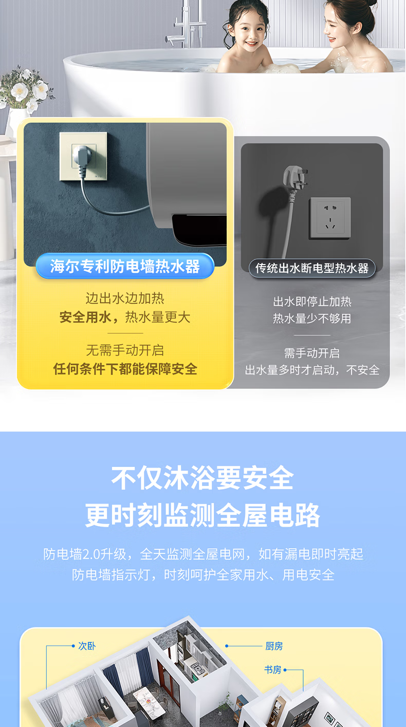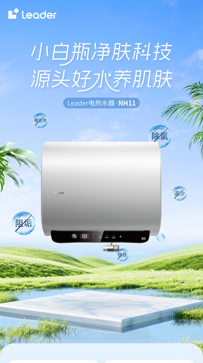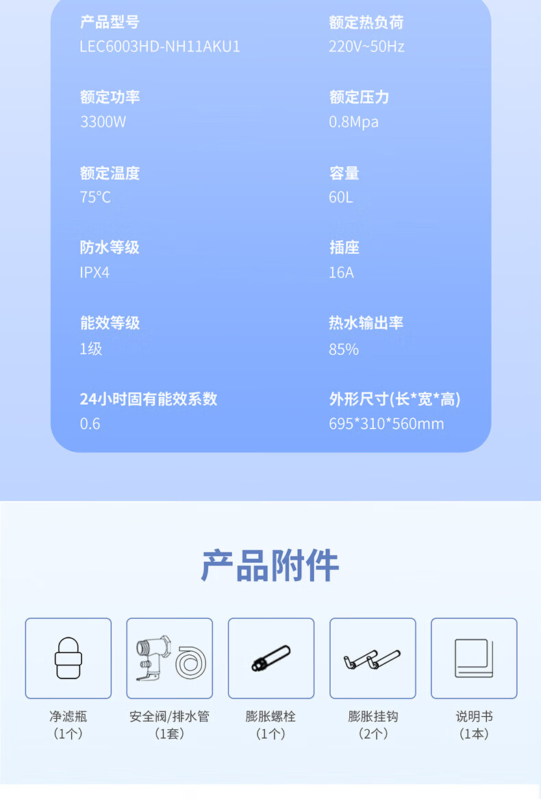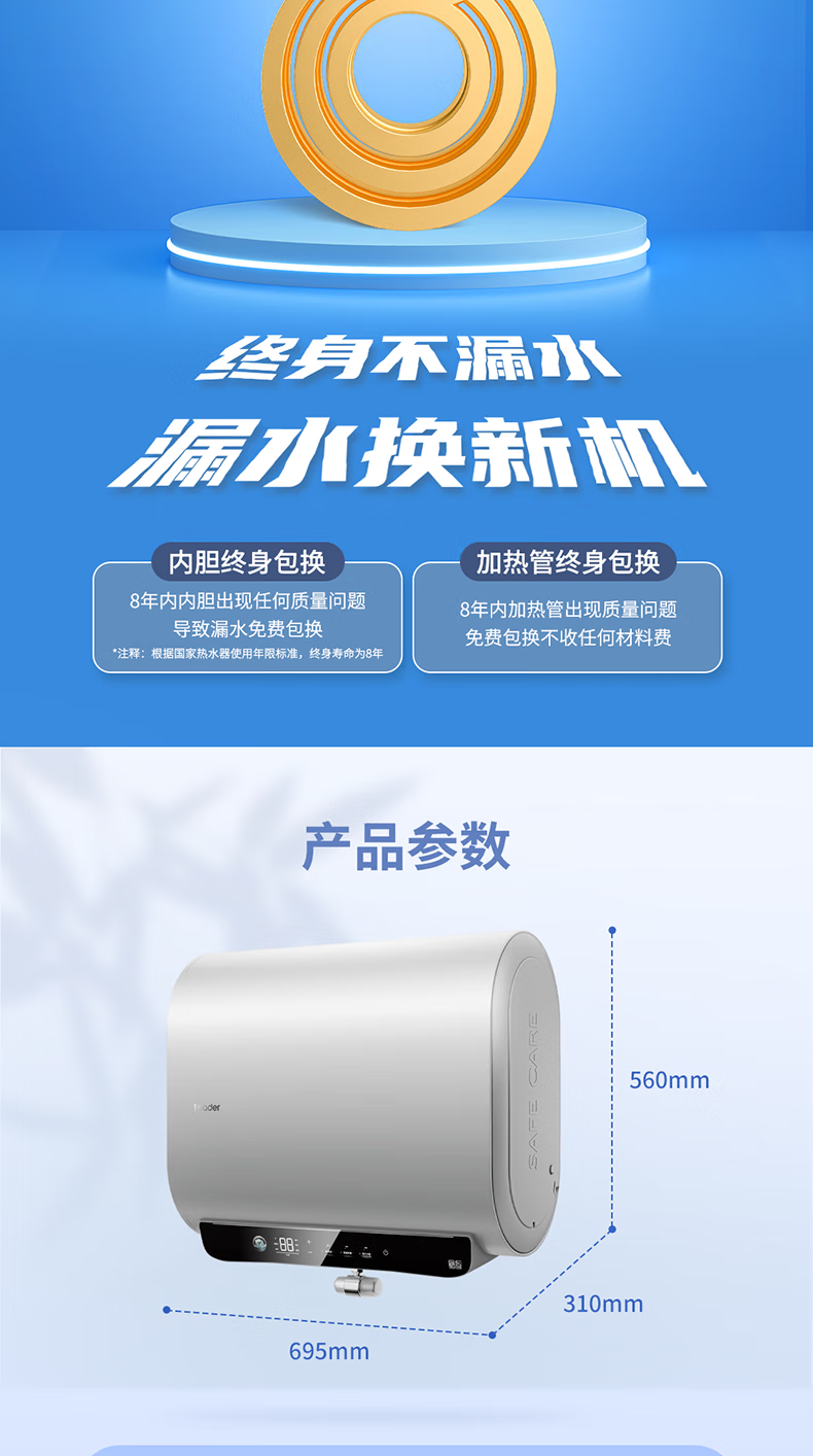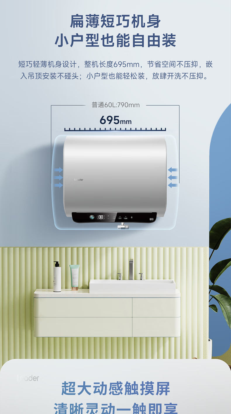 Haier produces Commander 60-liter flat barrel double-gallon electric water heater, small white bottle, small blue bottle, maternal and infant grade skin cleansing wash, first-class energy-saving inner tank, no-wash magnesium rod, no need to replace, short style, fast heating NH11 60L 2200W 695 short style/large water volume/anti-scale purifying water wash