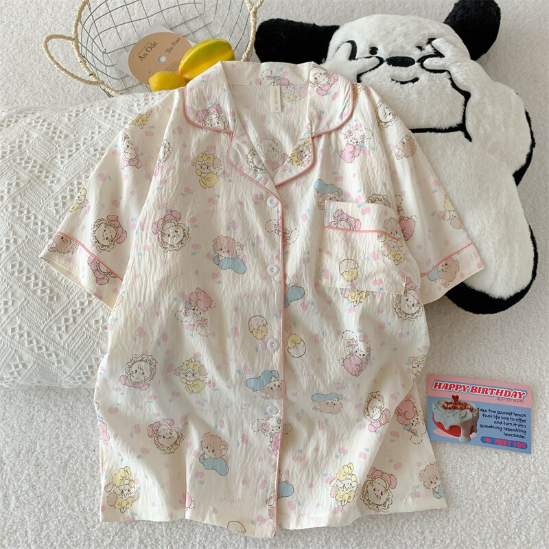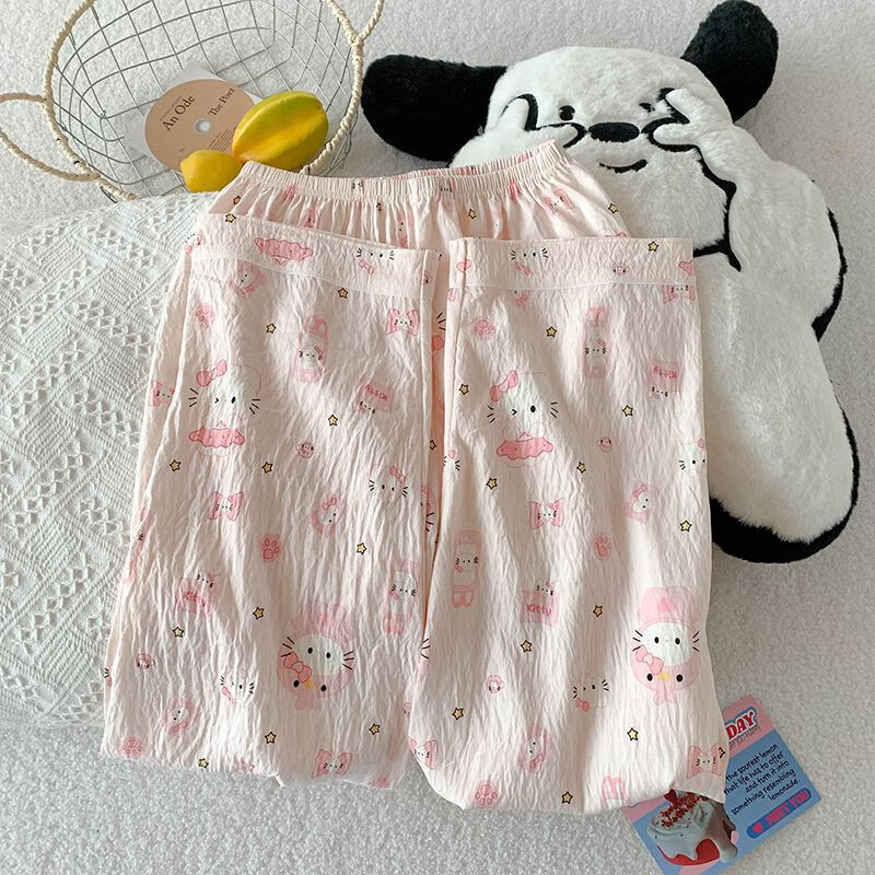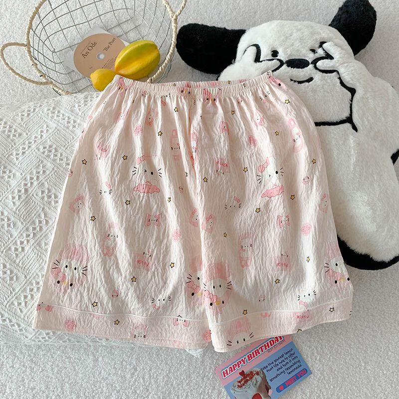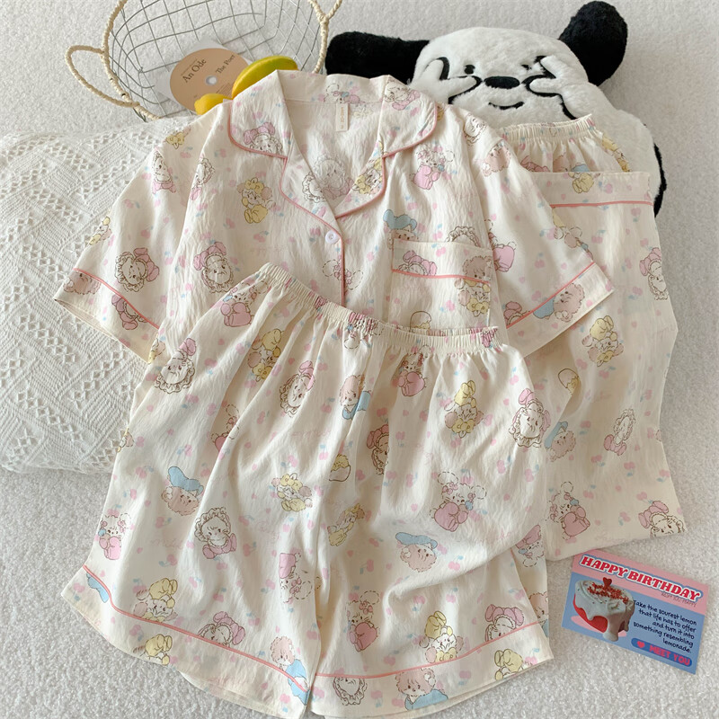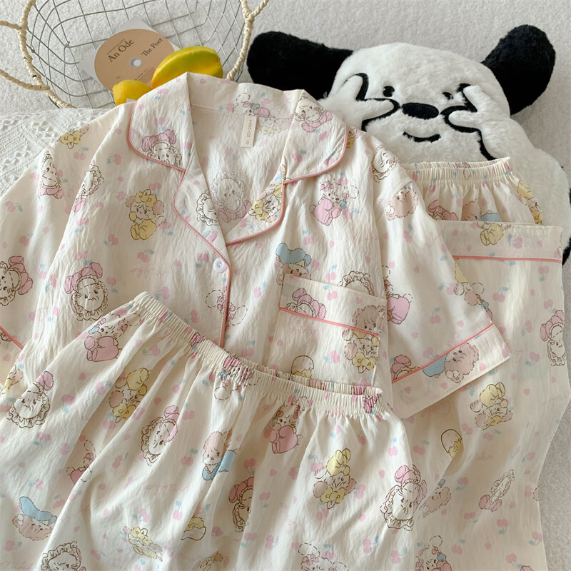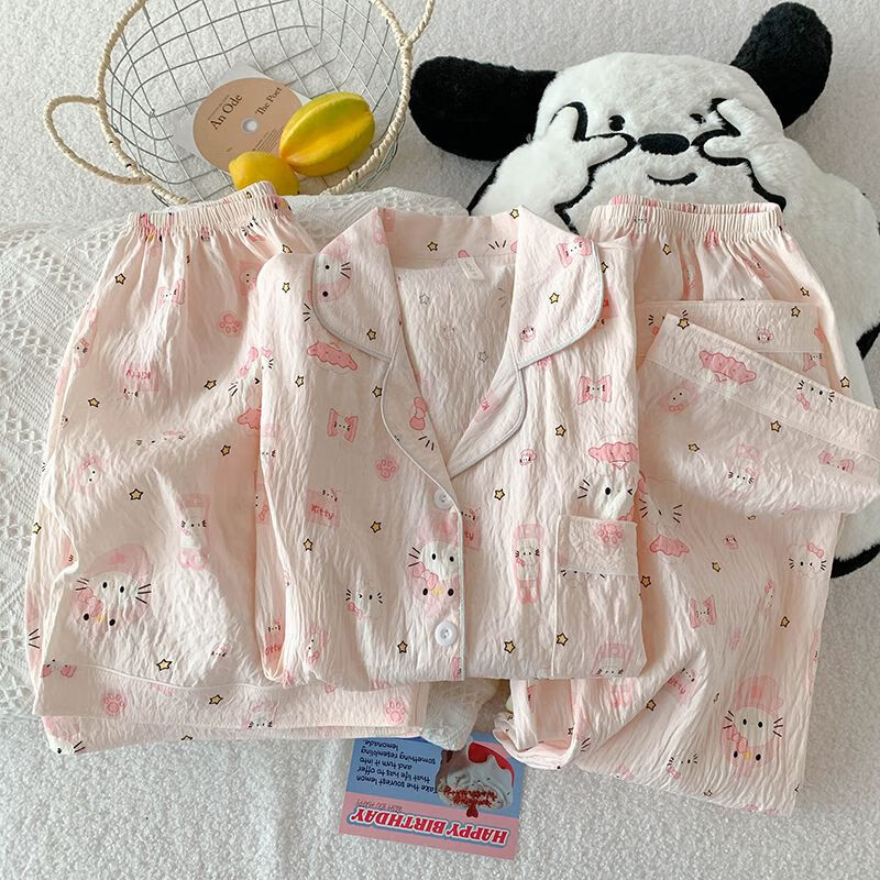Mobeihai Pajamas Women Summer Short Sleeve Shorts Long Pants Three-piece Set Home Clothes Thin Can Be Weared Out Cartoon Student Girl Set 9902 Light Pink Star KT Cat Three-piece Set M