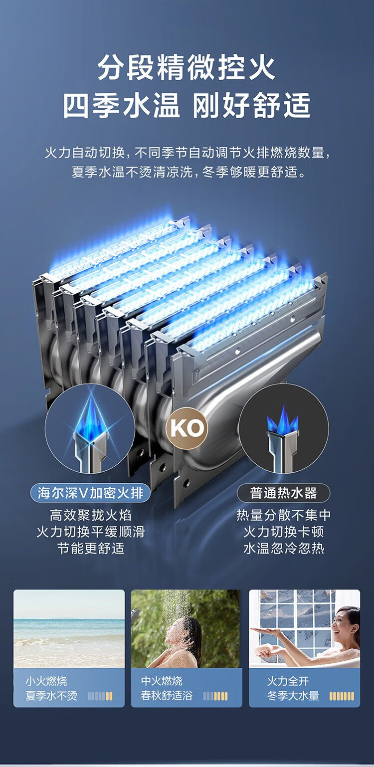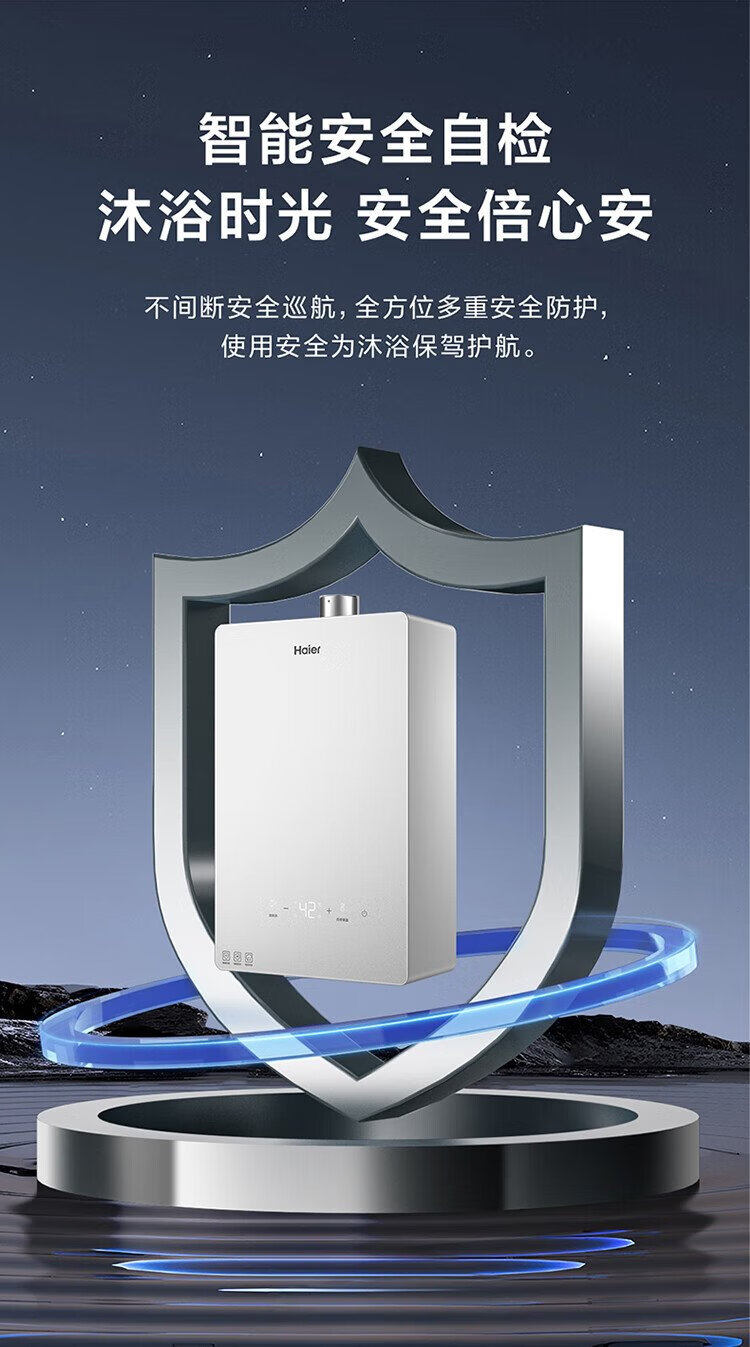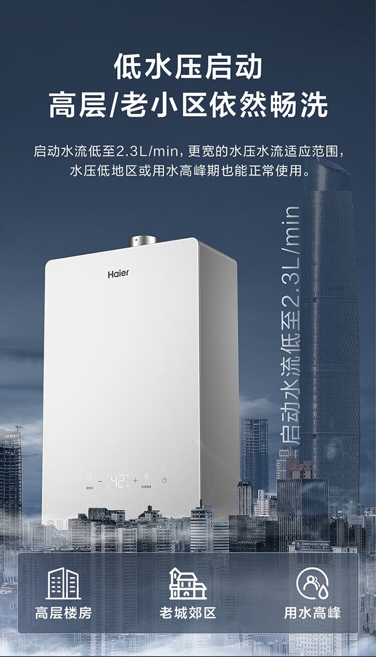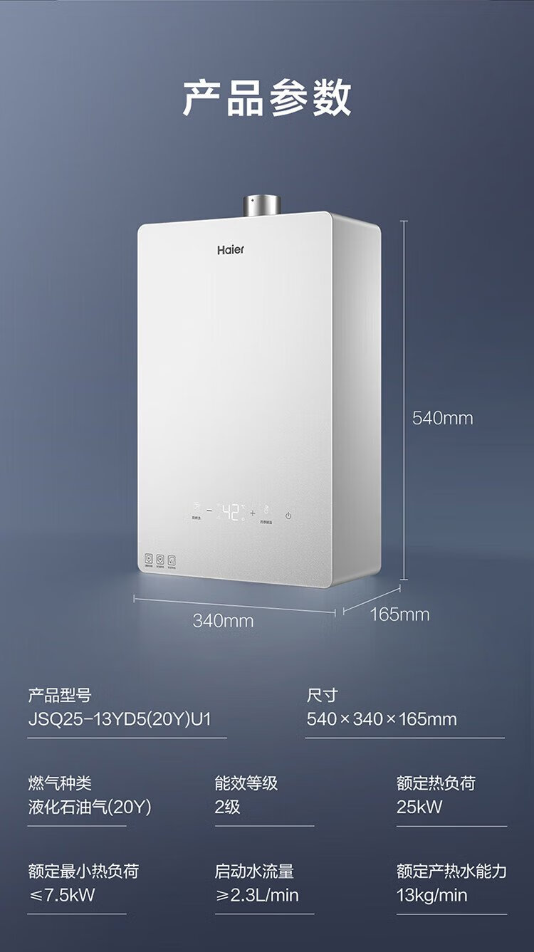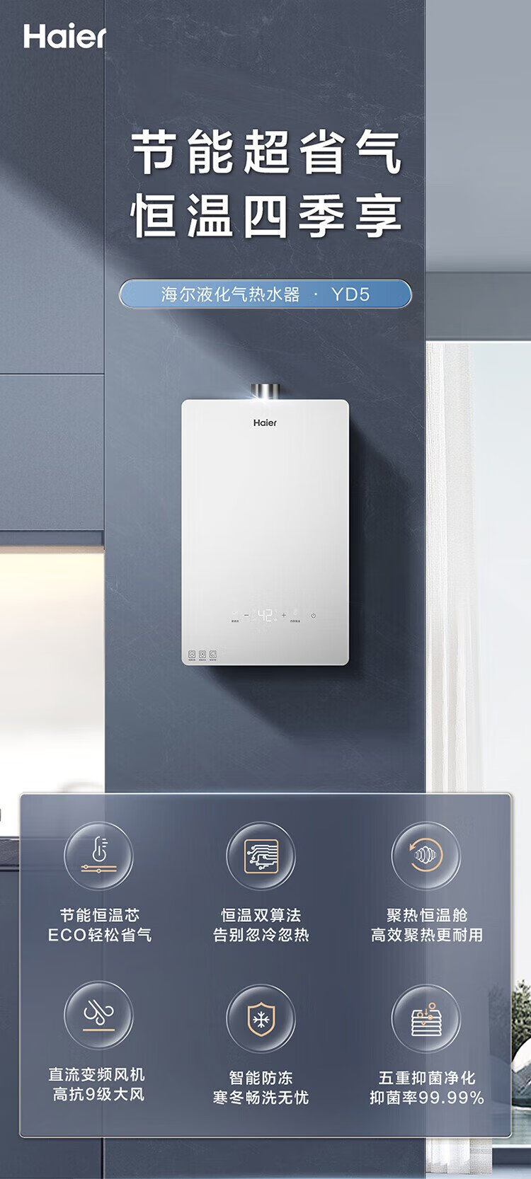 Haier YD5 13-liter liquefied gas water heater for home use, ECO energy saving, low water pressure start, fast heating and silent, 15% national subsidy, trade-in, wind resistance and anti-freeze