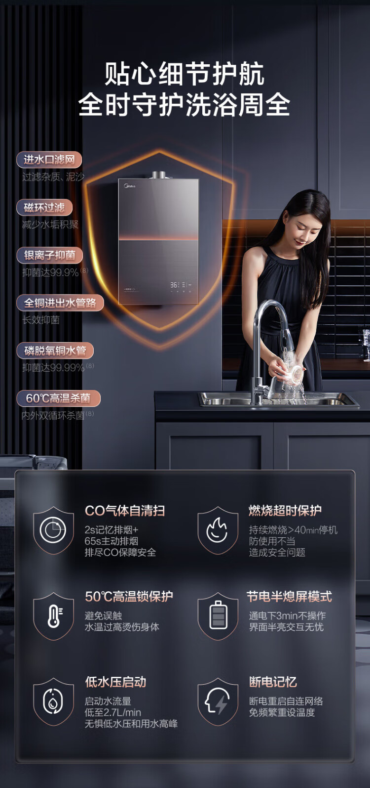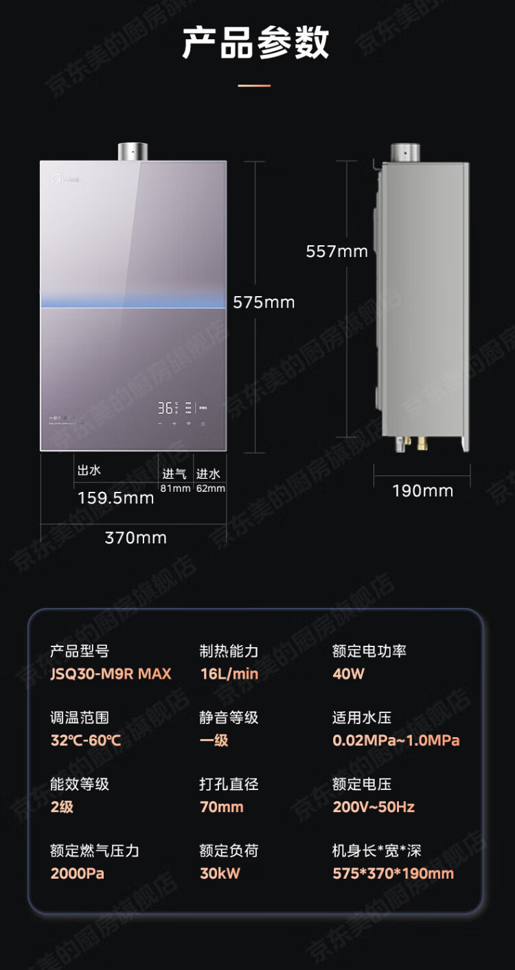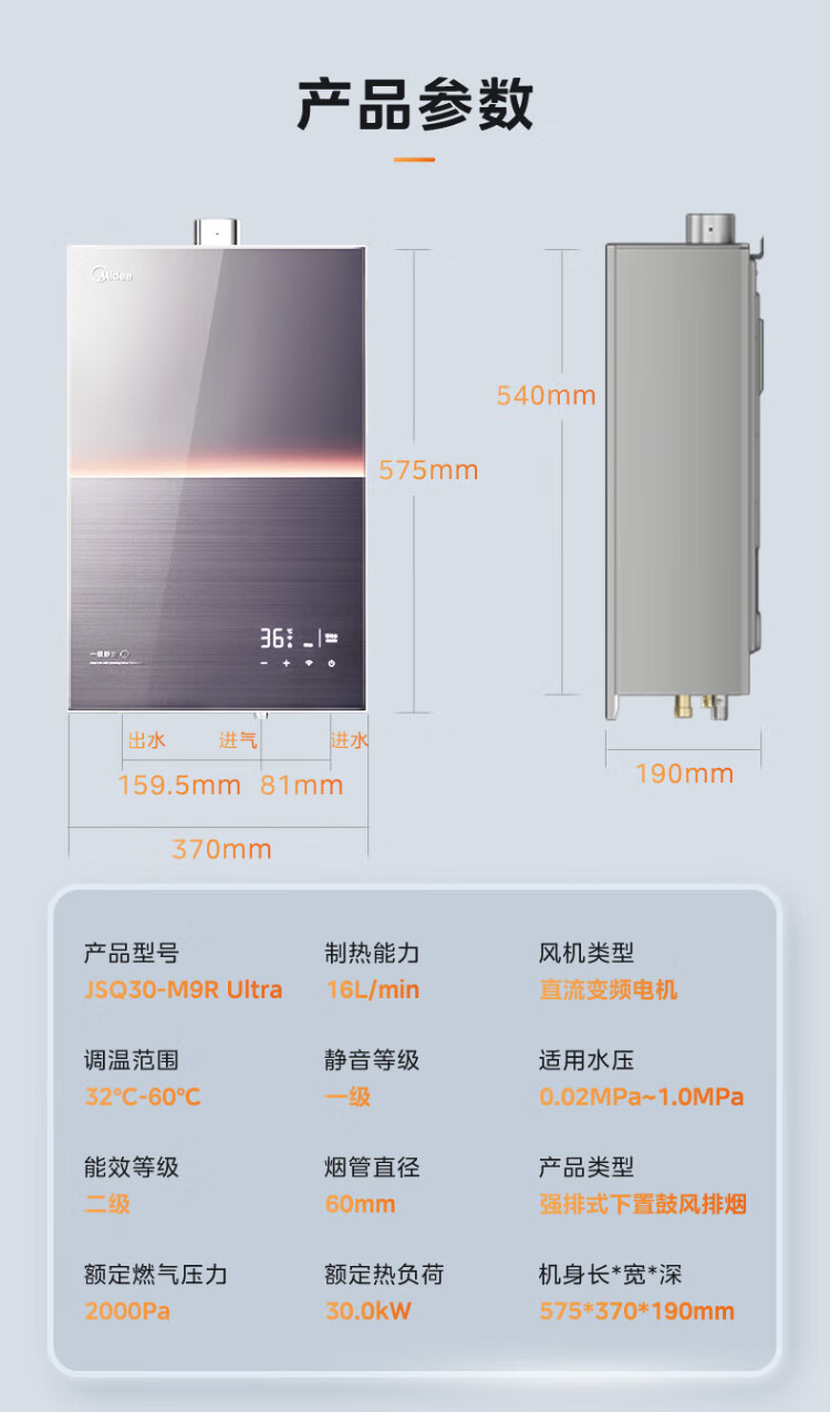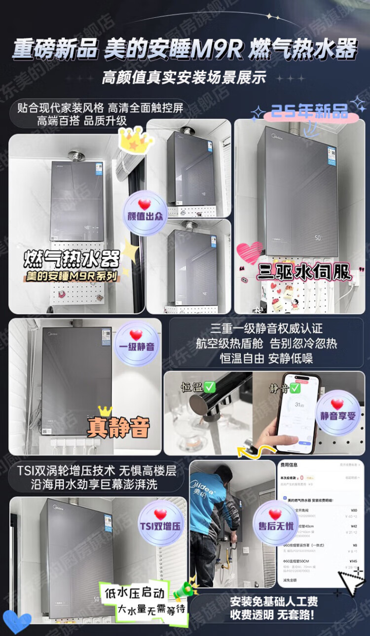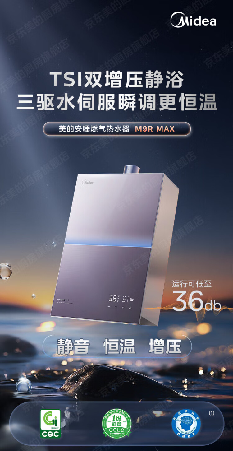 Midea's new product M9RMax gas water heater TSI dual supercharger, three-wheel drive water servo, first-level silent 16-liter natural gas under-mounted fan ECO energy saving, sleep series zero cold feeling 16L TSI dual supercharger M9R Max